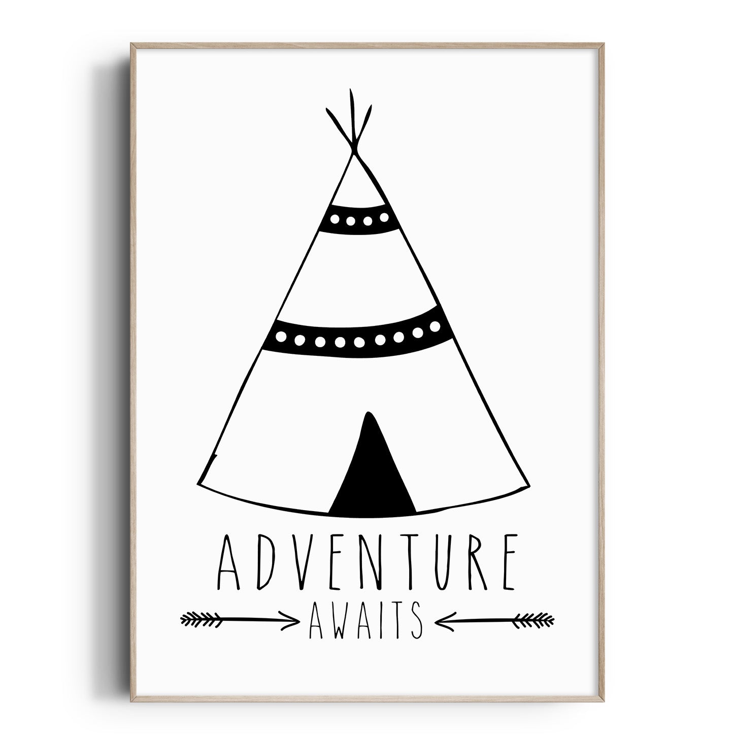 Monochrome Adventure Awaits Tribal Teepee Nursery or Bedroom Wall Art Print