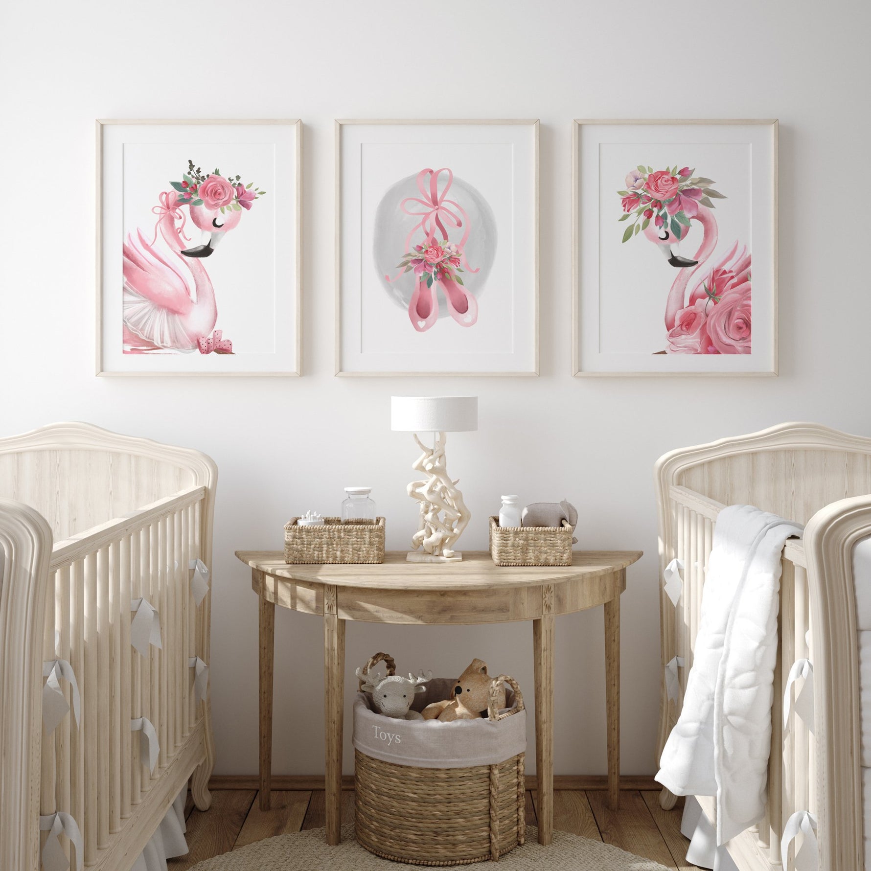 A set of three watercolour, ballet inspired nursery wall art prints, featuring two floral flamingos in tutu's and a pointe shoes print. A perfect new baby gift or add the finishing touches your own little girls bedroom or playroom decor.