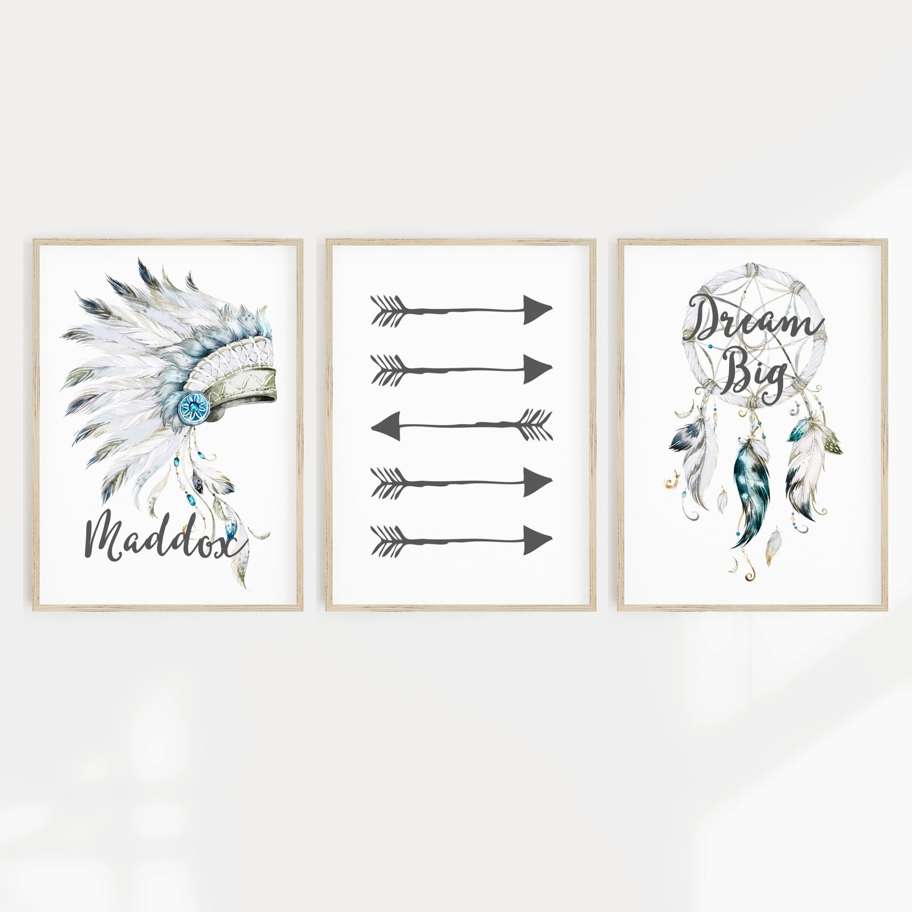 Our very popular boys tribal boho wall art print set. Featuring three prints, a personalised tribal headdress, Dream Big dreamcatcher, and grey tribal arrows, perfect for the modern tribal nursery or bedroom.