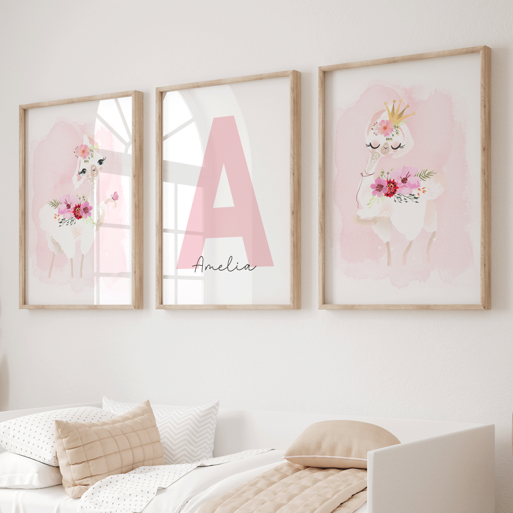A set of 3 prints, featuring two floral llamas and a personalised name & letter print. Perfect for the llama, boho or animal themed nursery decor.