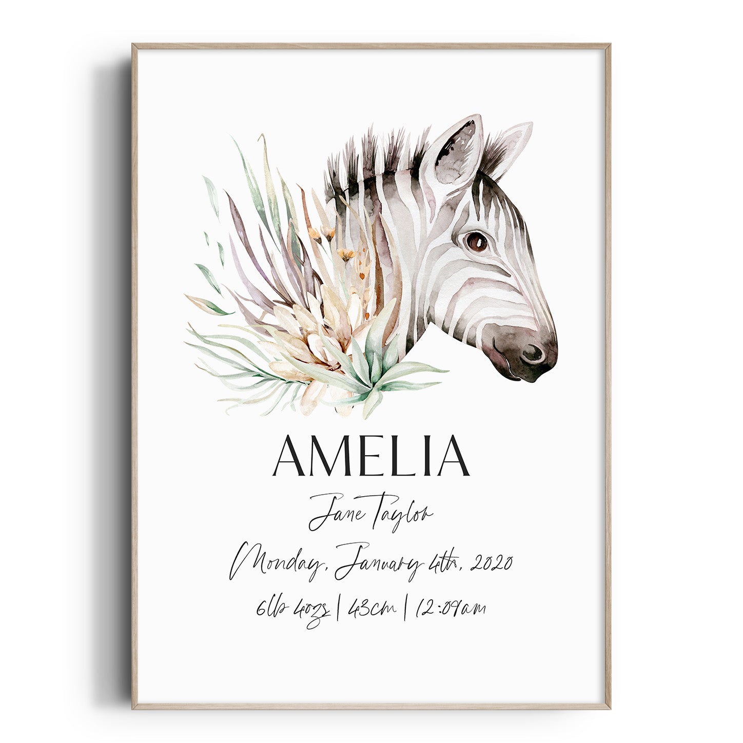 Unit price perA watercolour zebra surrounded with savanna greenery and personalised with your child's birth details, perfect for the safari inspired nursery. A beautiful new baby gift, or a great way to add the finishing touches to your own child's space.