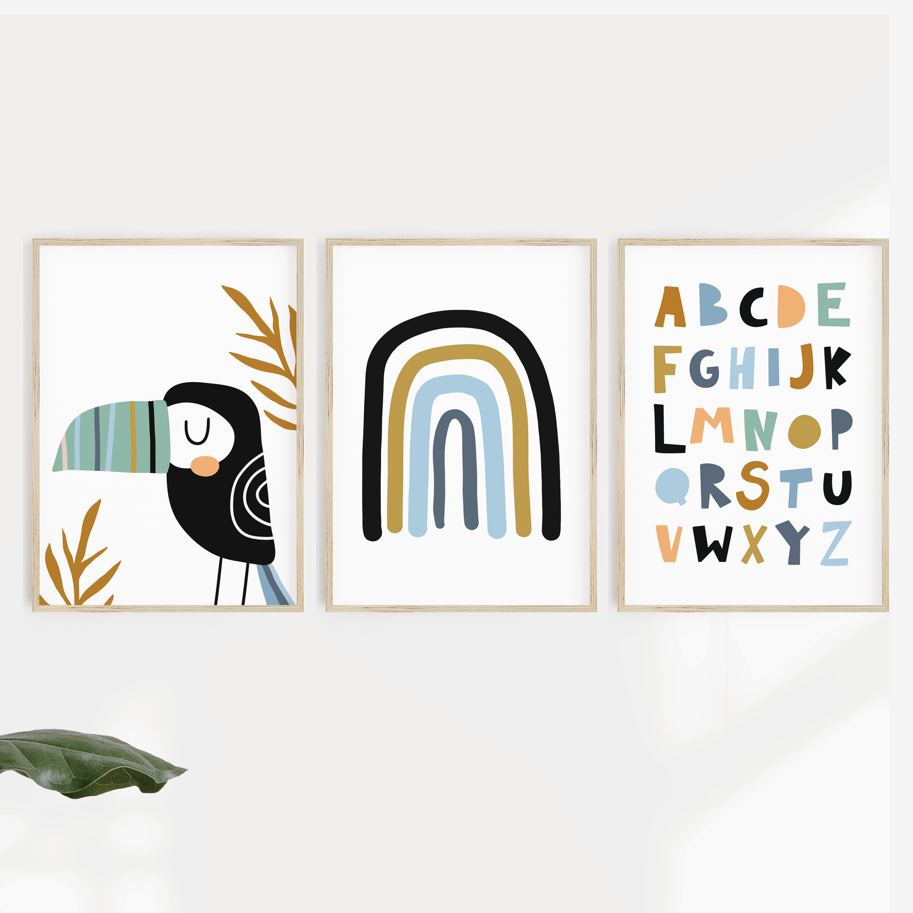 A  set of three scandi, inspired kids nursery or bedroom wall art prints, featuring  tropical toucan, rainbow and alphabet prints.