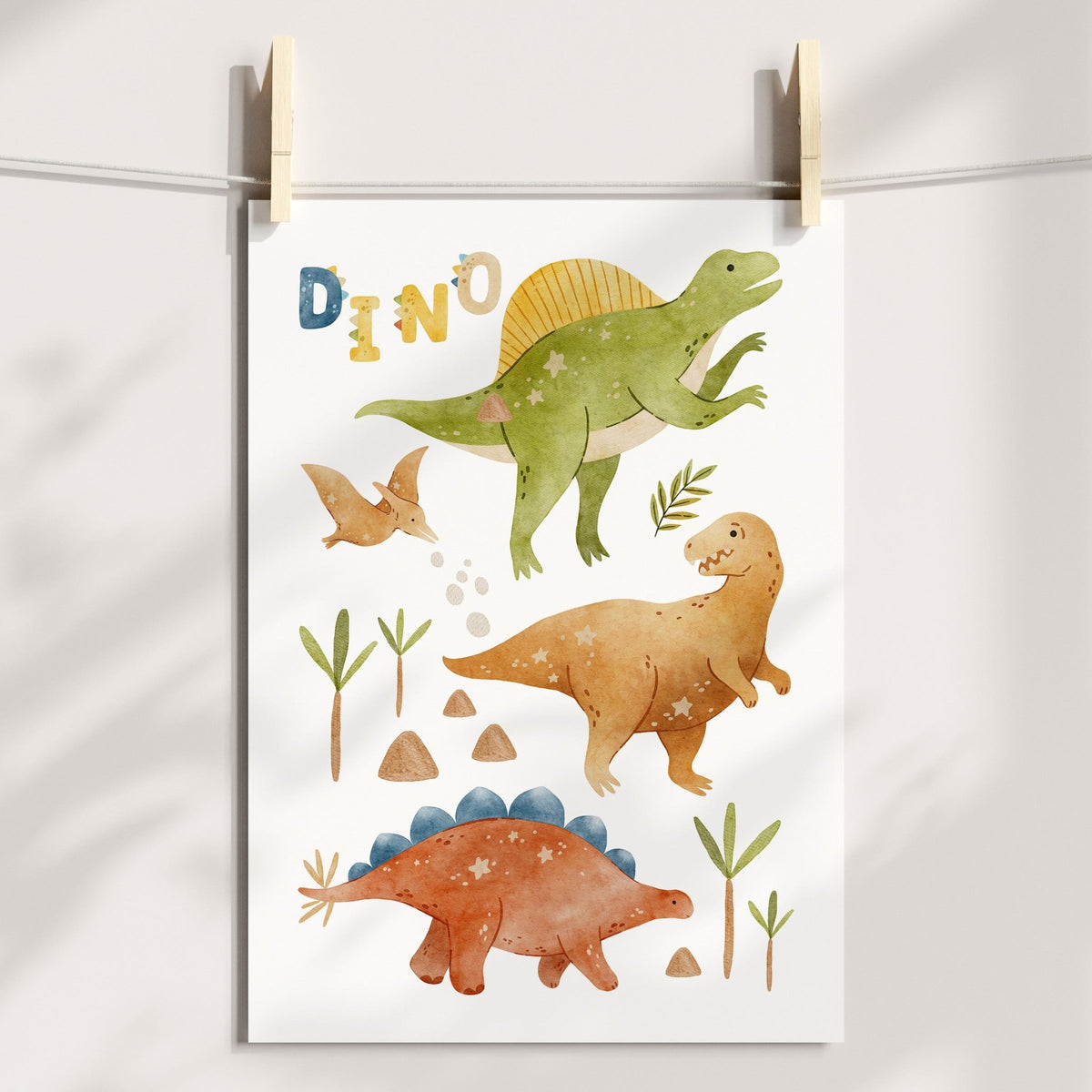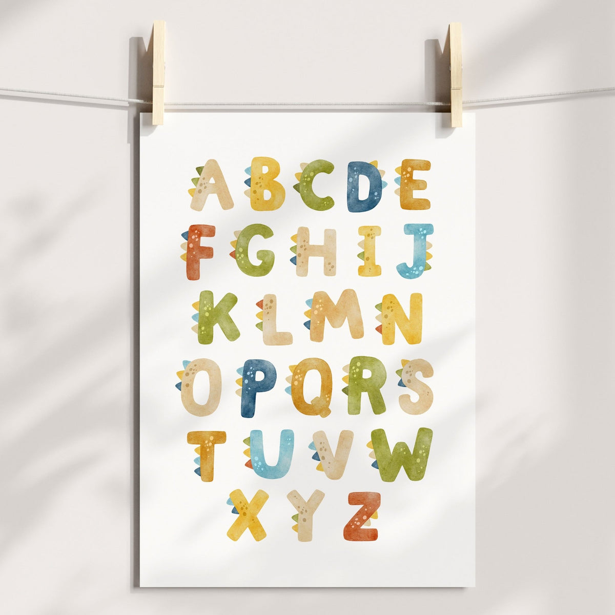 A set of three prints featuring prehistoric dinosaurs and a watercolour alphabet print. A perfect new baby boy gift, or a great way to add the finishing touches to your own child's nursery, playroom or bedroom decor.