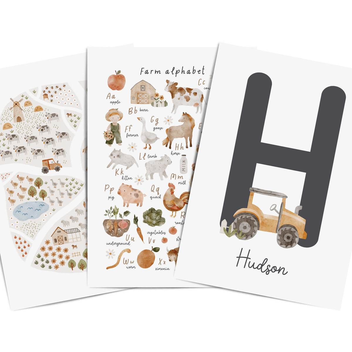 This On The Farm Wall Art set is the ideal way to brighten up your little one's bedroom, playroom or nursery! The playful design features a farm alphabet, map and personalised tractor name & initial print.