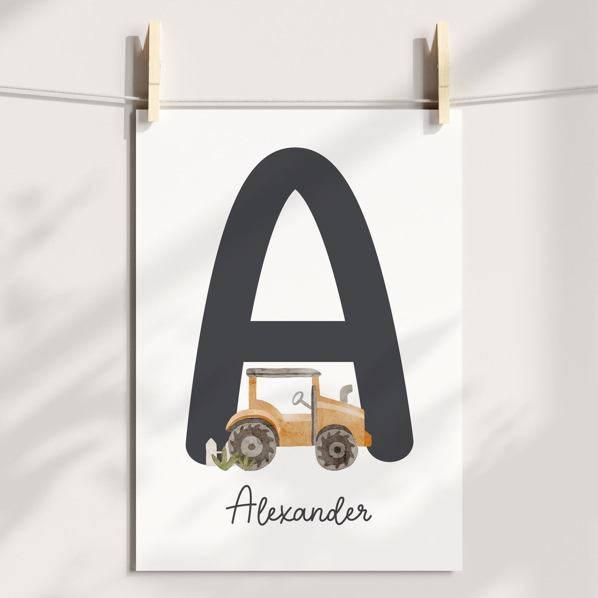 This On The Farm Wall Art set is the ideal way to brighten up your little one's bedroom, playroom or nursery! The playful design features an alphabet, numbers and personalised tractor name & initial print.