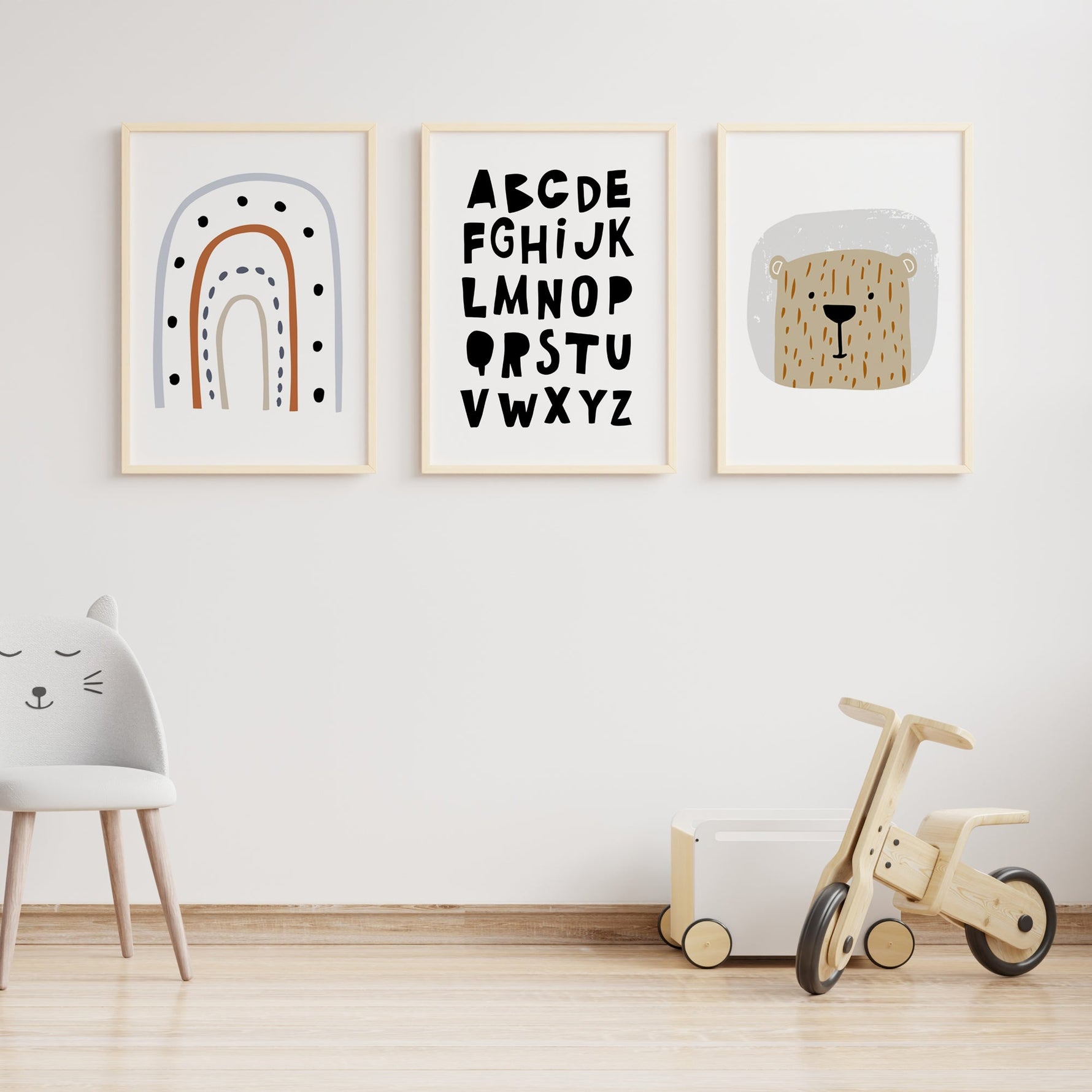 A set of three prints featuring a forest bear, a rainbow and an alphabet print in your colour choice. A perfect new baby boy gift, or a great way to add the finishing touches to your own child's nursery, playroom or bedroom space.