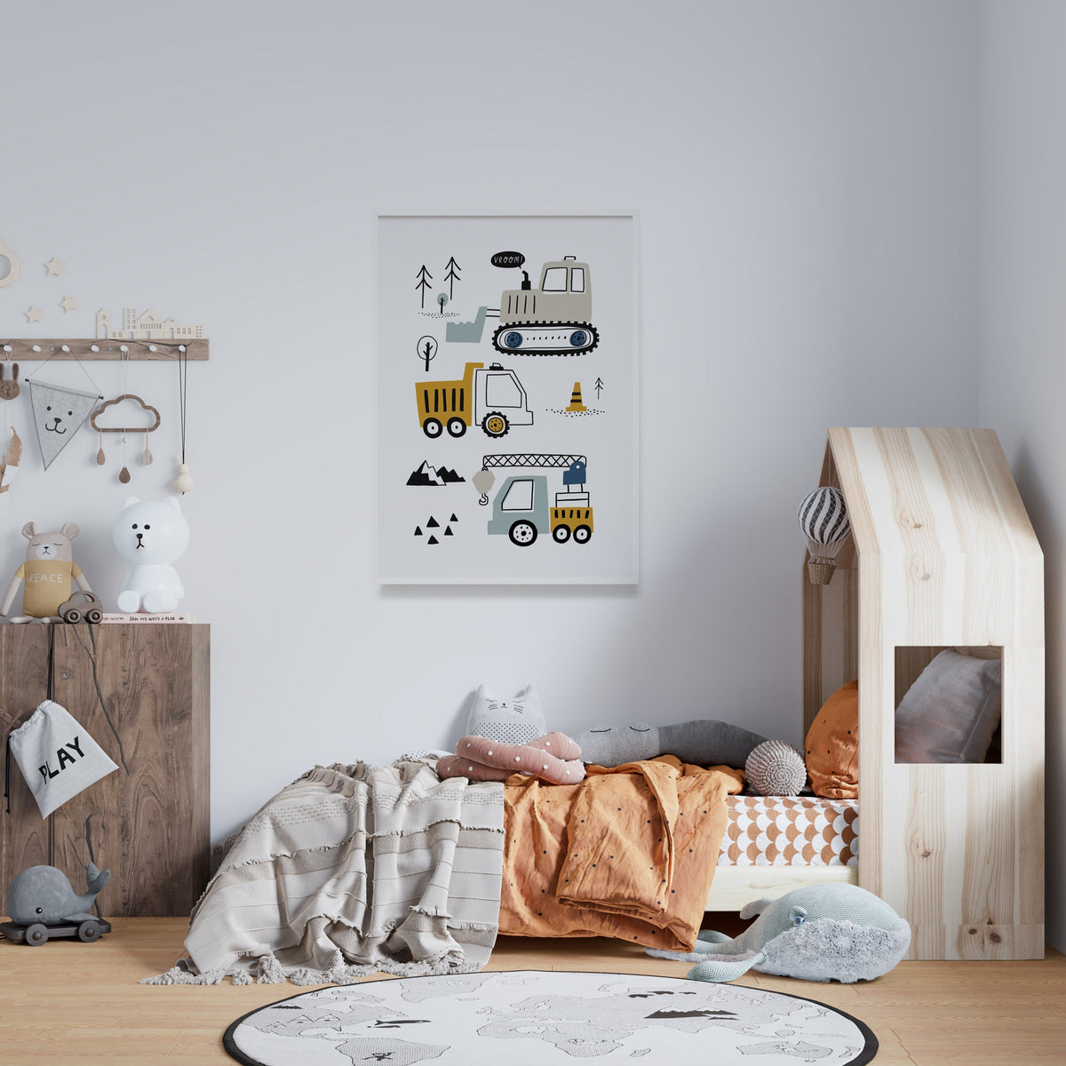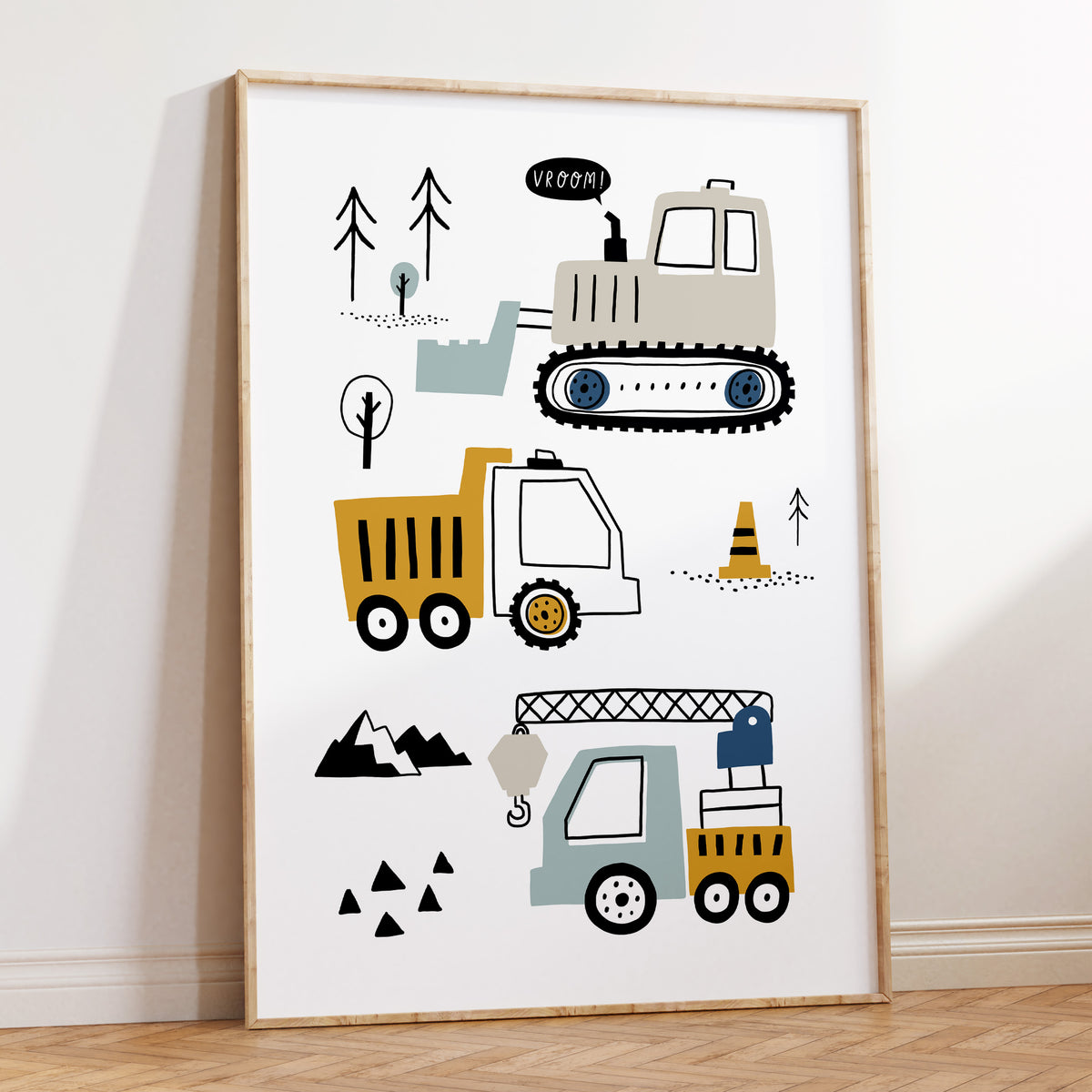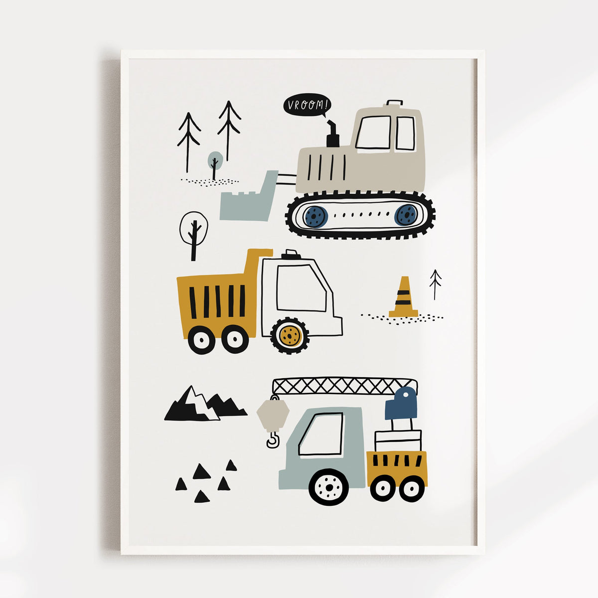 Unit price perThis fun truck construction vehicle art print, featuring a bull dozer, tipper truck, & crane makes a perfect new baby boy gift, or a great way to add the finishing touches to your own child's nursery or bedroom space.