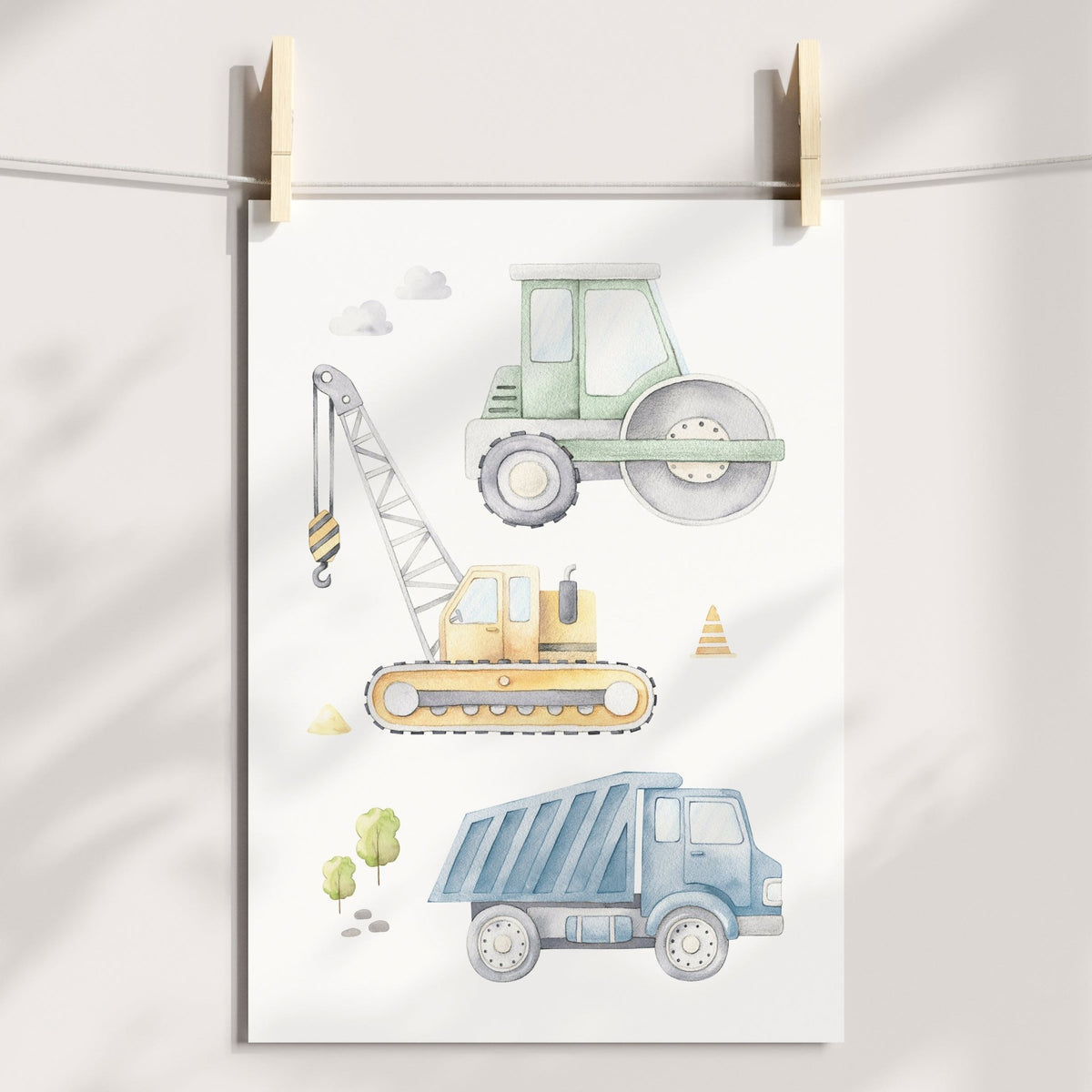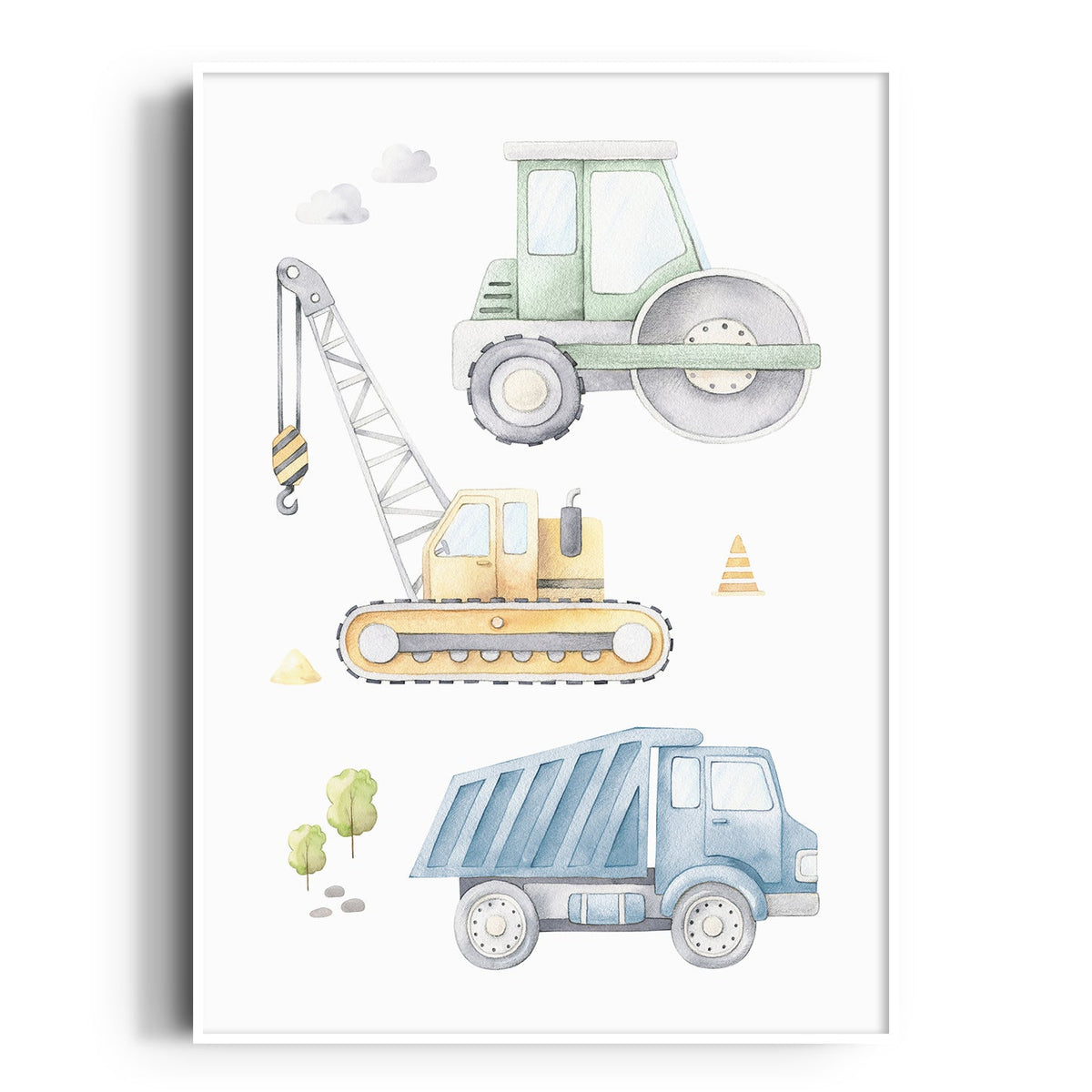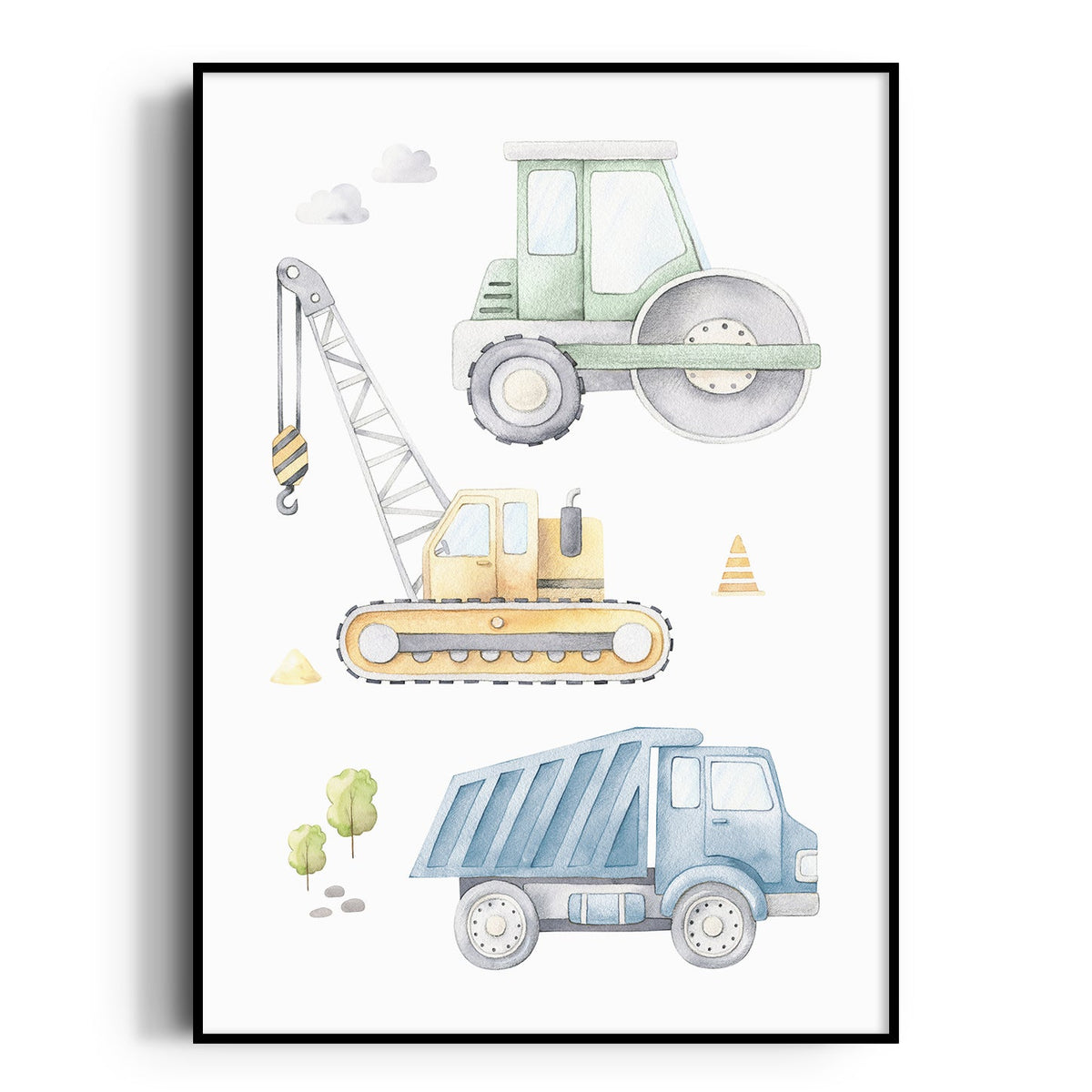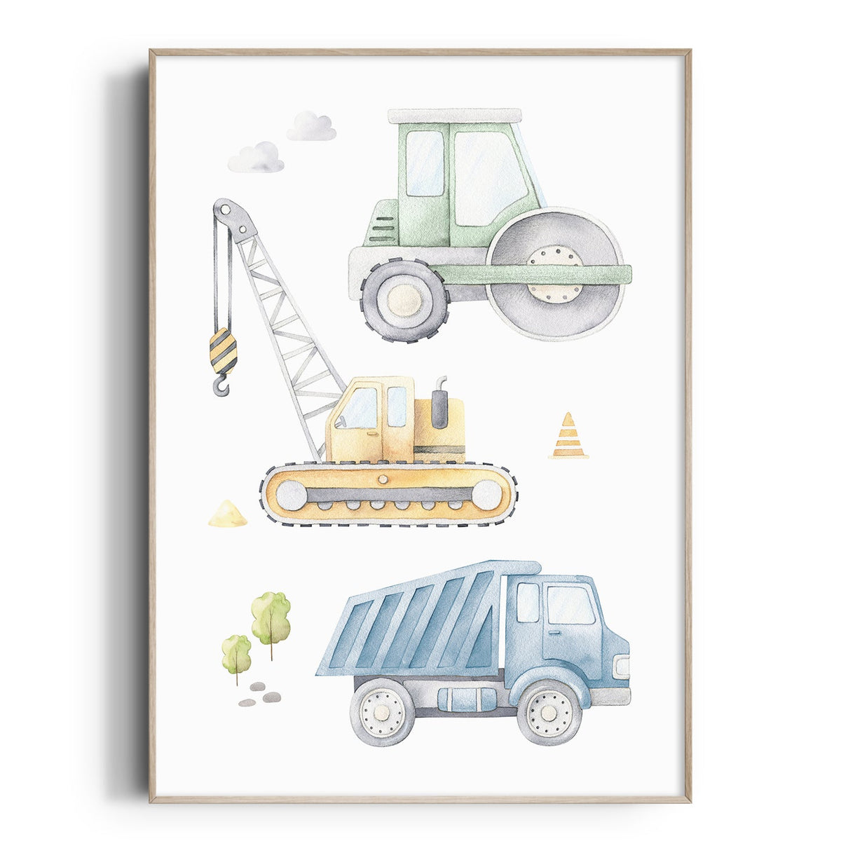 Unit price perThis fun truck construction vehicle art print, featuring a crane, tipper truck, & roller makes a perfect new baby boy gift, or a great way to add the finishing touches to your own child's nursery or bedroom space.
