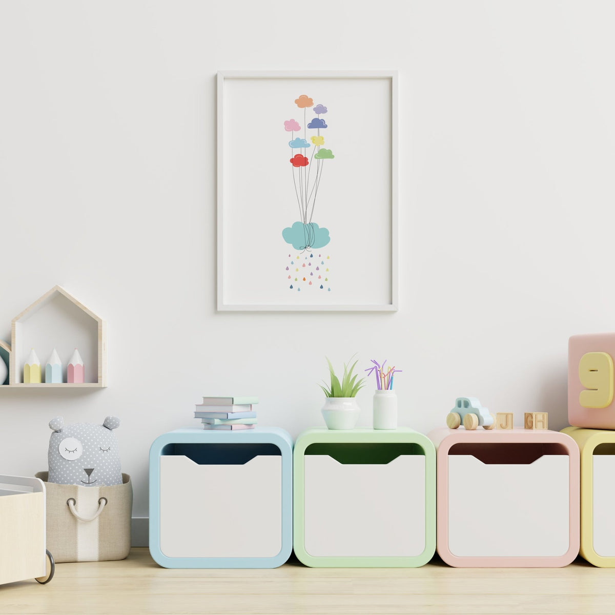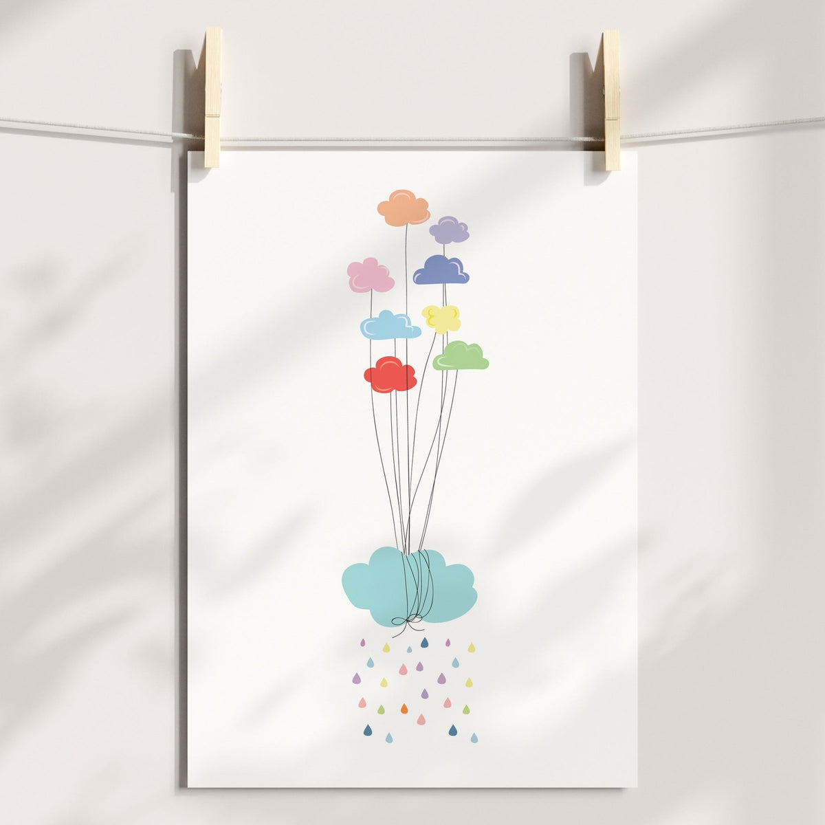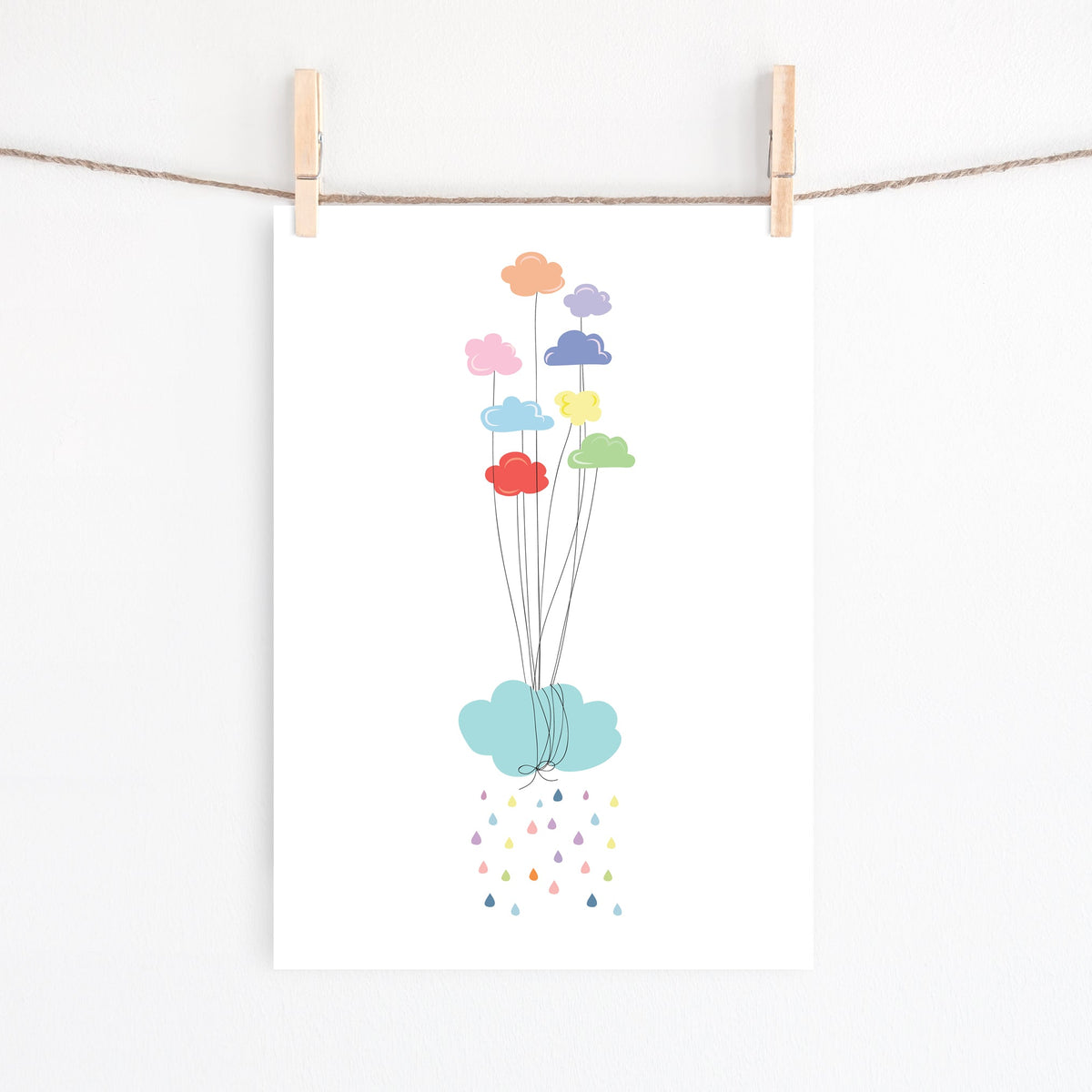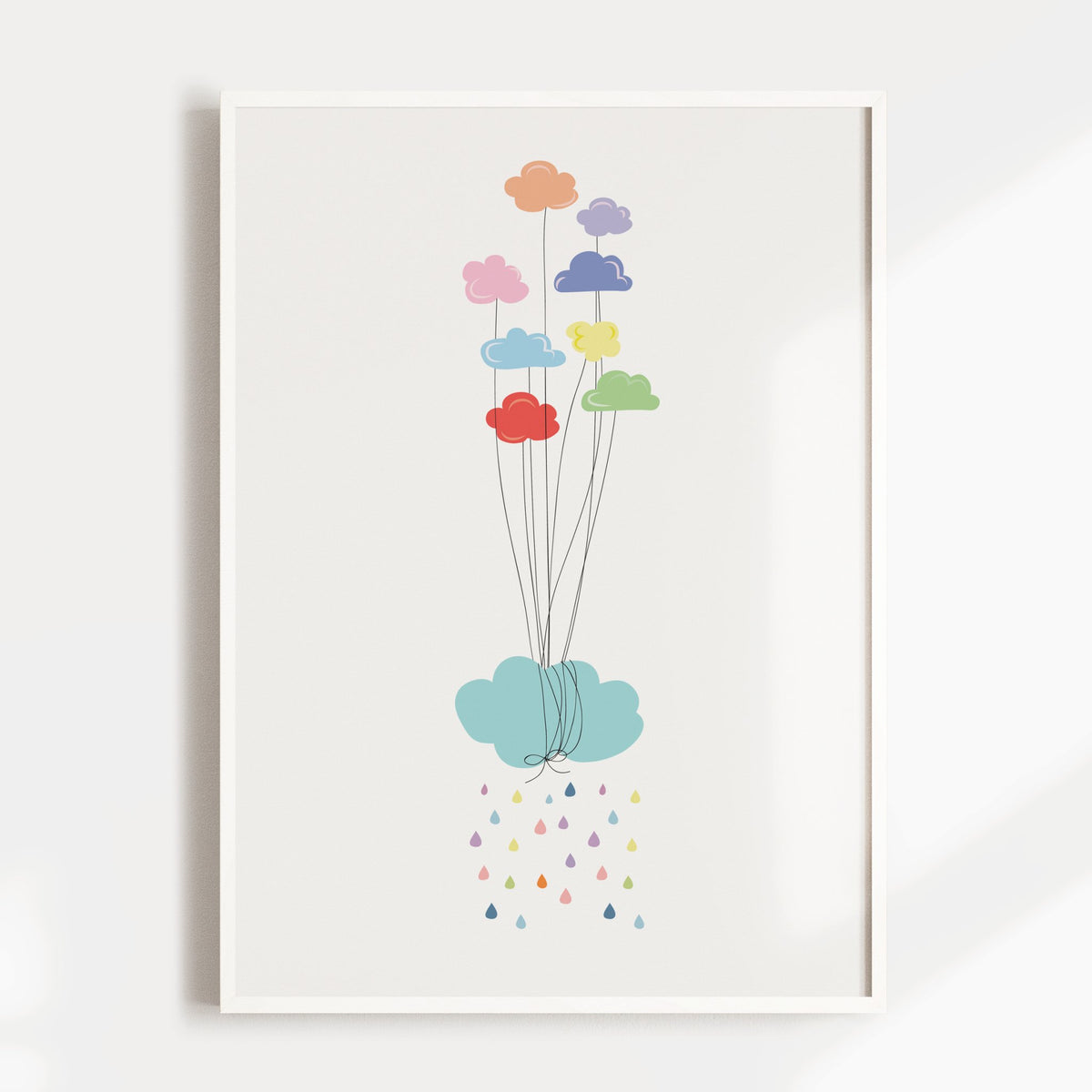 Featuring bright primary colours, this fun and floaty cloud nursery wall art print, would make the perfect addition to any little girls nursery, bedroom or playroom space. The perfect new baby gift or birthday surprise.