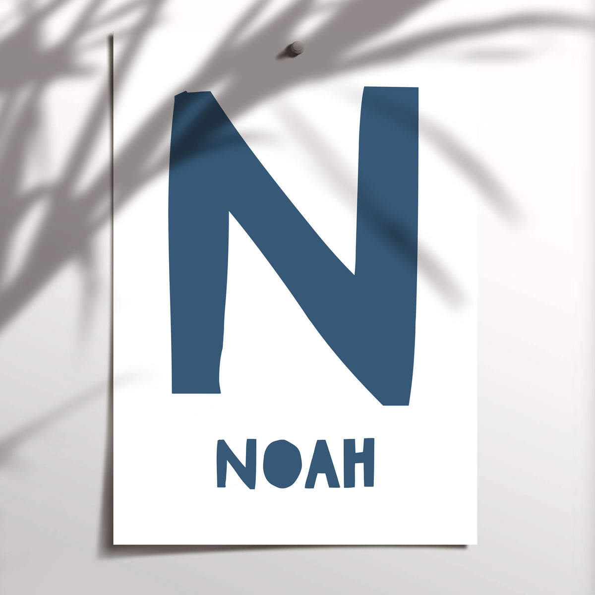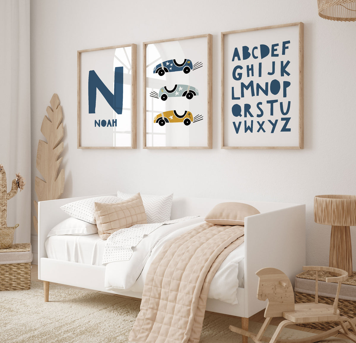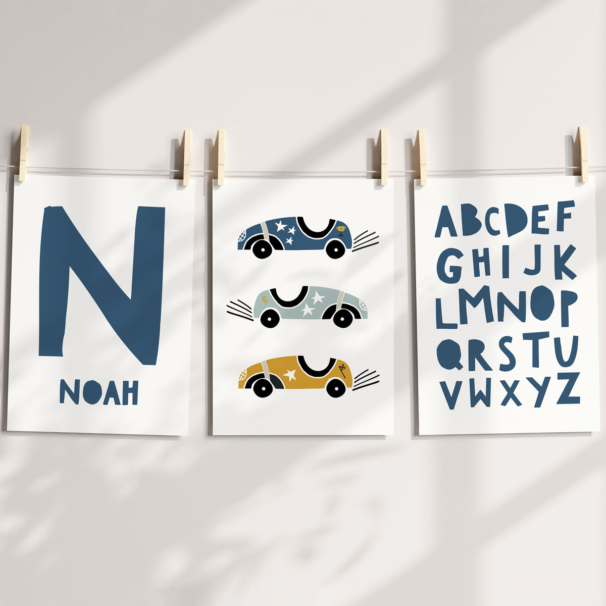 A set of three prints featuring vintage racing cars, a muted blue name & initial & alphabet print. A perfect new baby boy gift, or a great way to add the finishing touches to your own child's nursery, playroom or bedroom space.