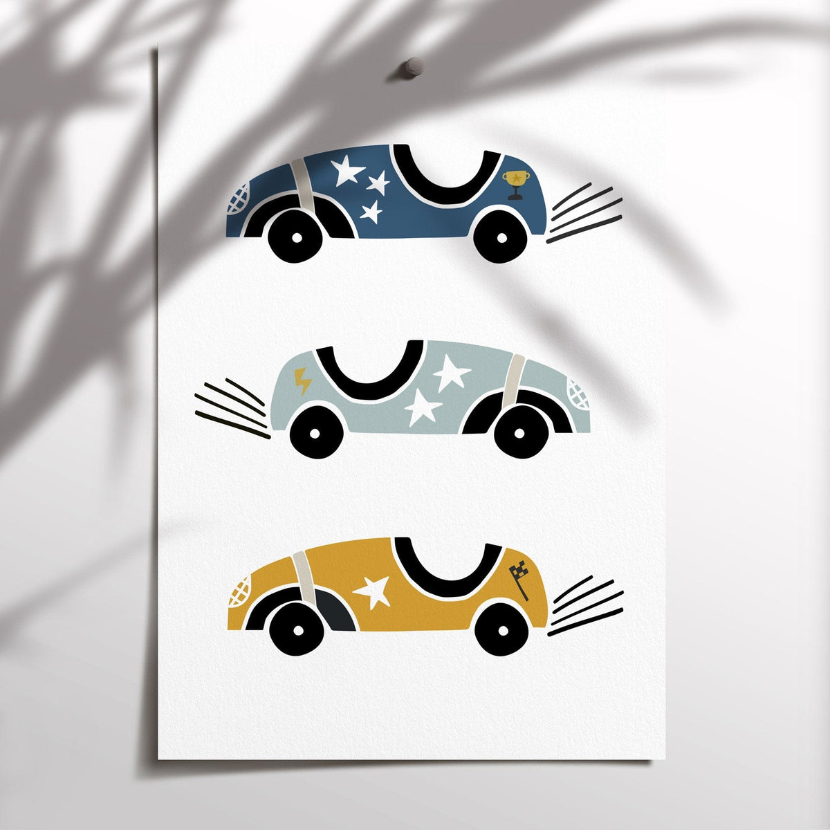 A set of three prints featuring vintage racing cars, a muted green name & blue alphabet print. A perfect new baby boy gift, or a great way to add the finishing touches to your own child's nursery, playroom or bedroom space.