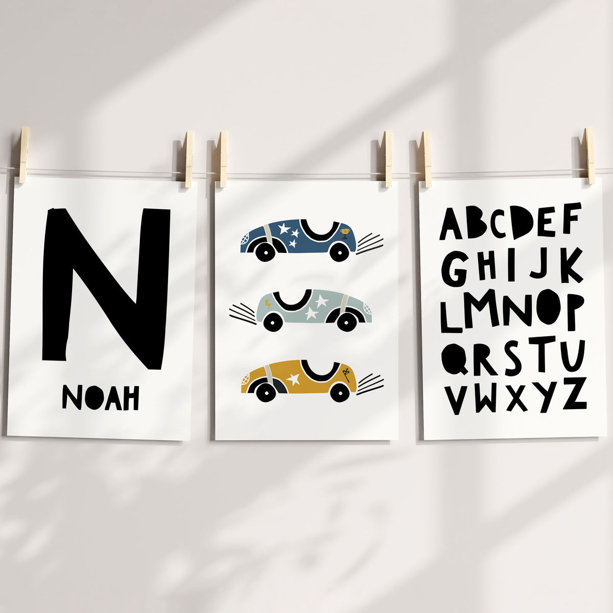 A set of three prints featuring vintage racing cars, a black name & initial & alphabet print. A perfect new baby boy gift, or a great way to add the finishing touches to your own child's nursery, playroom or bedroom space.