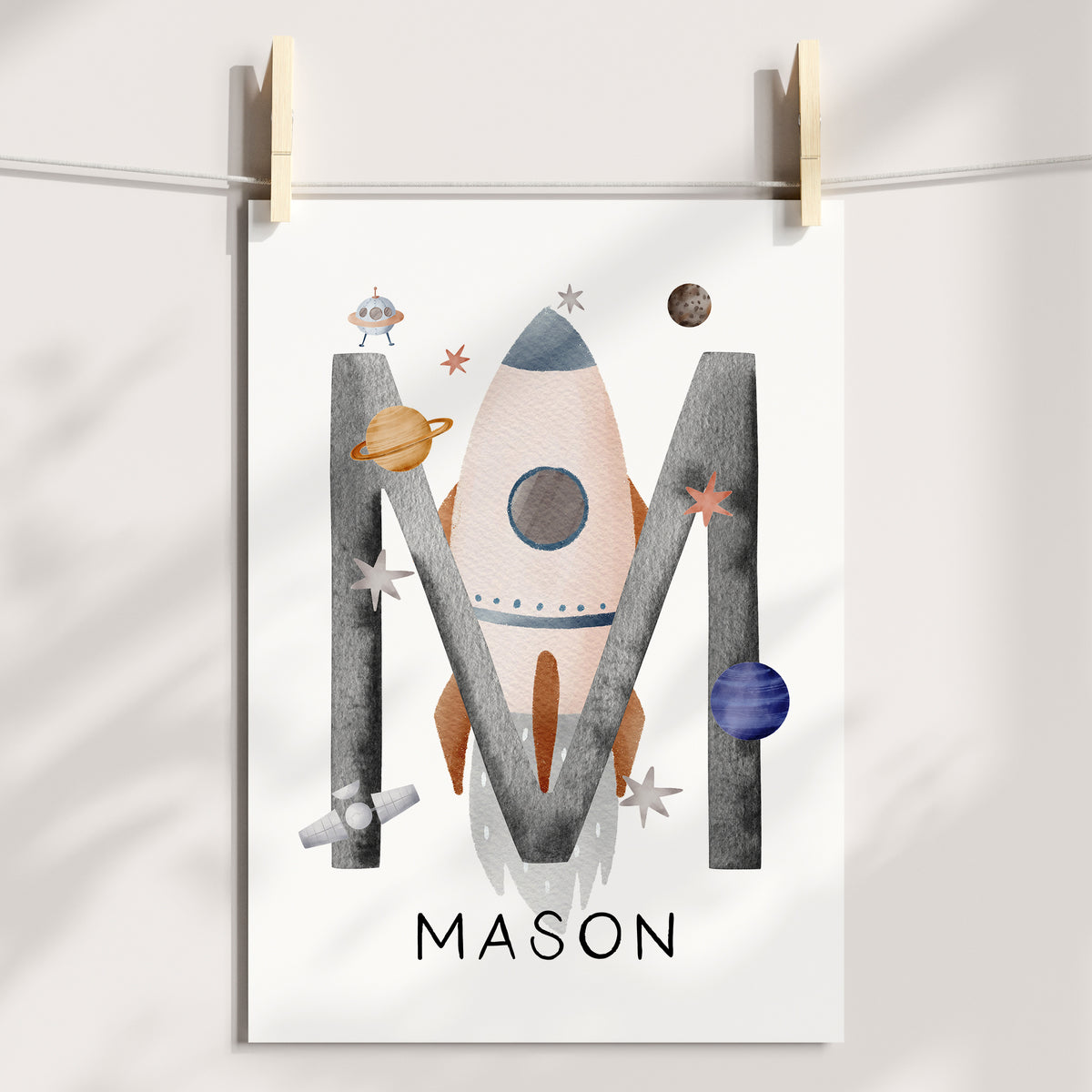 Perfect for the space, planet or solar system themed nursery, bedroom or playroom, this set of three prints includes a rocket name print personalised with your little one's details, an alphabet and numbers print. A perfect new baby boy gift, or a great way to add the finishing touches to your own child's nursery or bedroom space.
