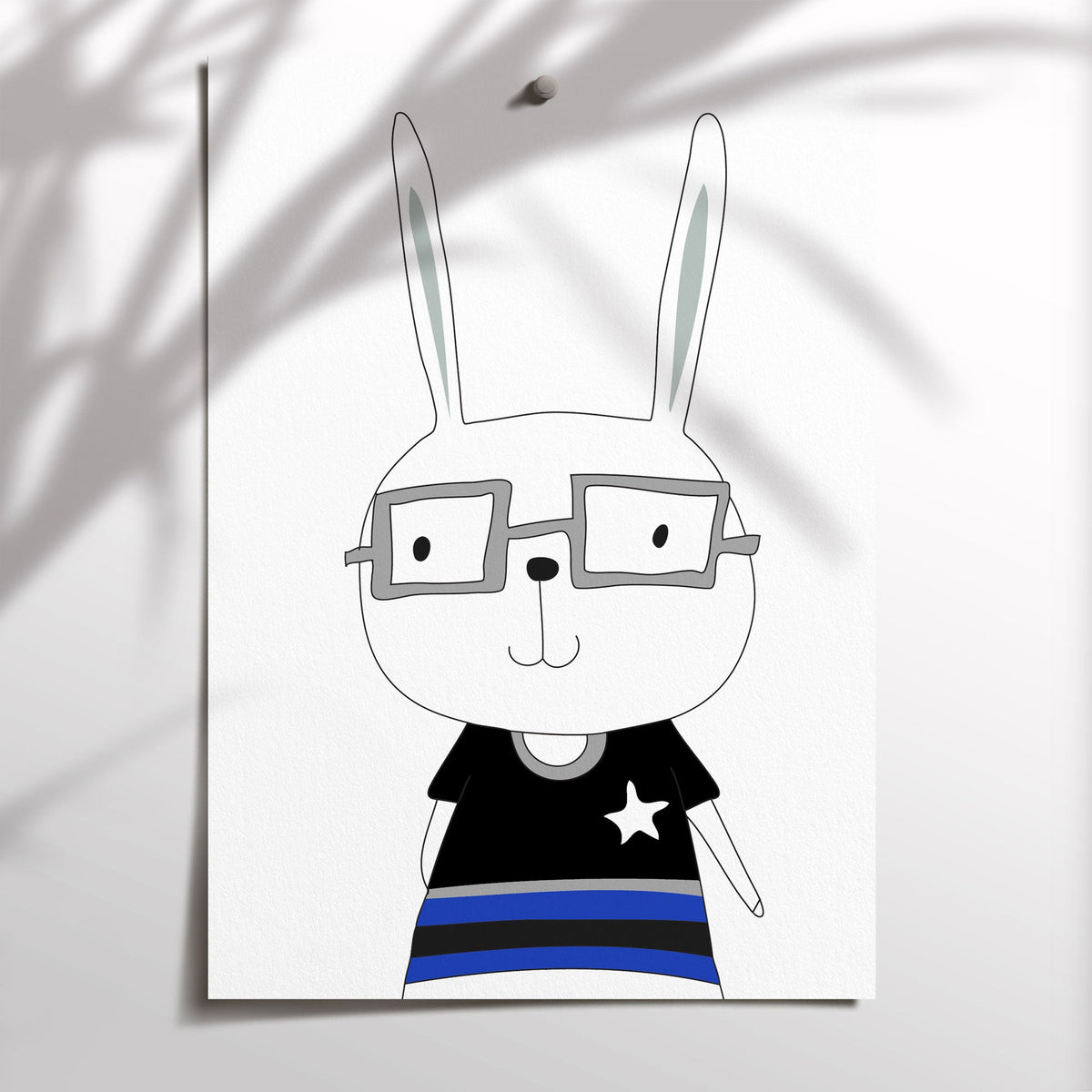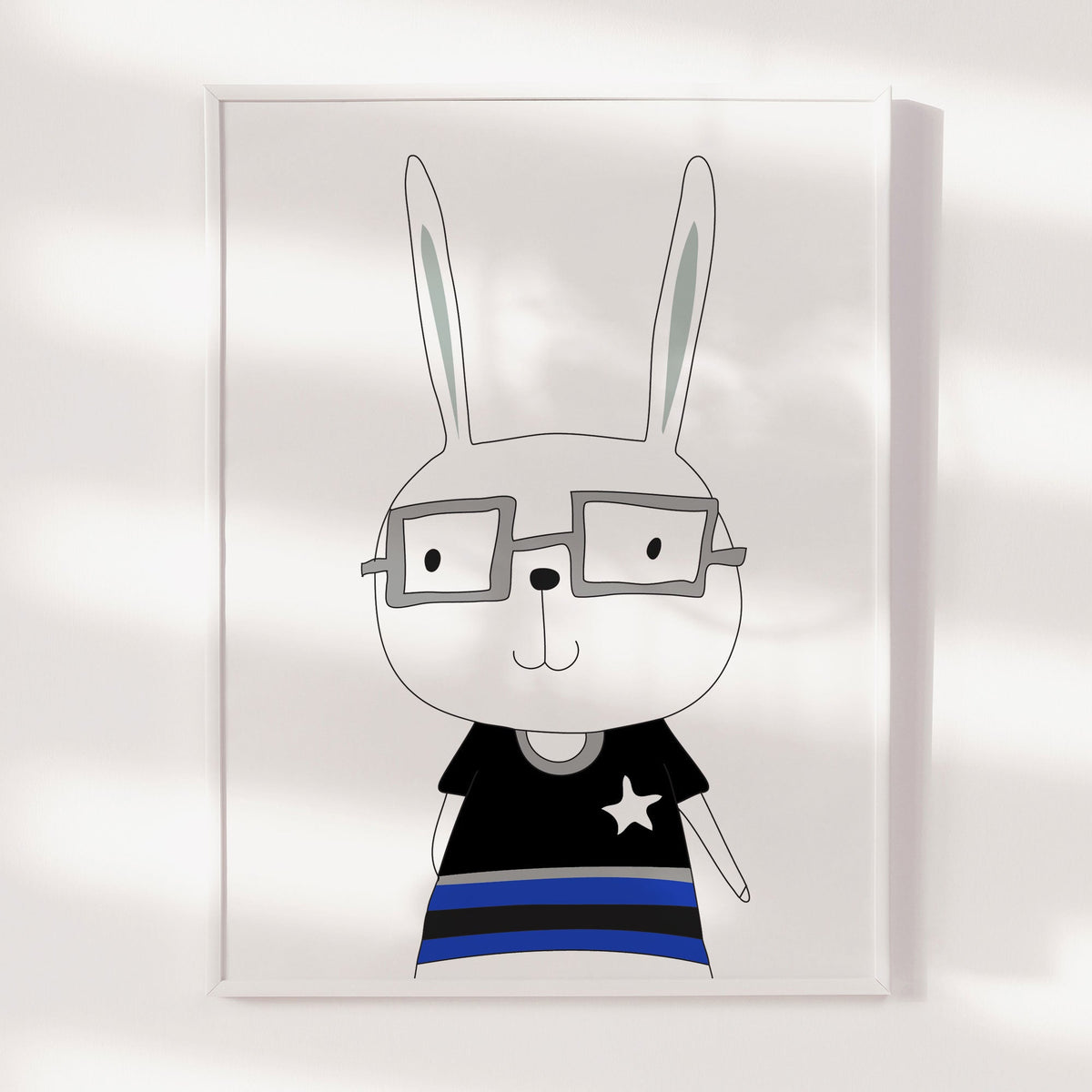 Unit price perOur hipster bunny wall art print can be used as a stand alone statement piece in your child's nursery or bedroom decor, or can be mixed and matched with other co-ordinating posters.