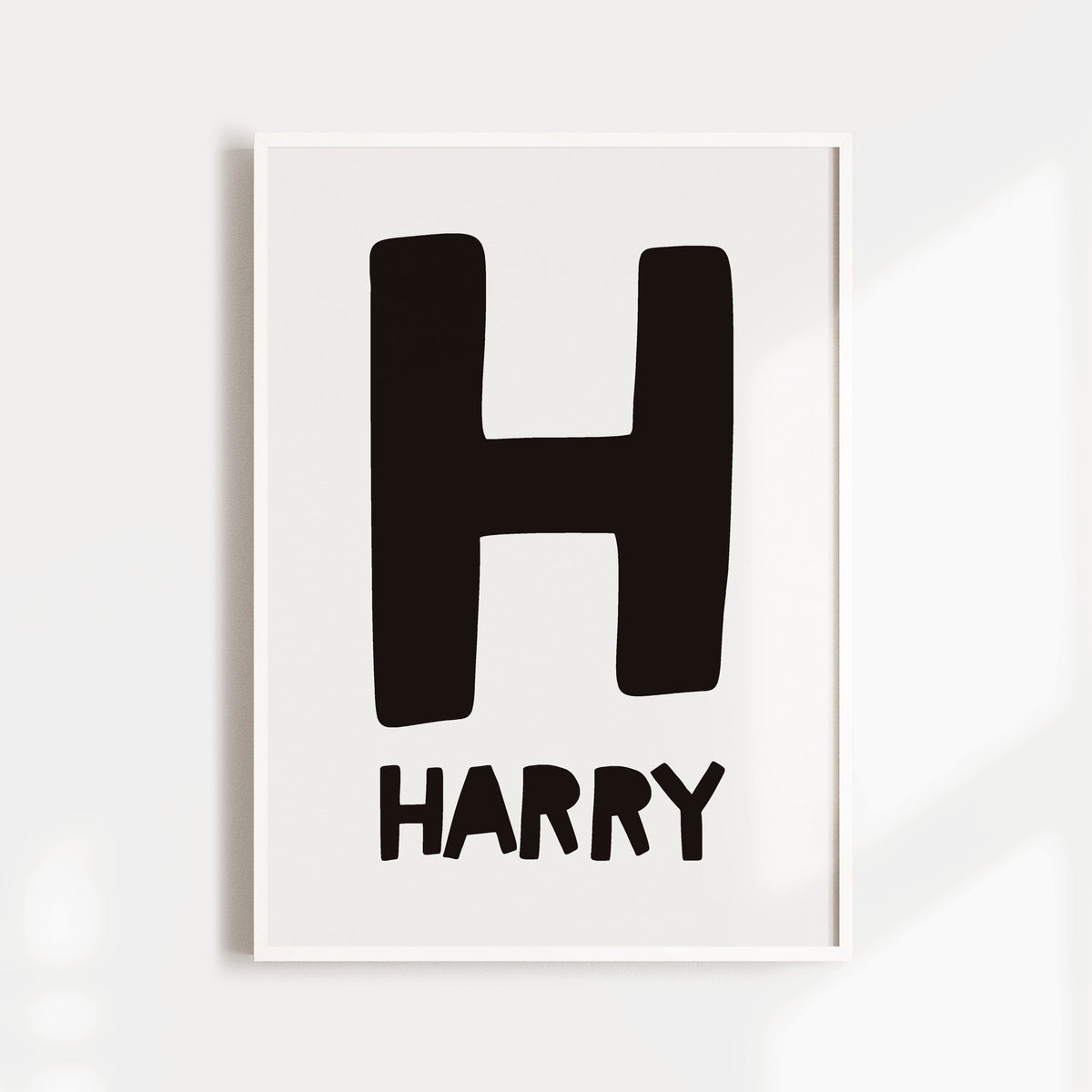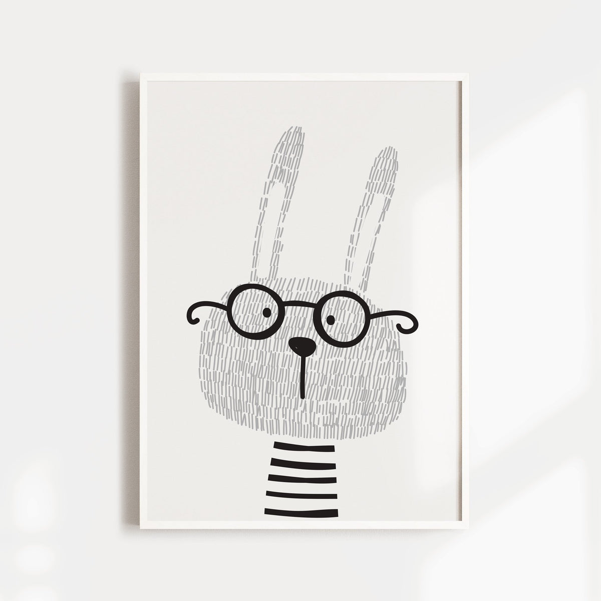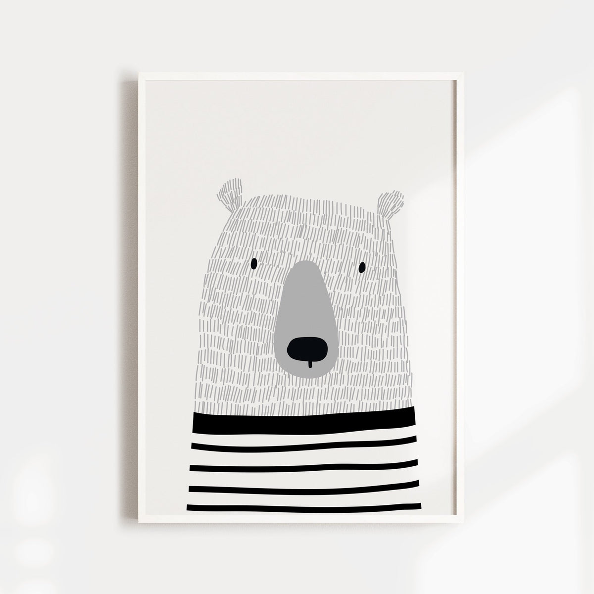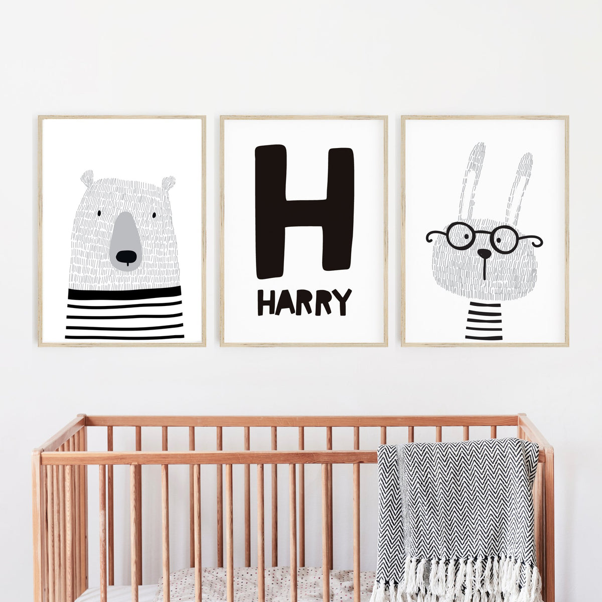 A  set of three scandi, inspired bedroom wall art prints just for the boys. Featuring a bunny, bear and monochrome personalised name and letter print.