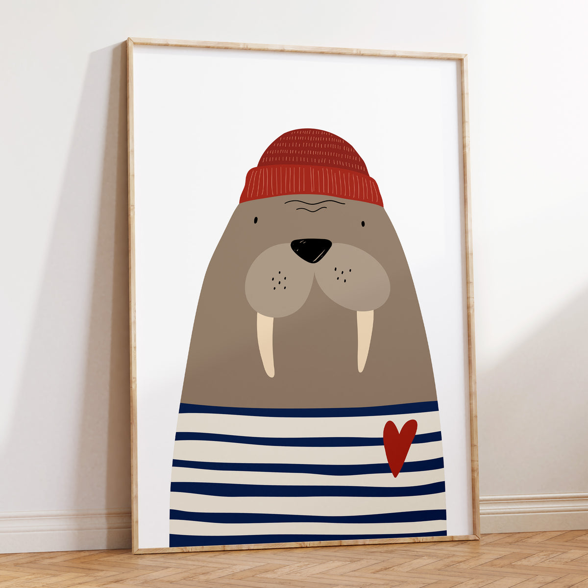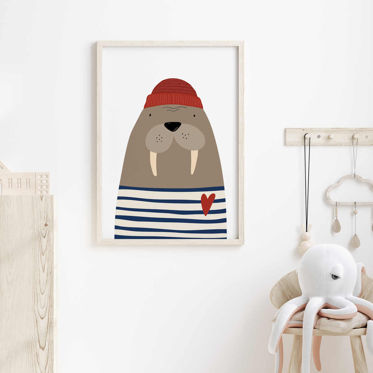 Unit price perA nautical inspired nursery wall art print featuring a sailor walrus. Use as a standalone piece or co-ordinate with our other matching art prints, perfect the oceanic themed nursery, bedroom or playroom.