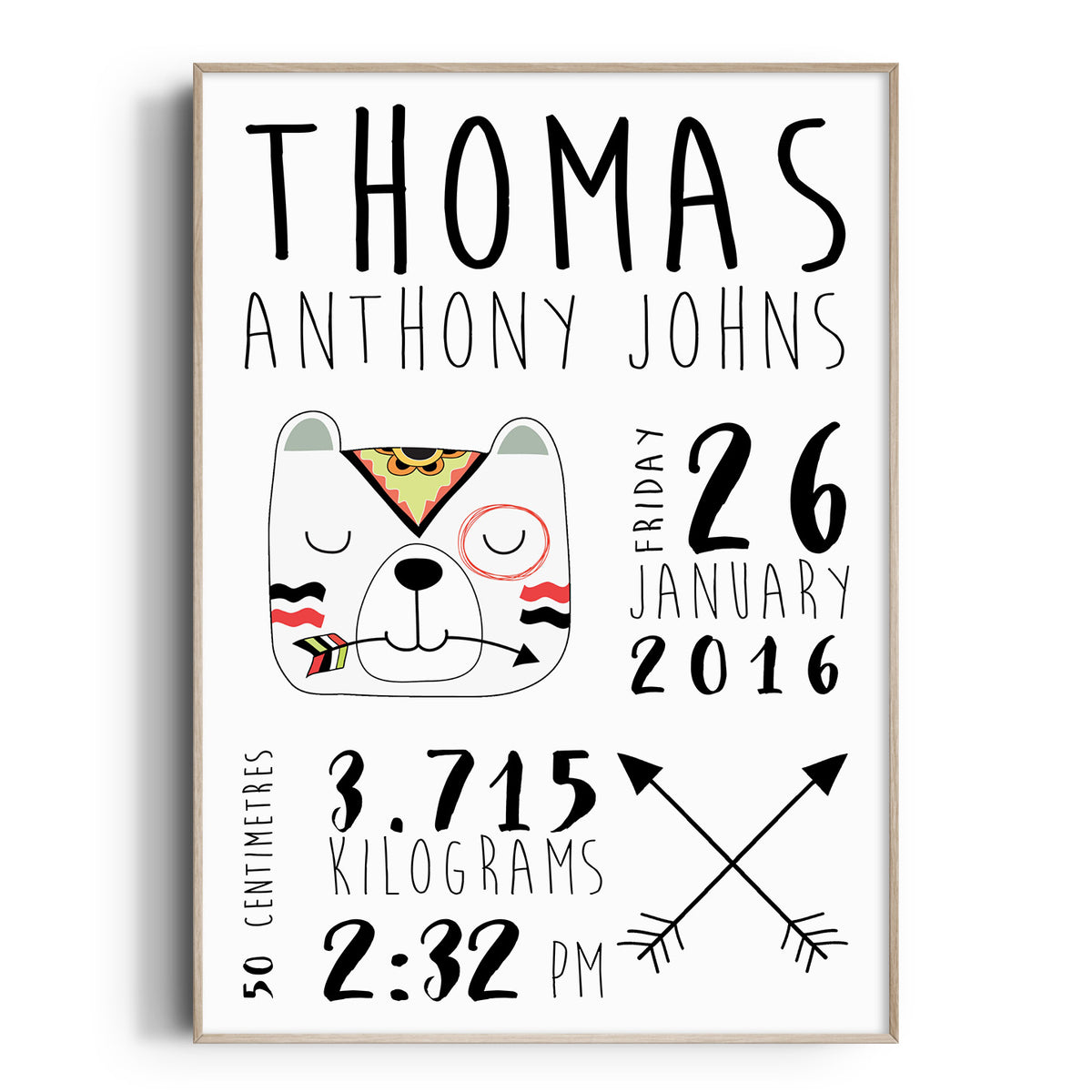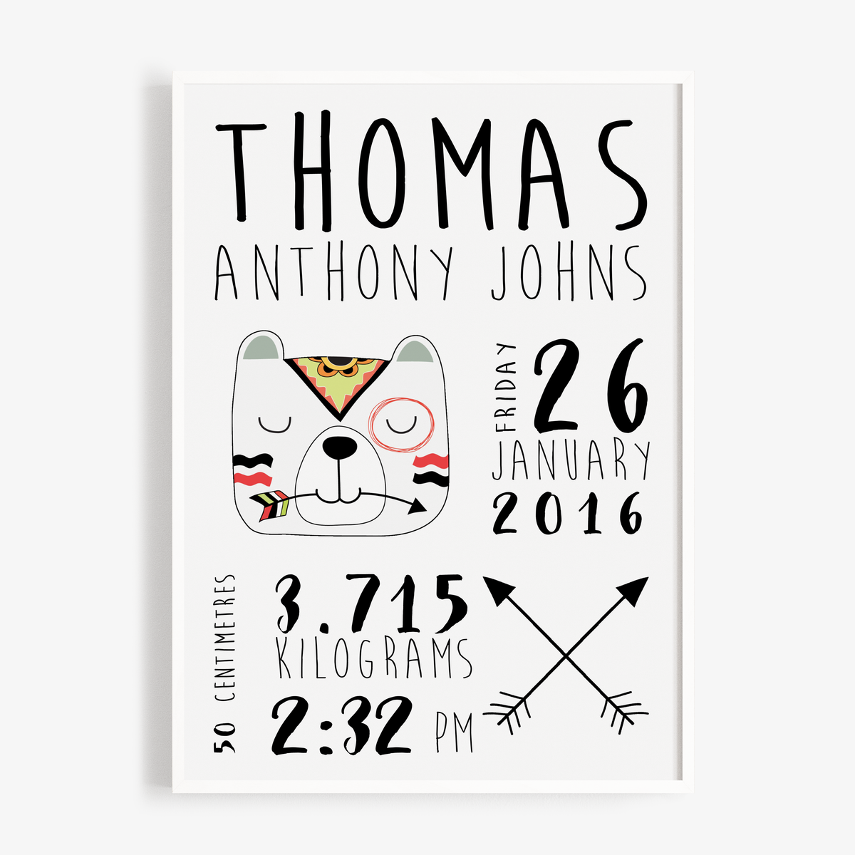 Unit price perCustomised with your childs' birth details, featuring a woodland bear and arrows, this birth announcement print makes a great gift for yourself or a friend.