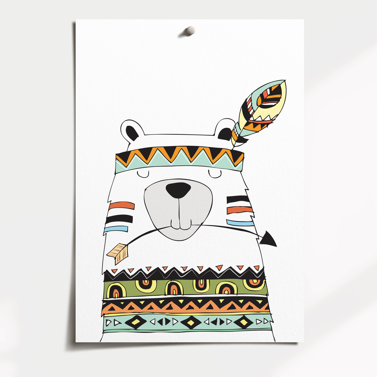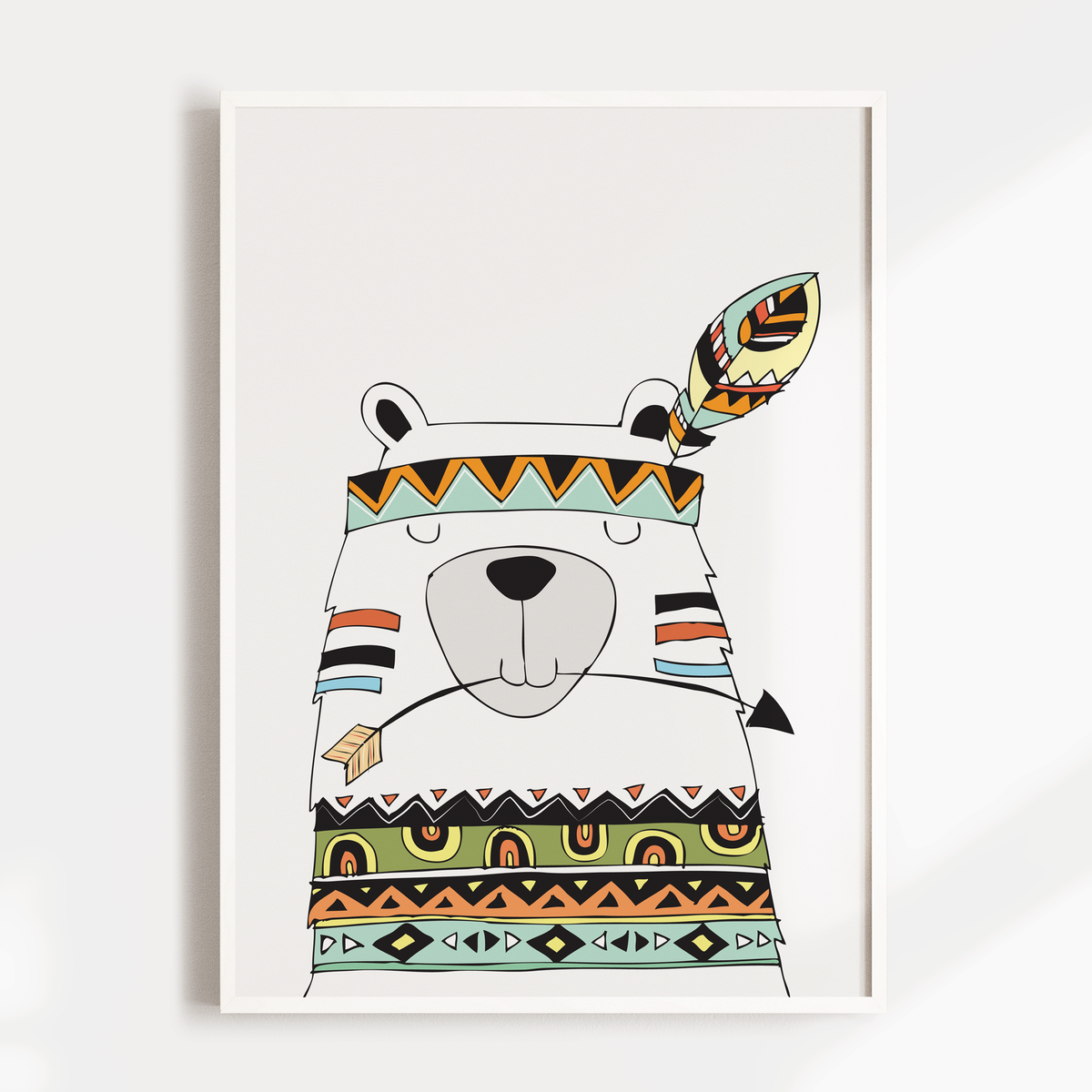 Unit price perThis bear nursery wall art print is perfect for the woodland, tribal or animal themed bedroom, nursery or playroom decor. Use it as a stand alone feature or combine with other co-ordinating animal posters.