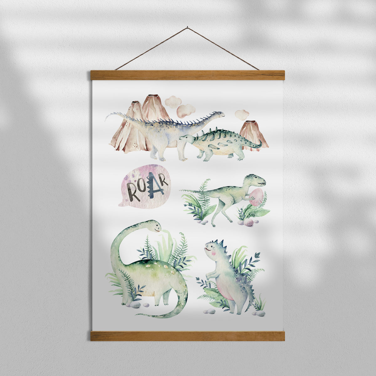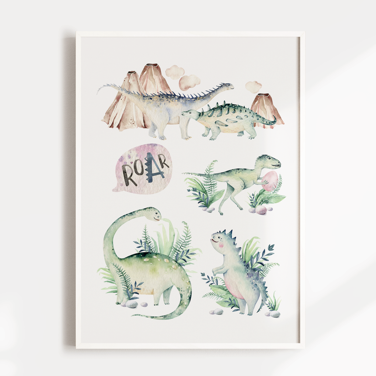 Featuring a collection of dinosaurs, all accentuated with prehistoric greenery and volcanoes, this wall art print will make the perfect addition to your little boys nursery, bedroom or playroom space.