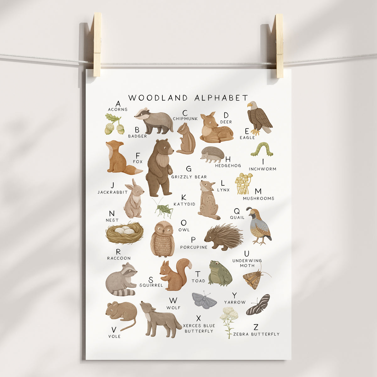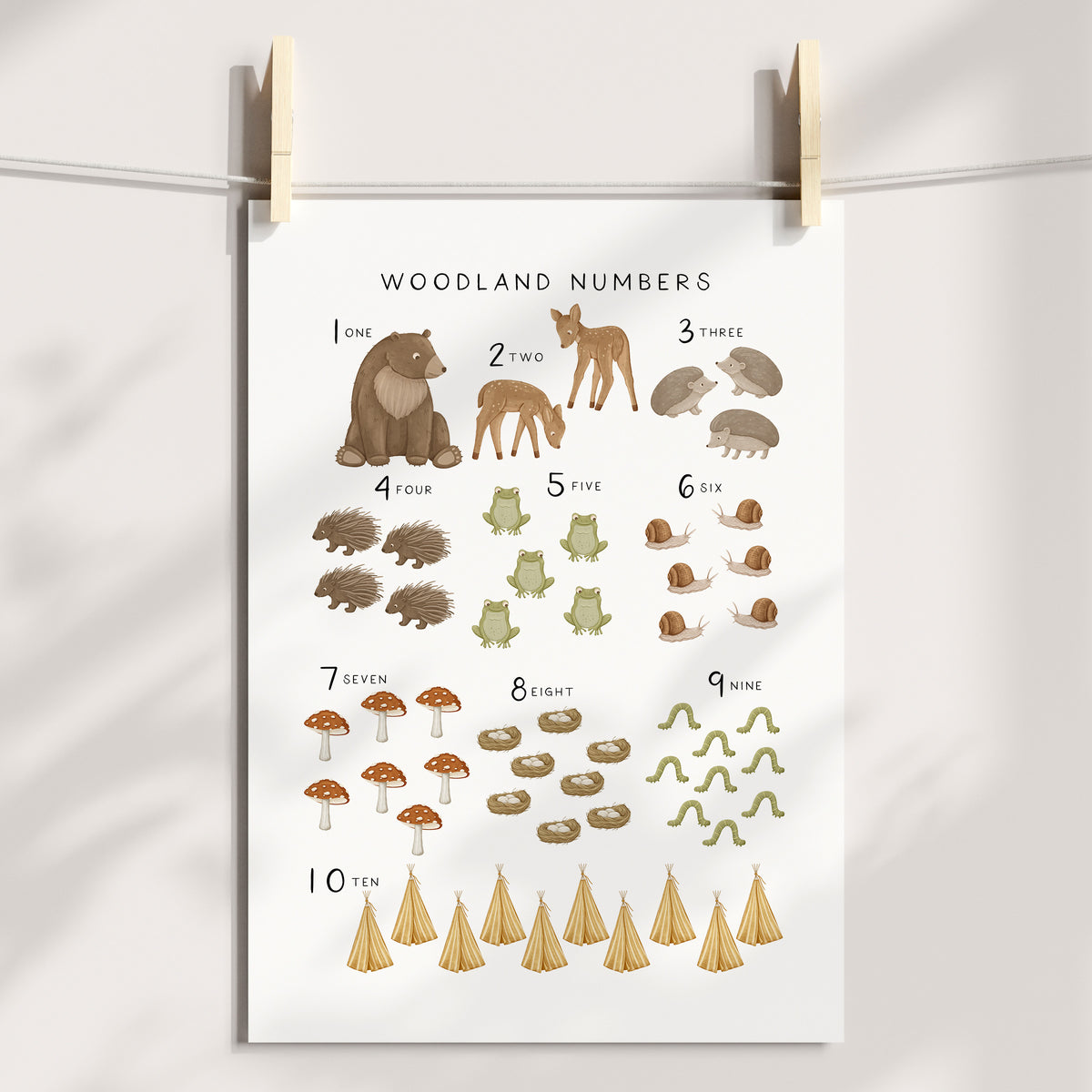A set of three prints featuring a woodland alphabet, numbers and a personalised name & initial print. A perfect new baby boy gift, or a great way to add the finishing touches to your own forest or animal nursery, playroom or bedroom decor.