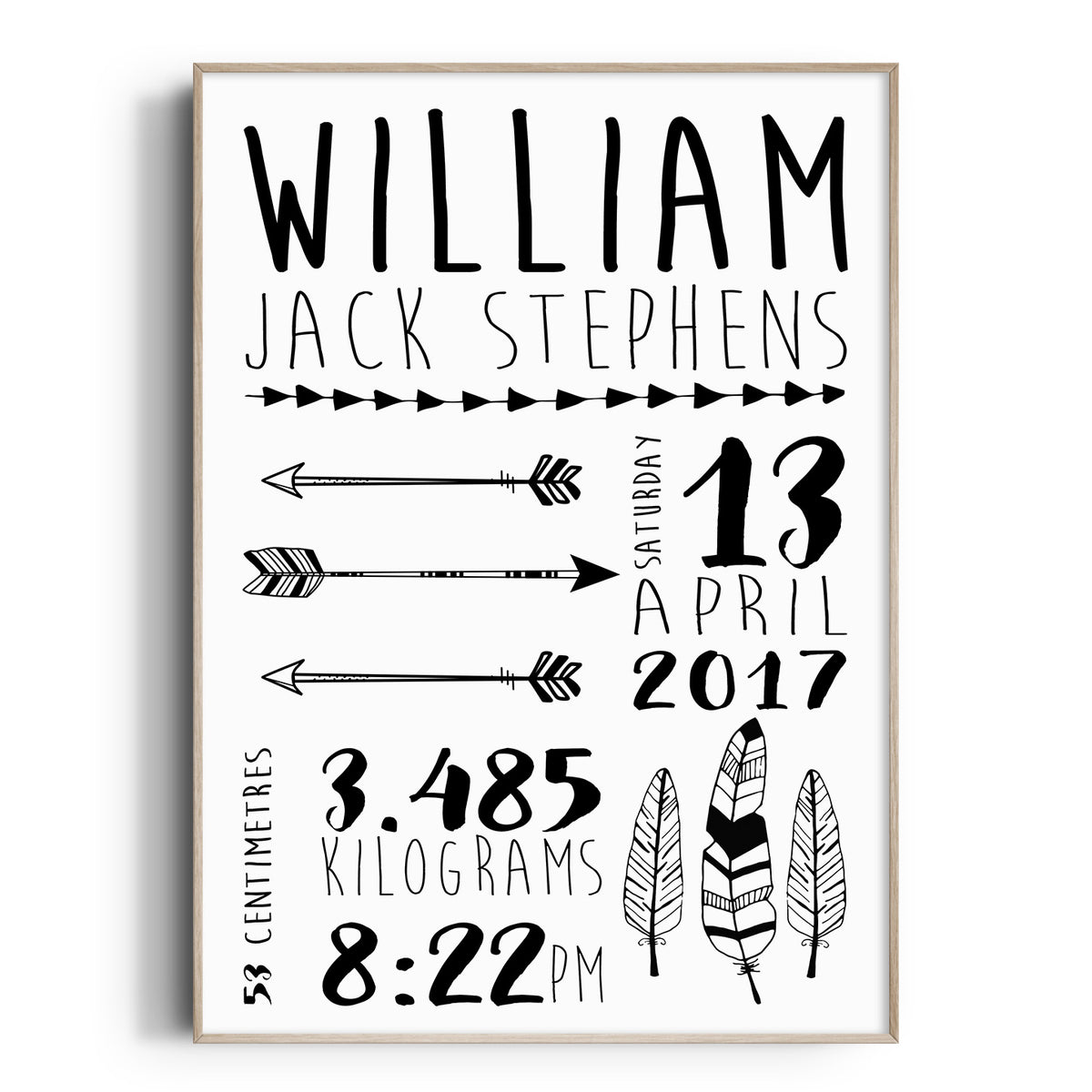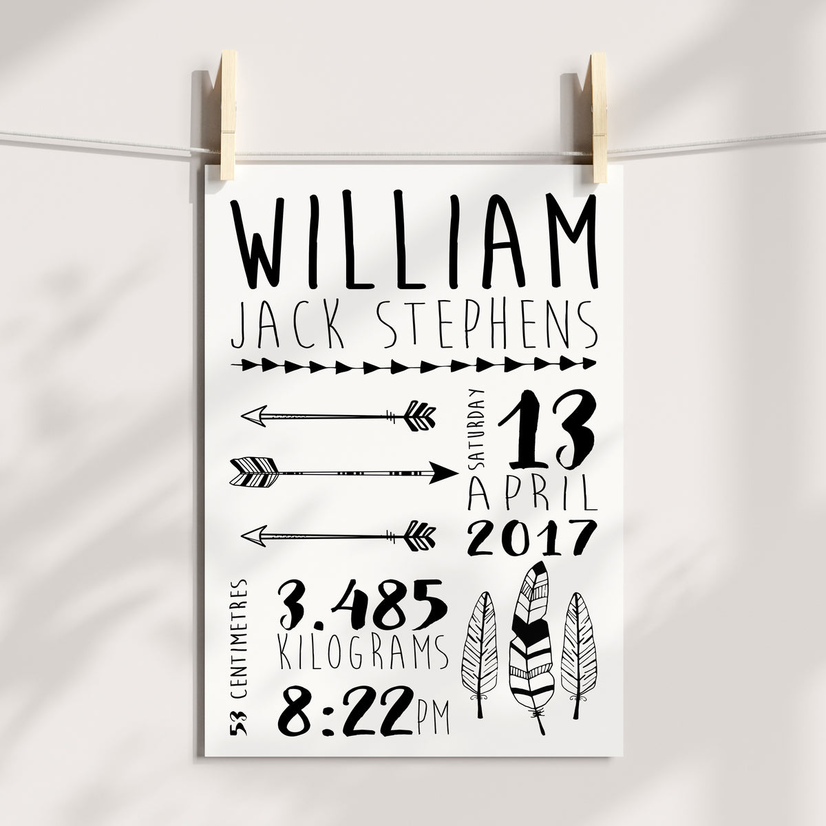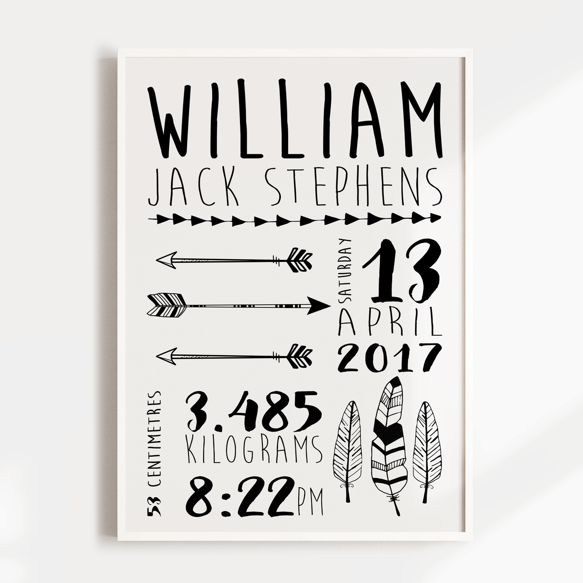 A personalised monochrome birth print, accented with a tribal feathers and arrows and featuring all the details of baby's arrival.