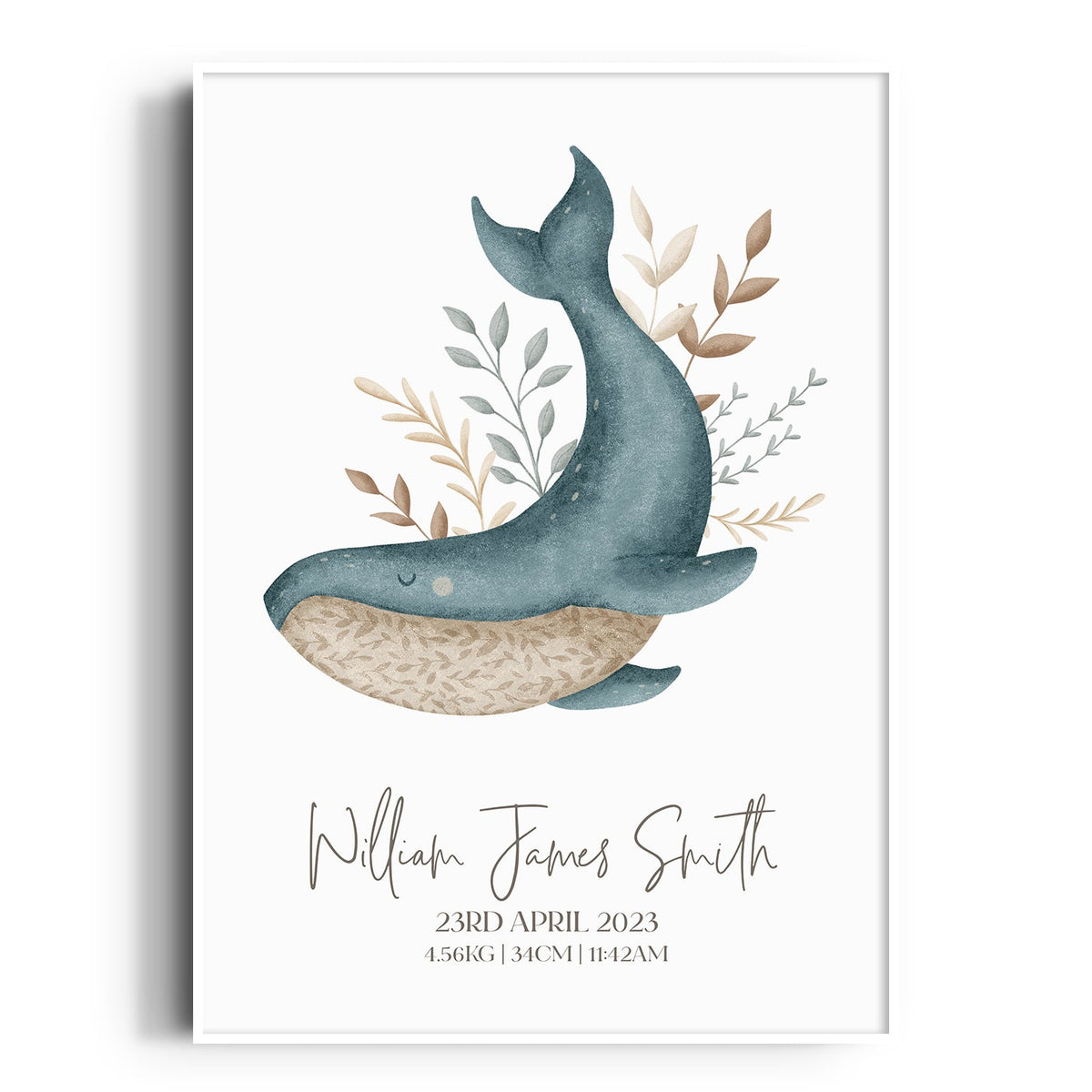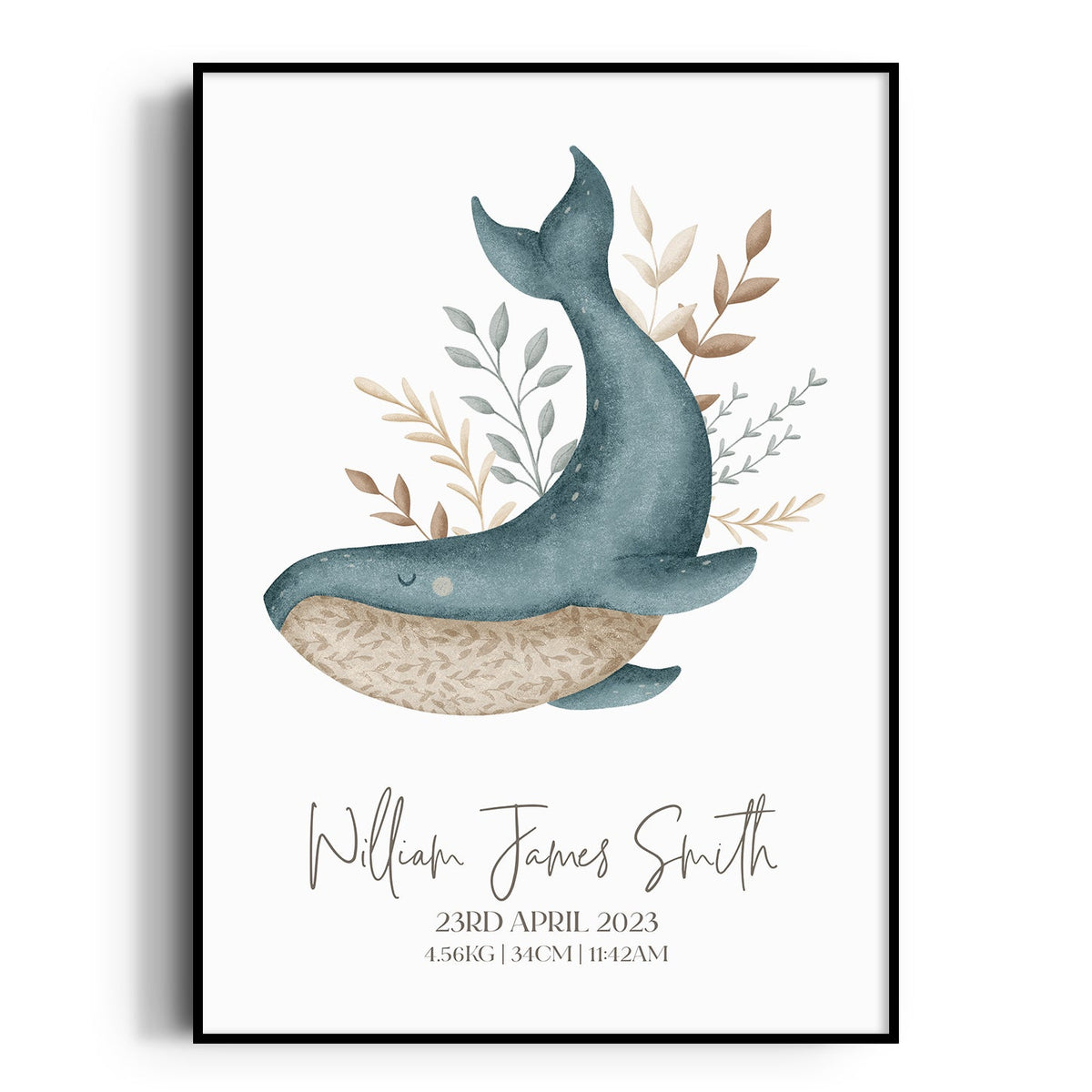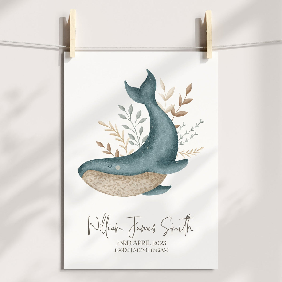 Unit price perPerfect for the ocean or under the sea themed nursery, bedroom or playroom decor is this watercolour boho whale birth print, personalised with your childs details, use as a standalone piece or co-ordinate with other designs in this range.