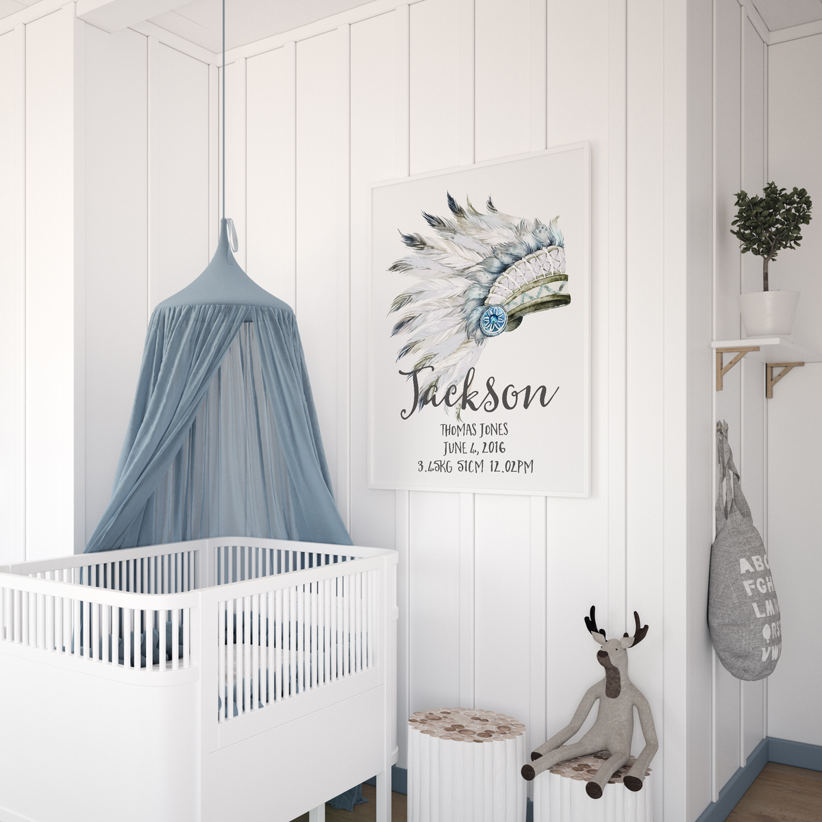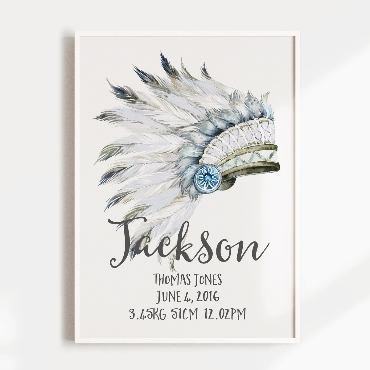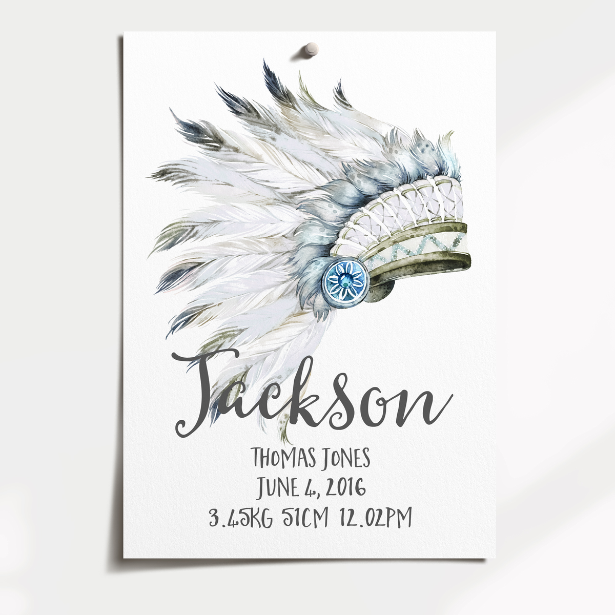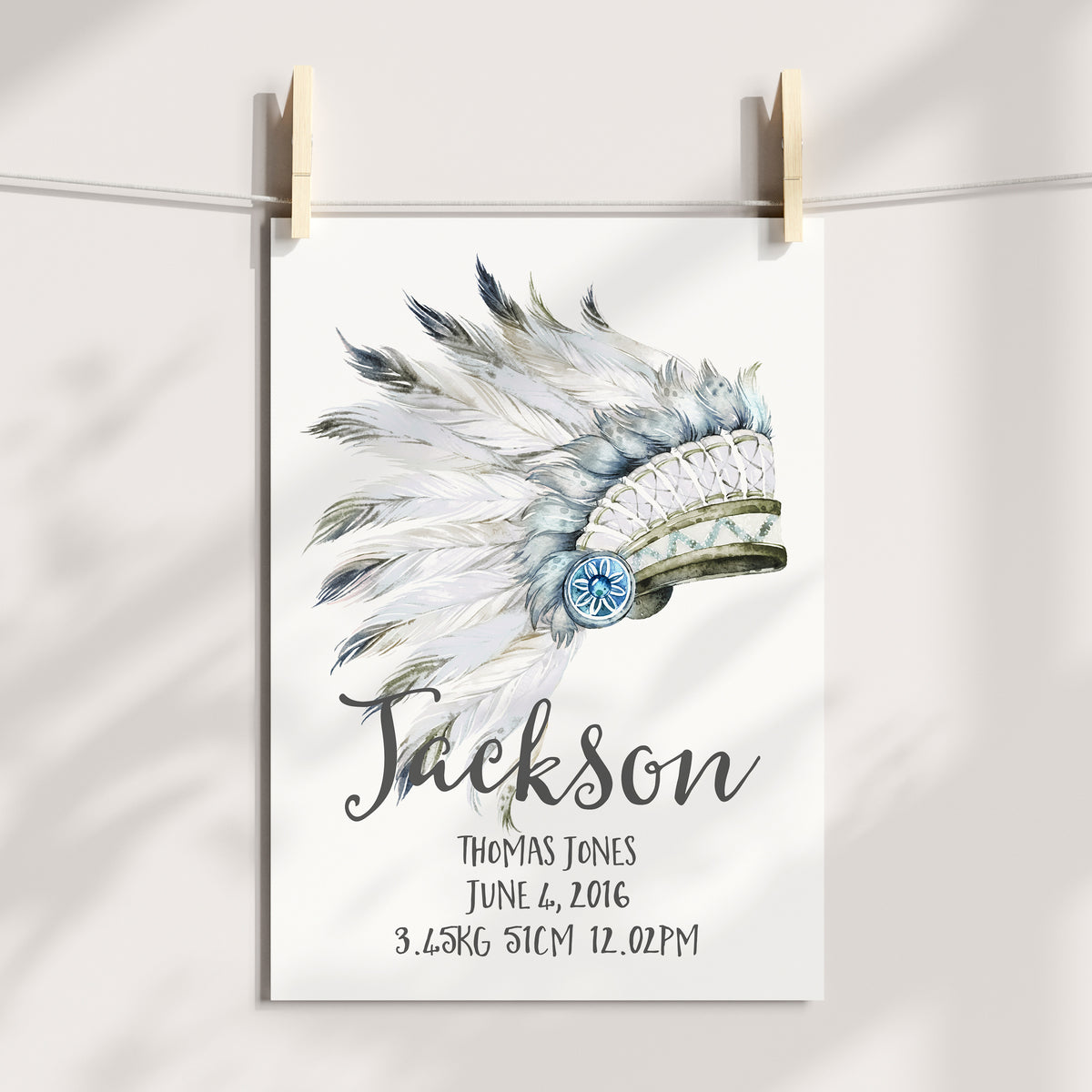 Unit price perCustomised Tribal Boho watercolour headdress wall art print, personalised with your child's details.