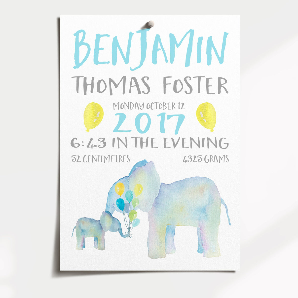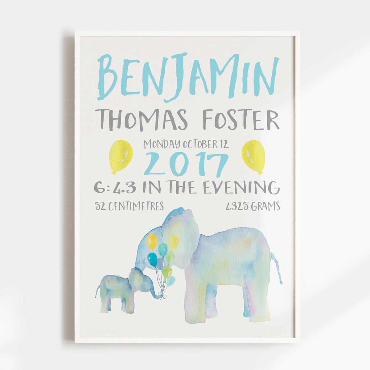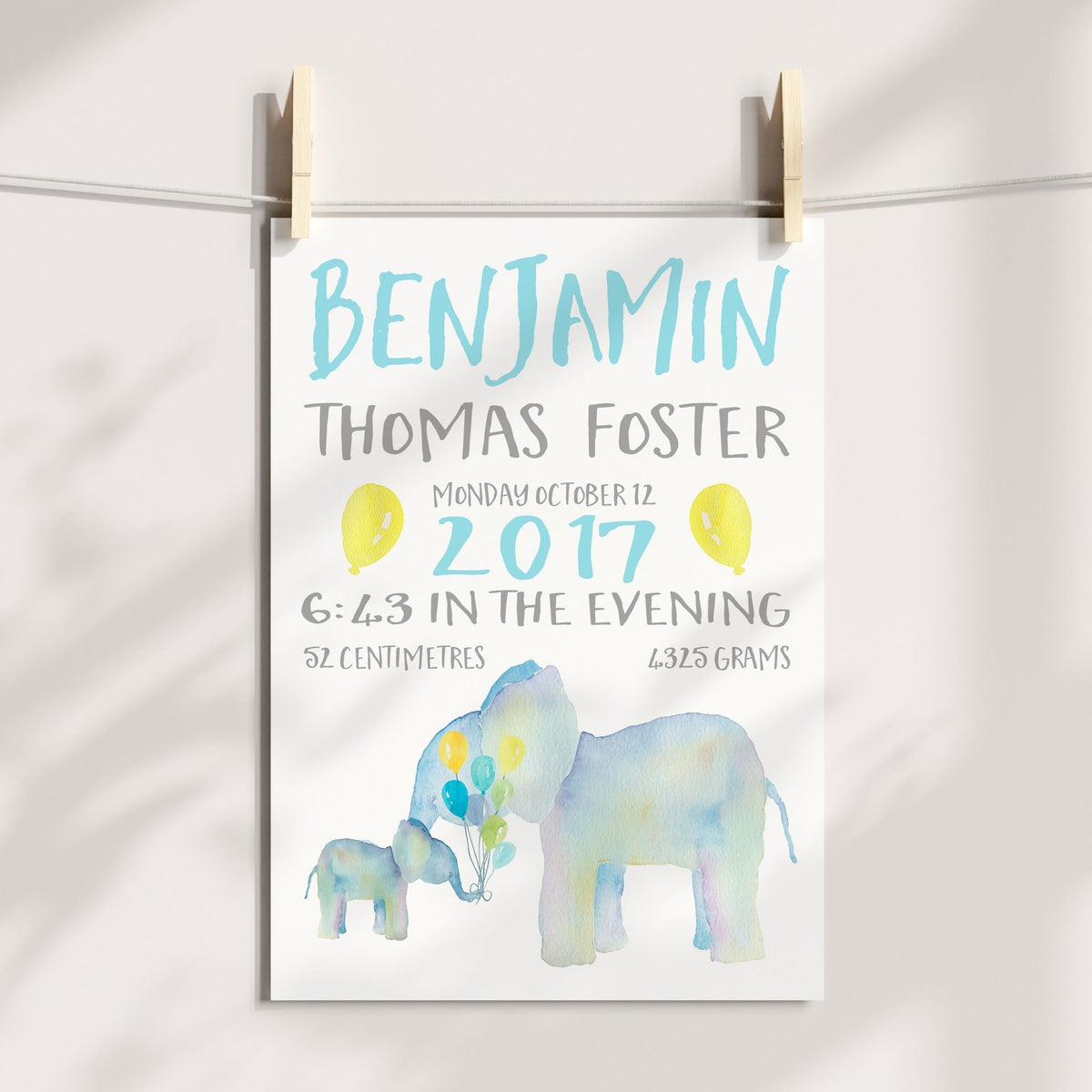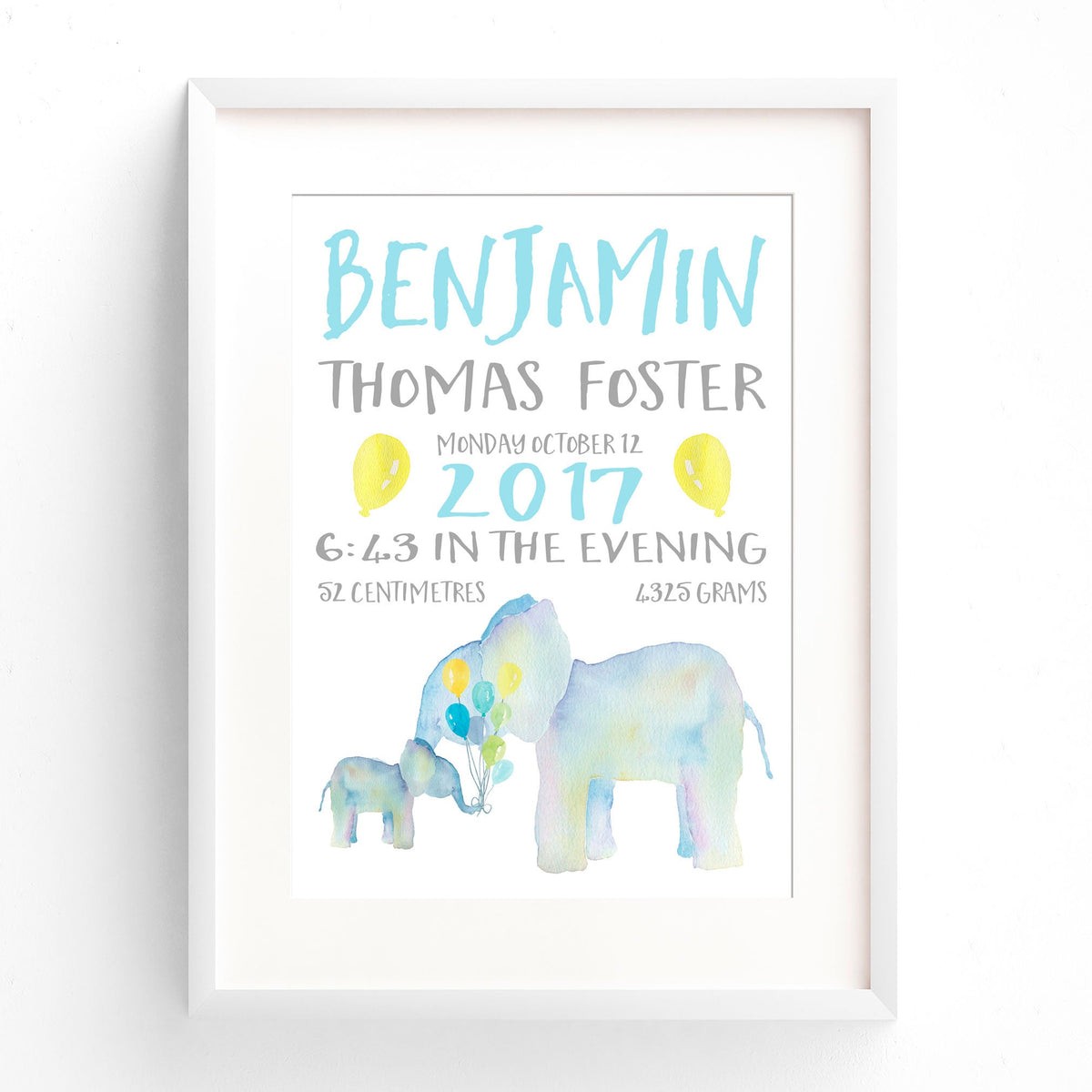 Unit price perCelebrate your little one's arrival with this beautiful elephant birth print. Featuring a sweet watercolour illustration and their birth details, it's the perfect way to add a touch of whimsy to your nursery. Create an unforgettable keepsake that your family will treasure for years to come.