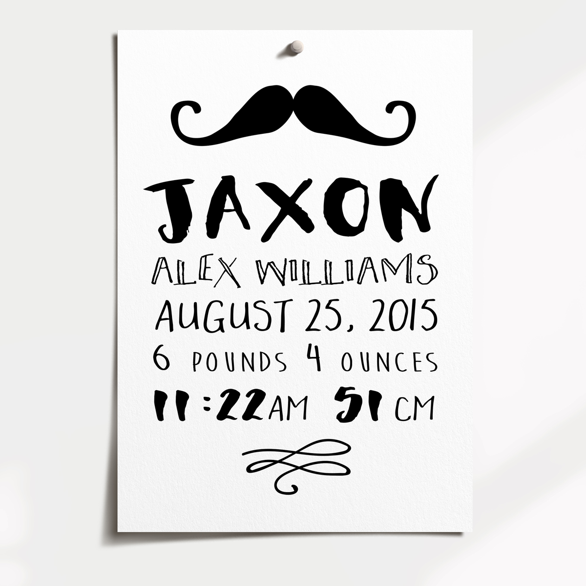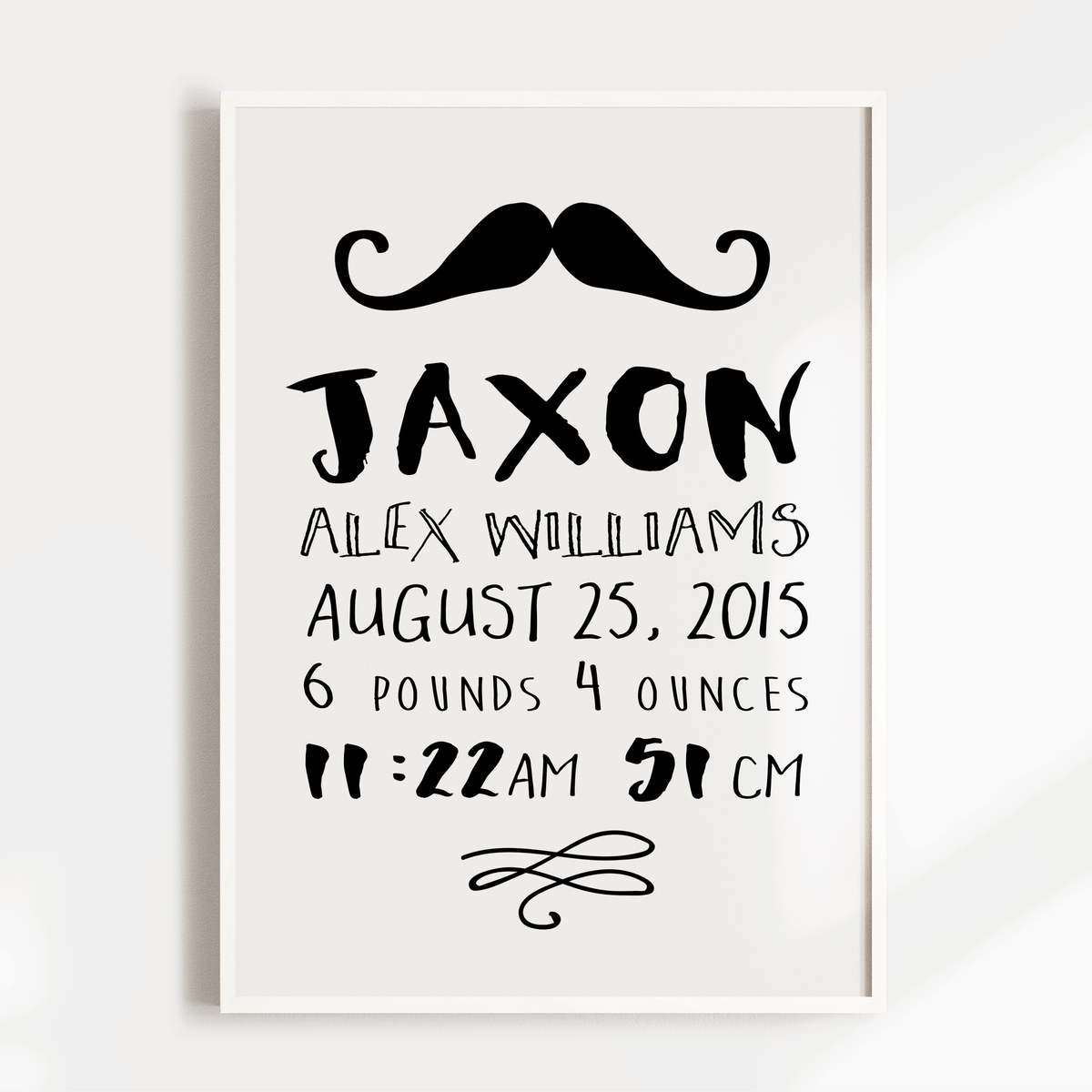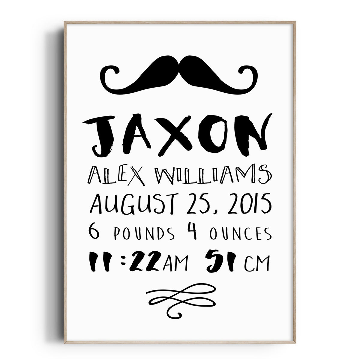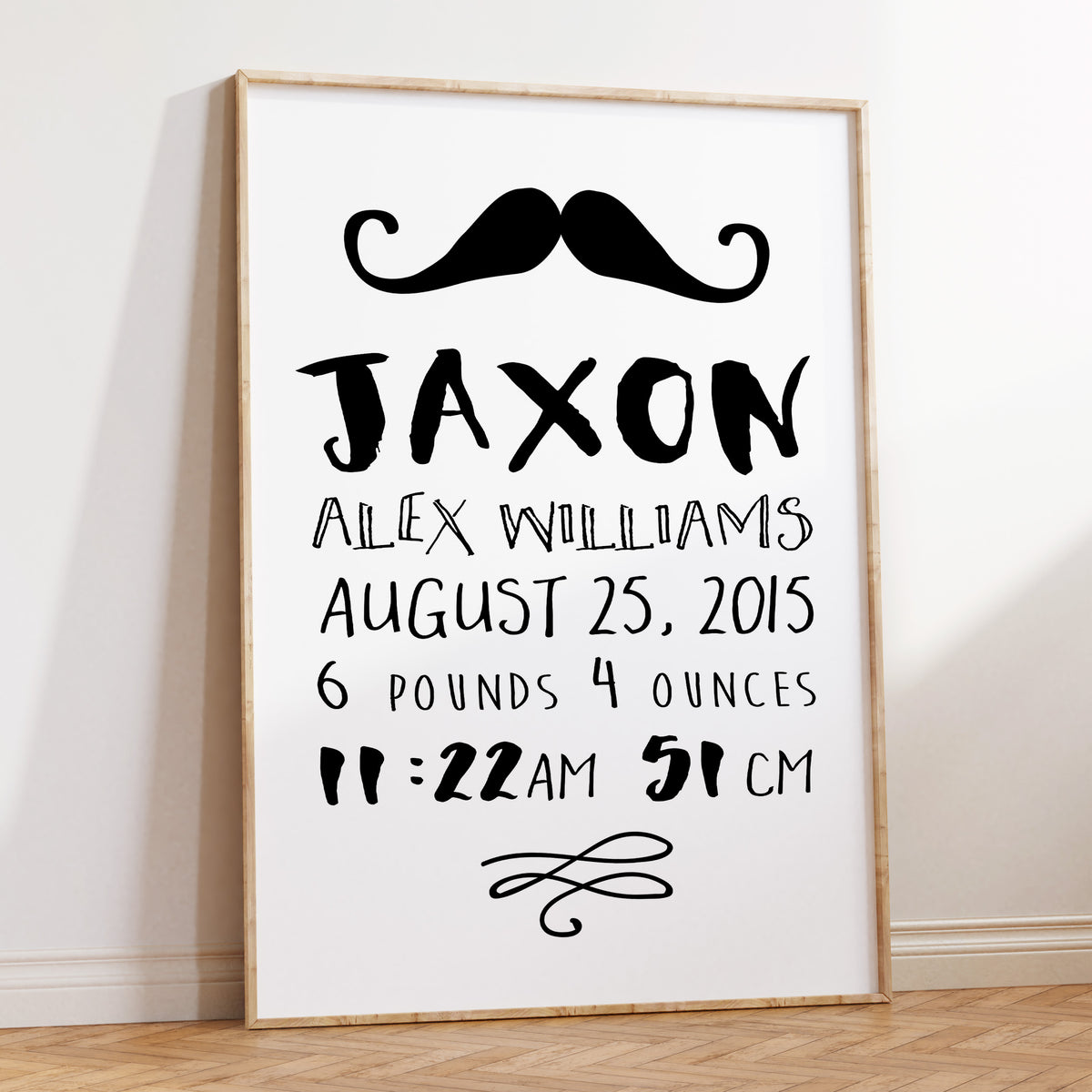 Unit price perPerfect for the hipster nursery is our moustache birth details print, personalised with your child's details. A perfect new baby gift or add the finishing touches to your own little ones space.