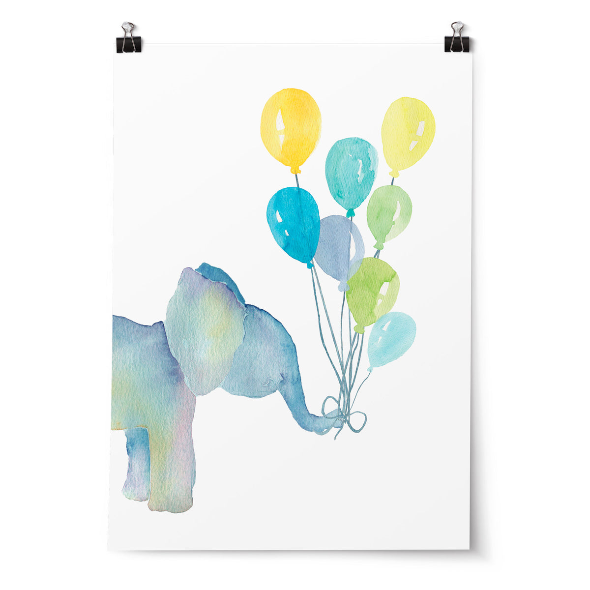 A Soft Watercolour Elephant print Set, with personalised Birth Print. This Set of 3 Prints features a Baby Elephant with Balloons, a Mother Elephant and a co-ordinating Birth Announcement print.