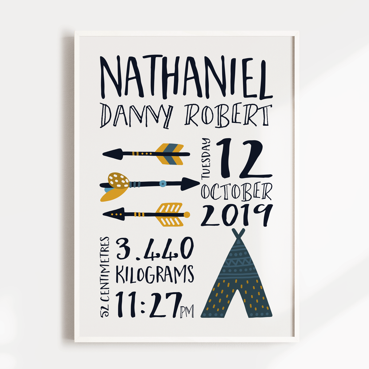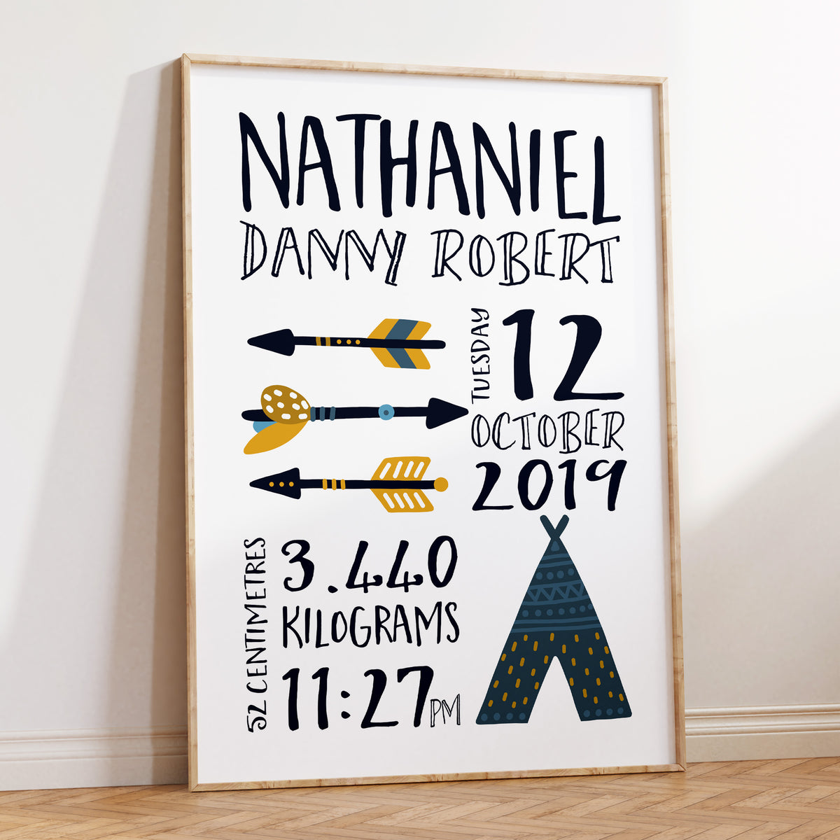 Unit price perA birth announcement nursery print, featuring a tribal teepee and arrows, customised with your child's birth details.