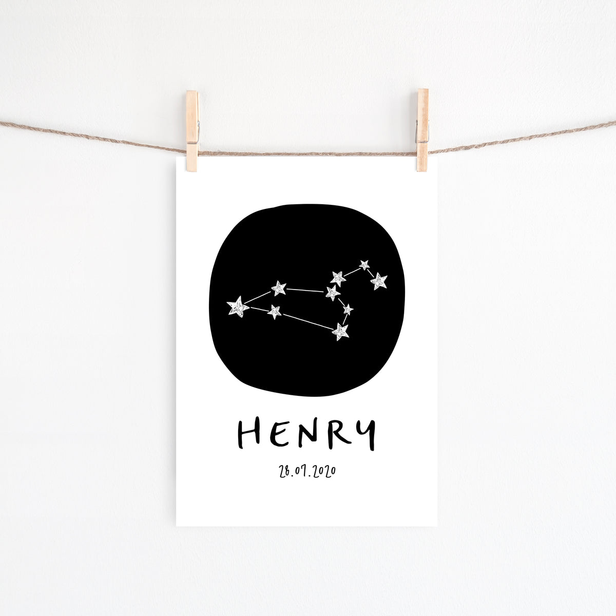 A customised name and birth date wall art print, featuring the Leo star sign constellation. A statement piece for the monochrome nursery or bedroom decor.