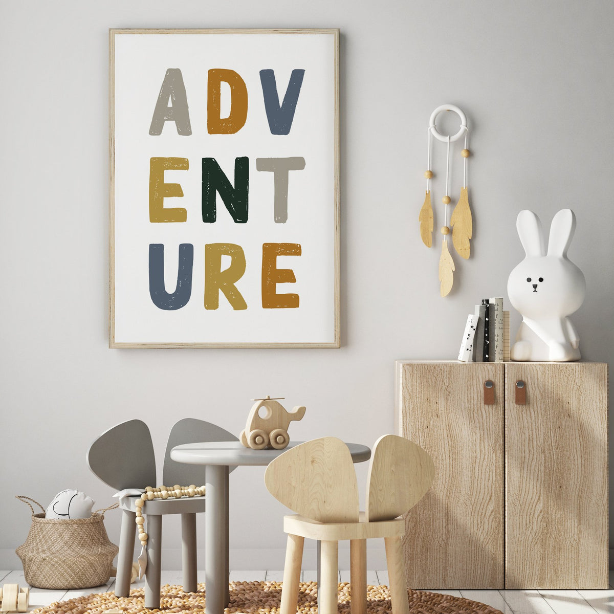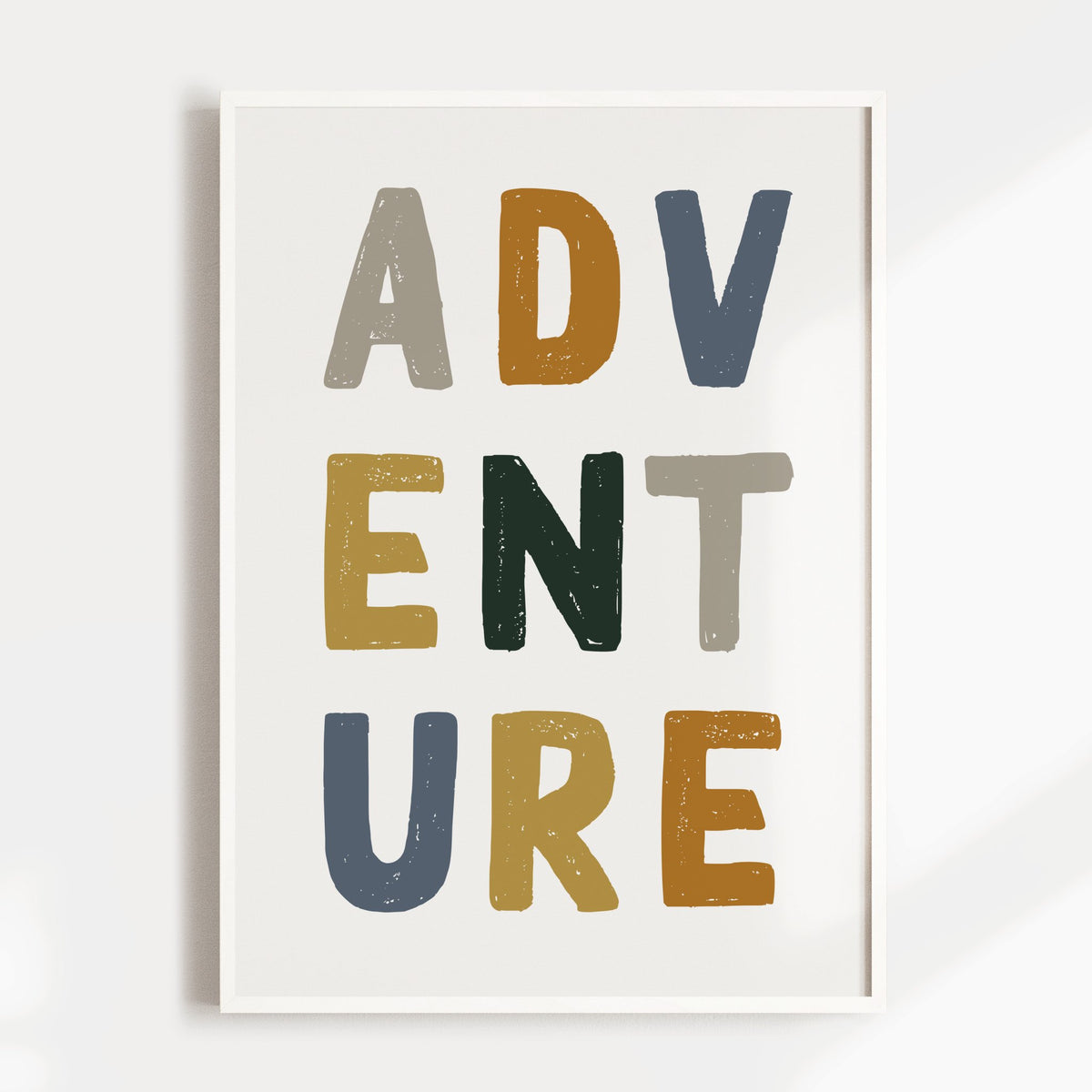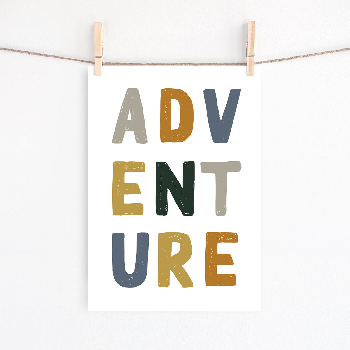 This fun adventure typography art print, featuring jungle & safari nursery décor colours makes a perfect new baby gift, or a great way to add the finishing touches to your own child's space.