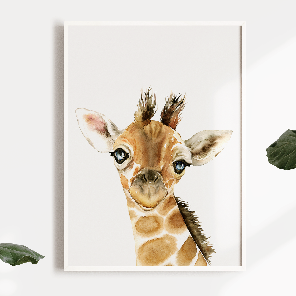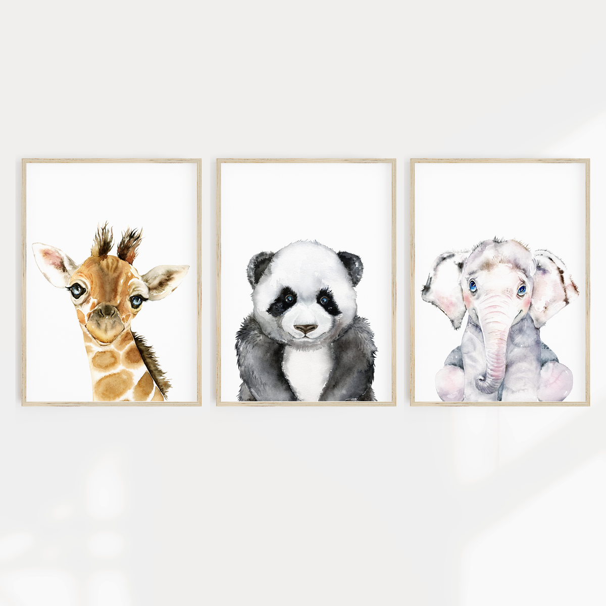 This set of three gender neutral safari animal prints includes a baby panda, giraffe and elephant. A perfect way to add the finishing touches to your baby's nursery, child's bedroom or playroom decor.