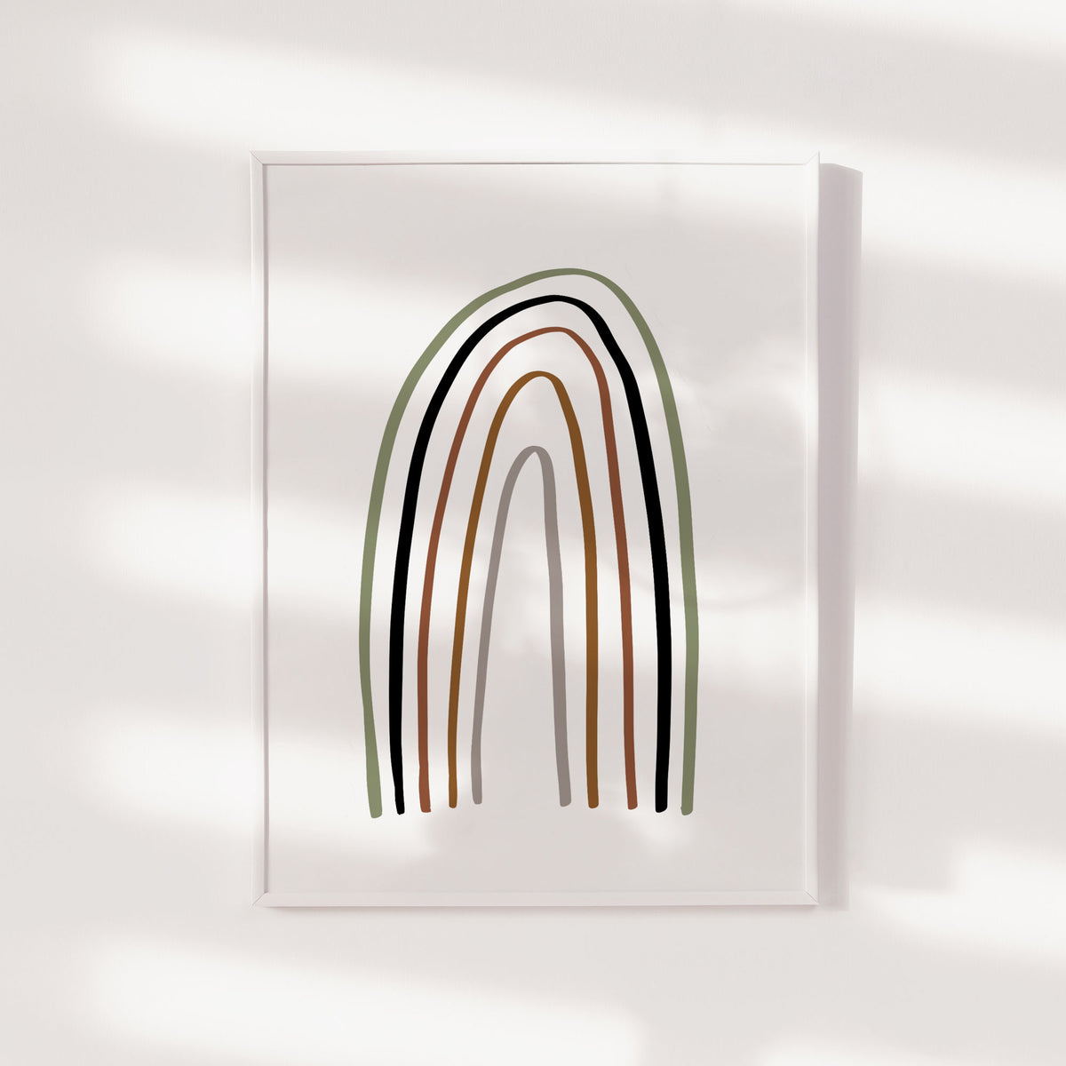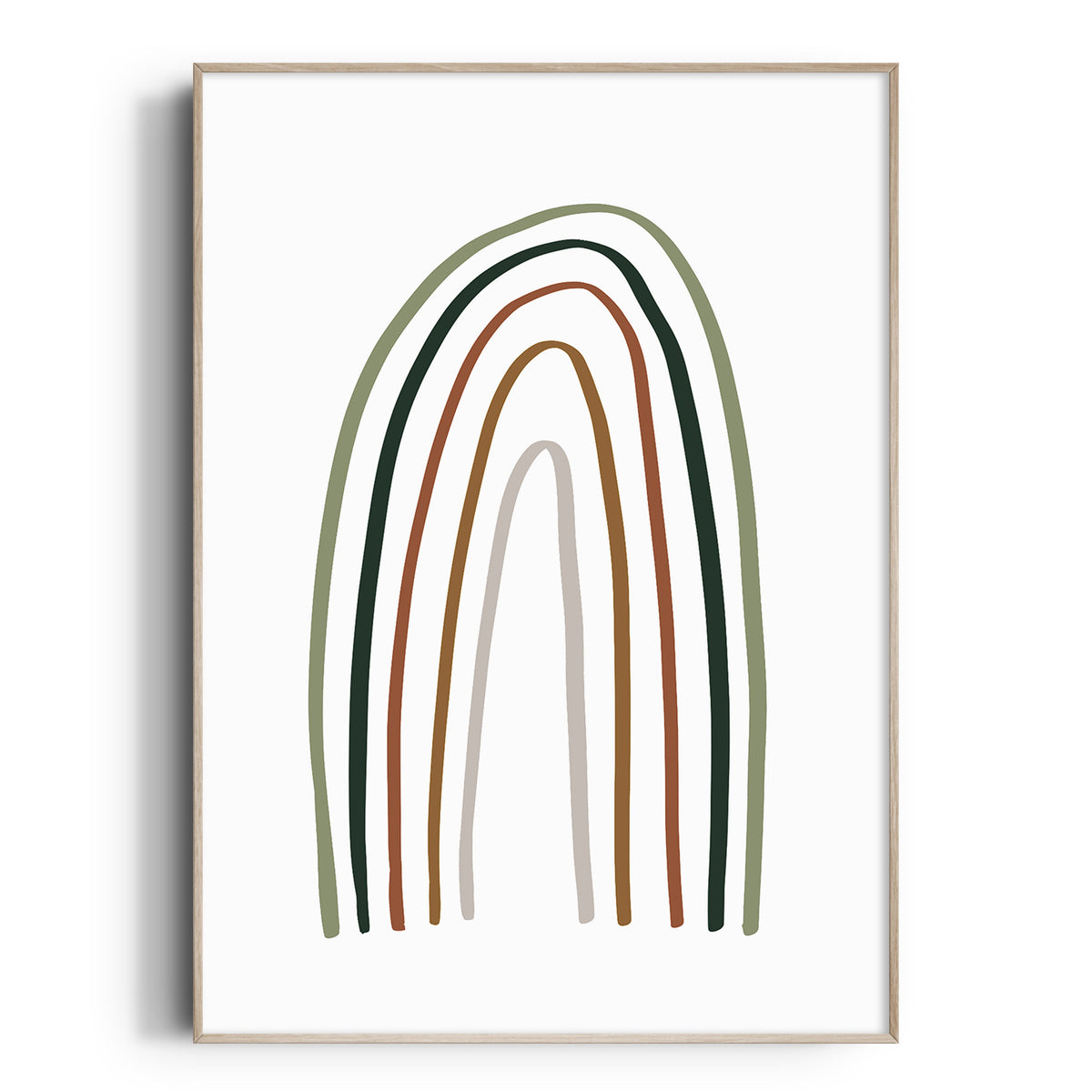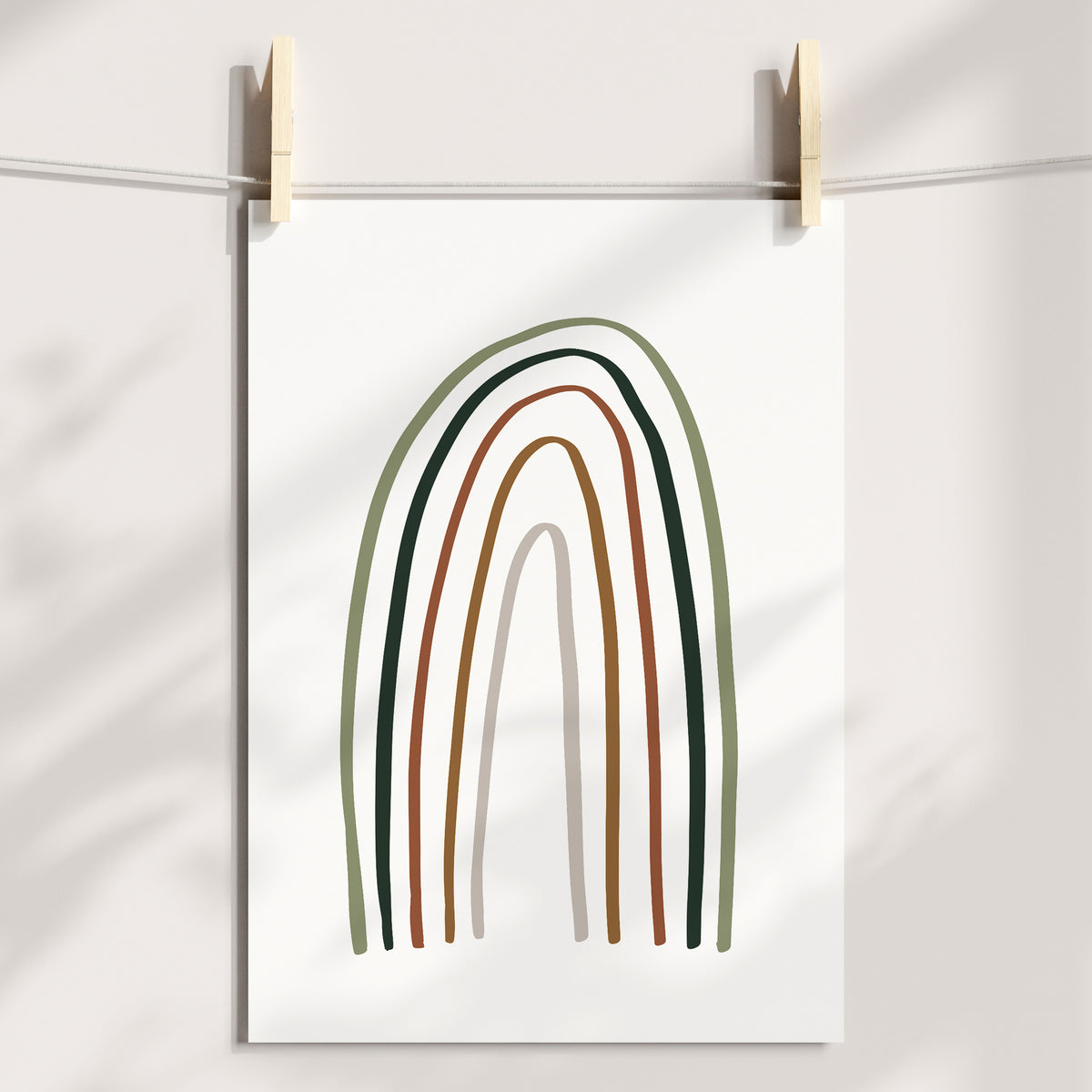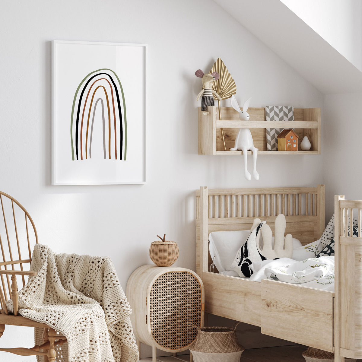 A gender neutral rainbow wall art print, featuring children's jungle & safari nursery & bedroom décor colours. A perfect new baby gift, or a great way to add the finishing touches to your own child's space.