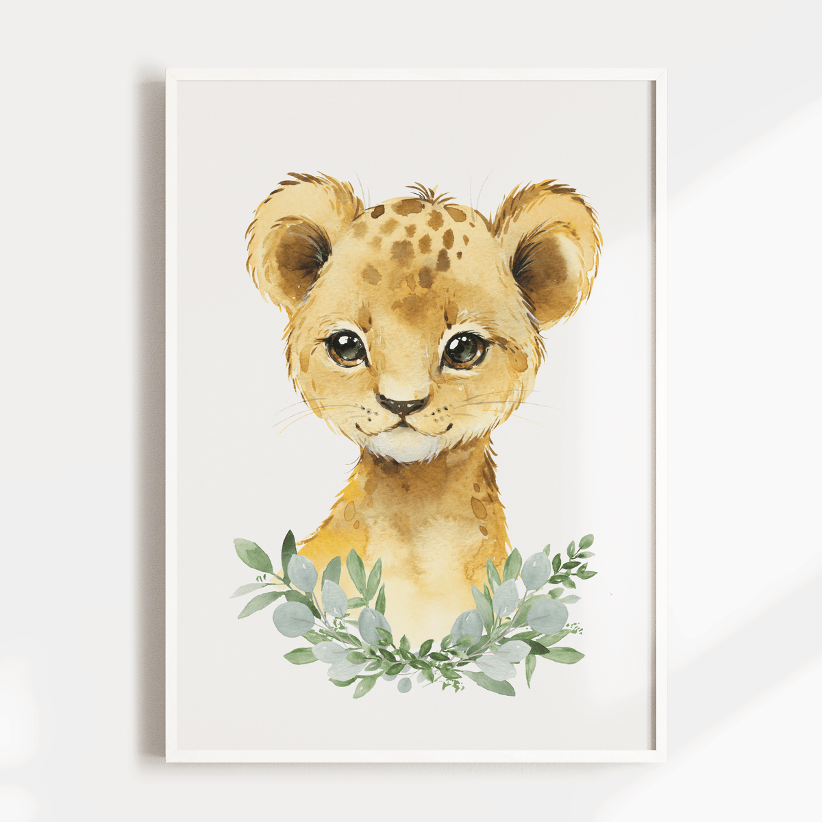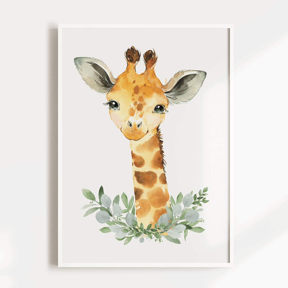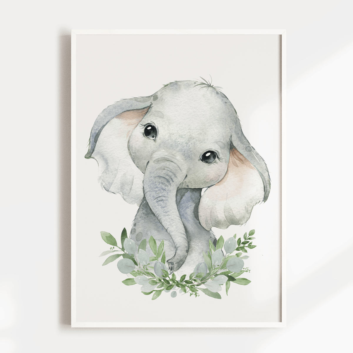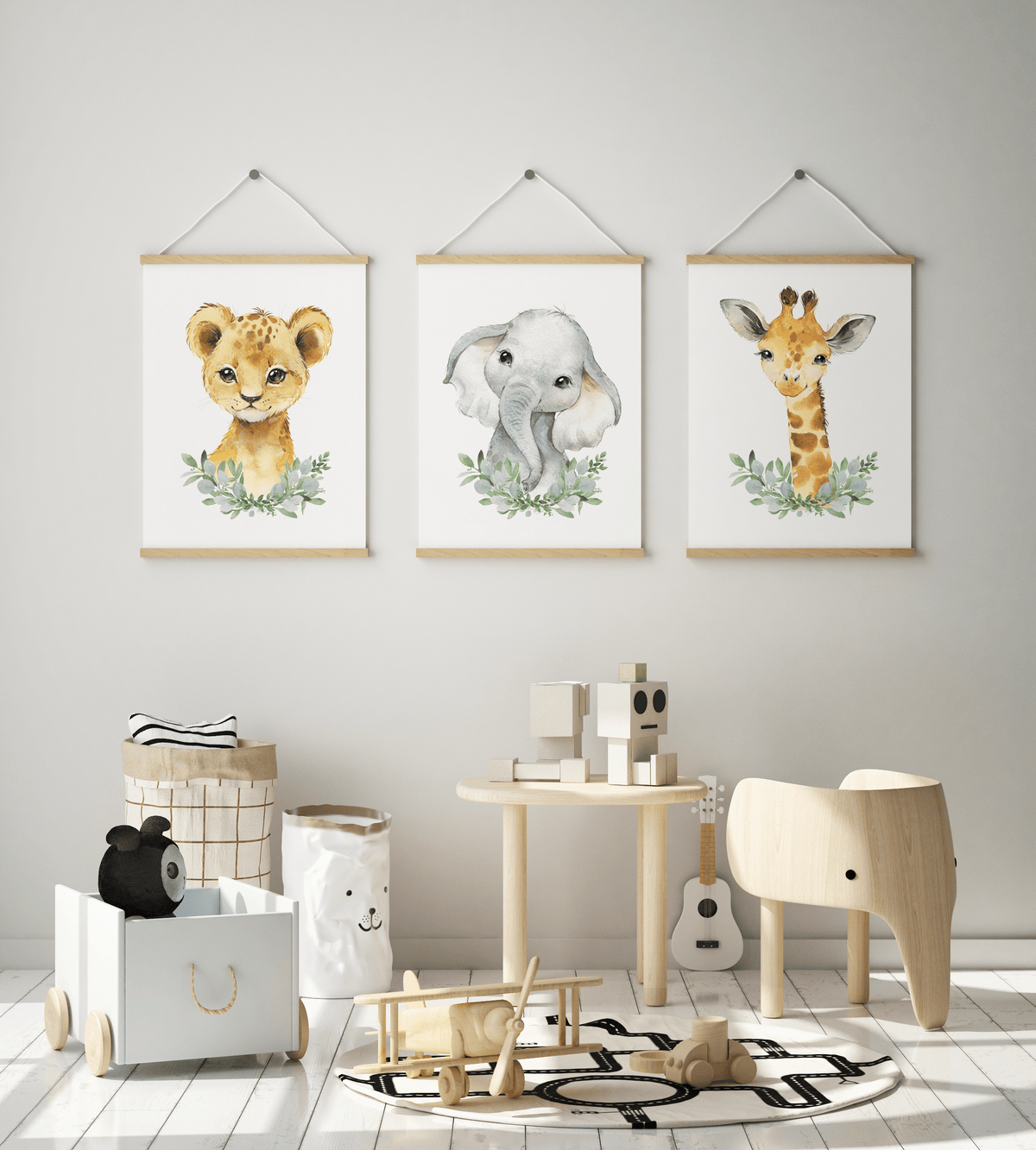 A woodland, safari nursery or bedroom wall art print set includes an elephant, giraffe and lion print.