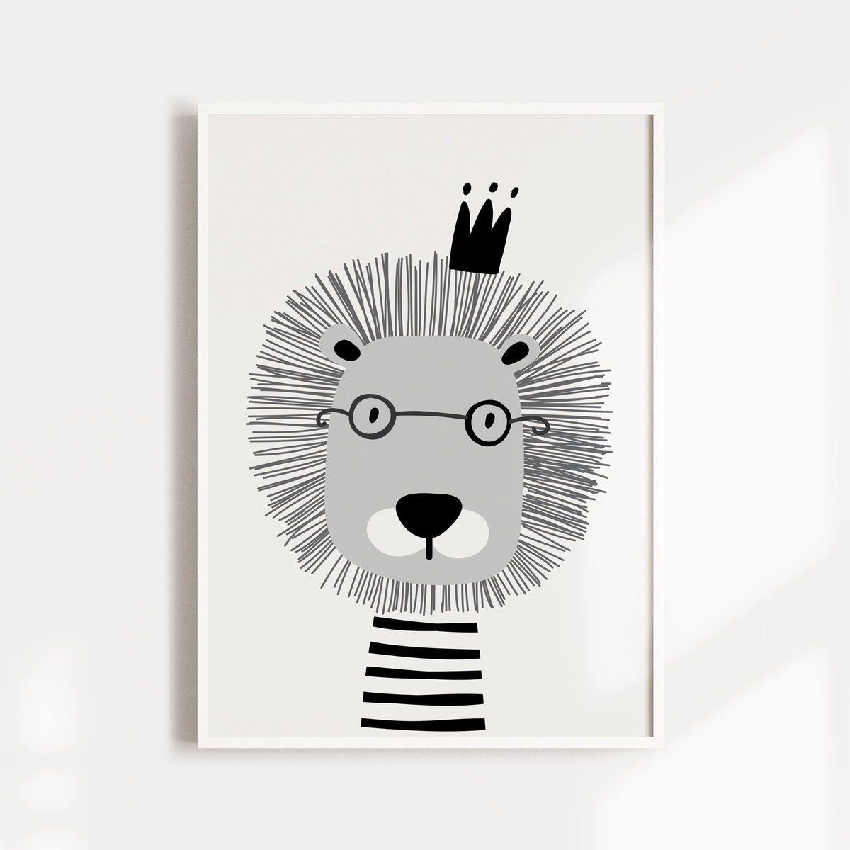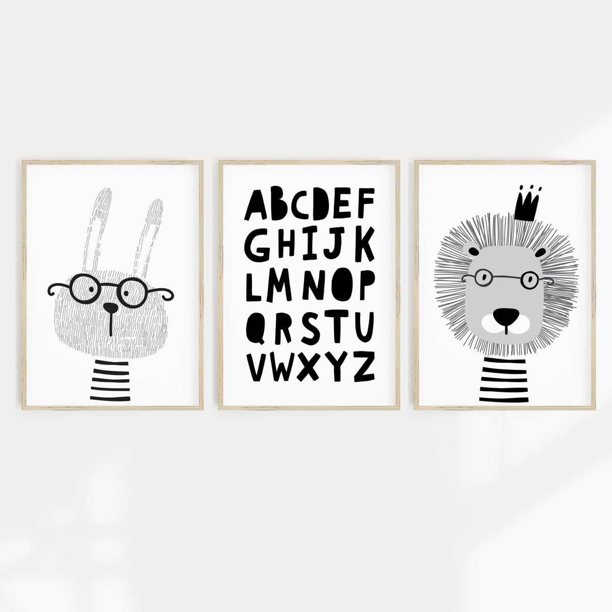 A set of three scandi, inspired bedroom wall art prints just for the boys. Featuring a bunny, lion and alphabet print.