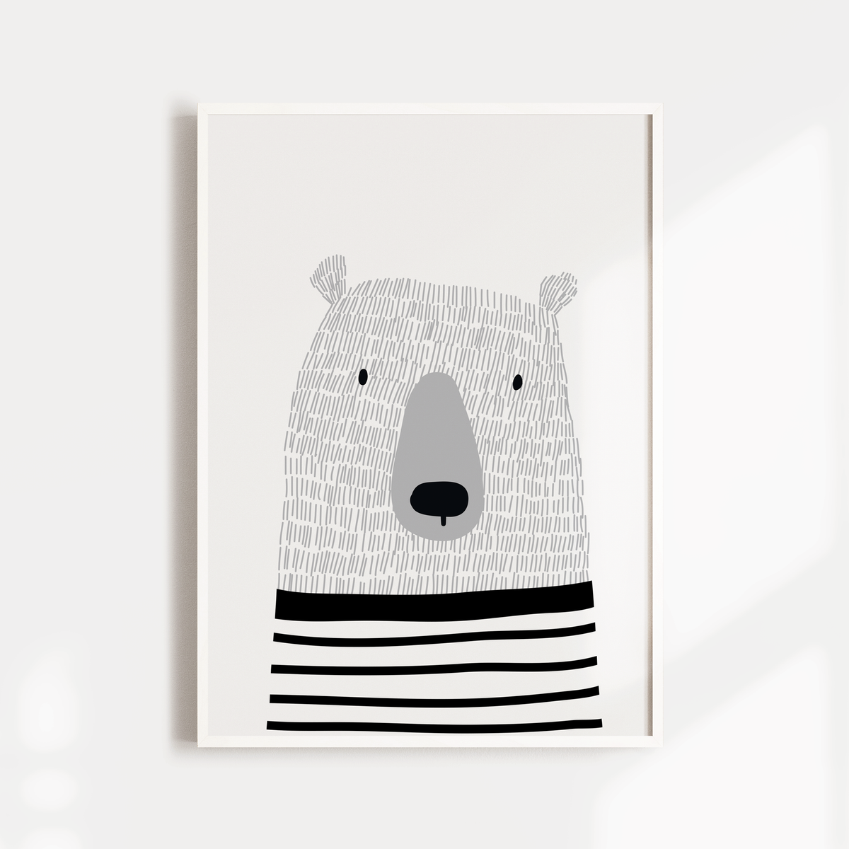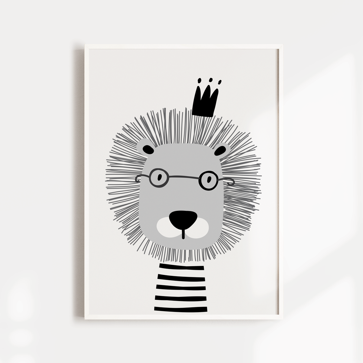 A set of three scandi, inspired bedroom wall art prints just for the boys. Featuring a lion, bear and monochrome personalised name and letter print.