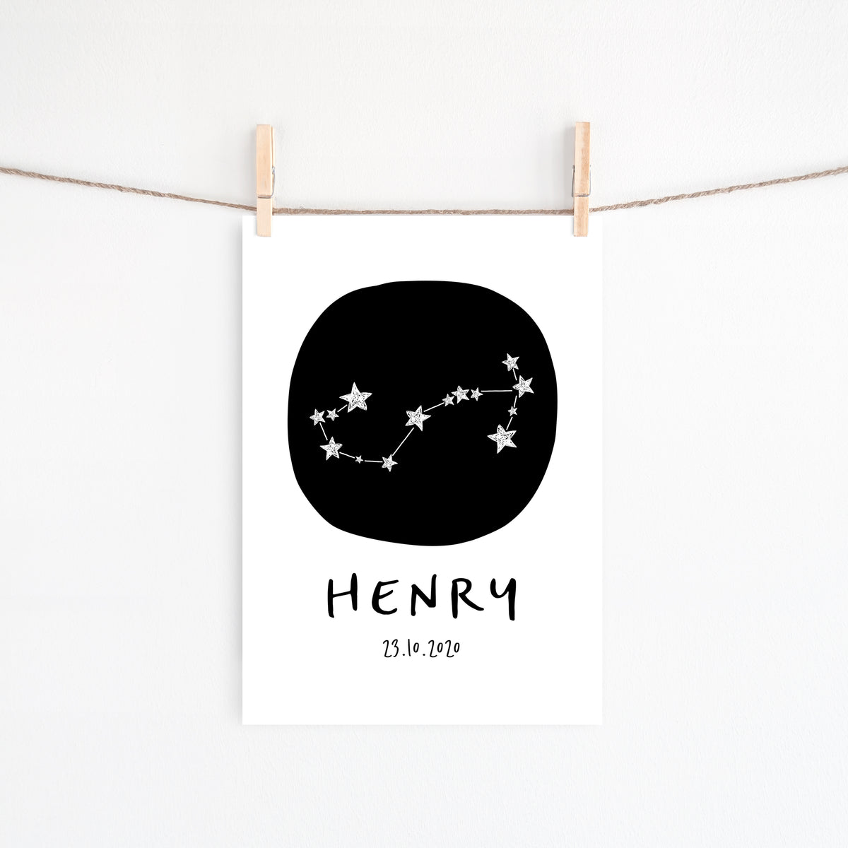Unit price perA customised name and birth date wall art print, featuring the Scorpio star sign constellation. A statement piece for the monochrome nursery or bedroom decor.
