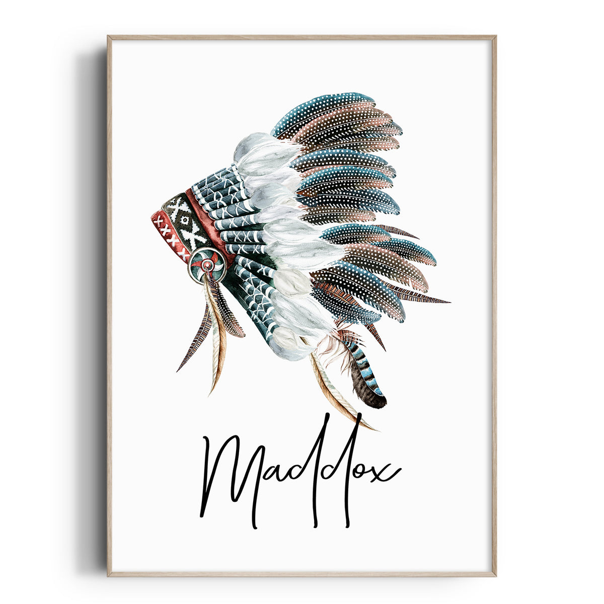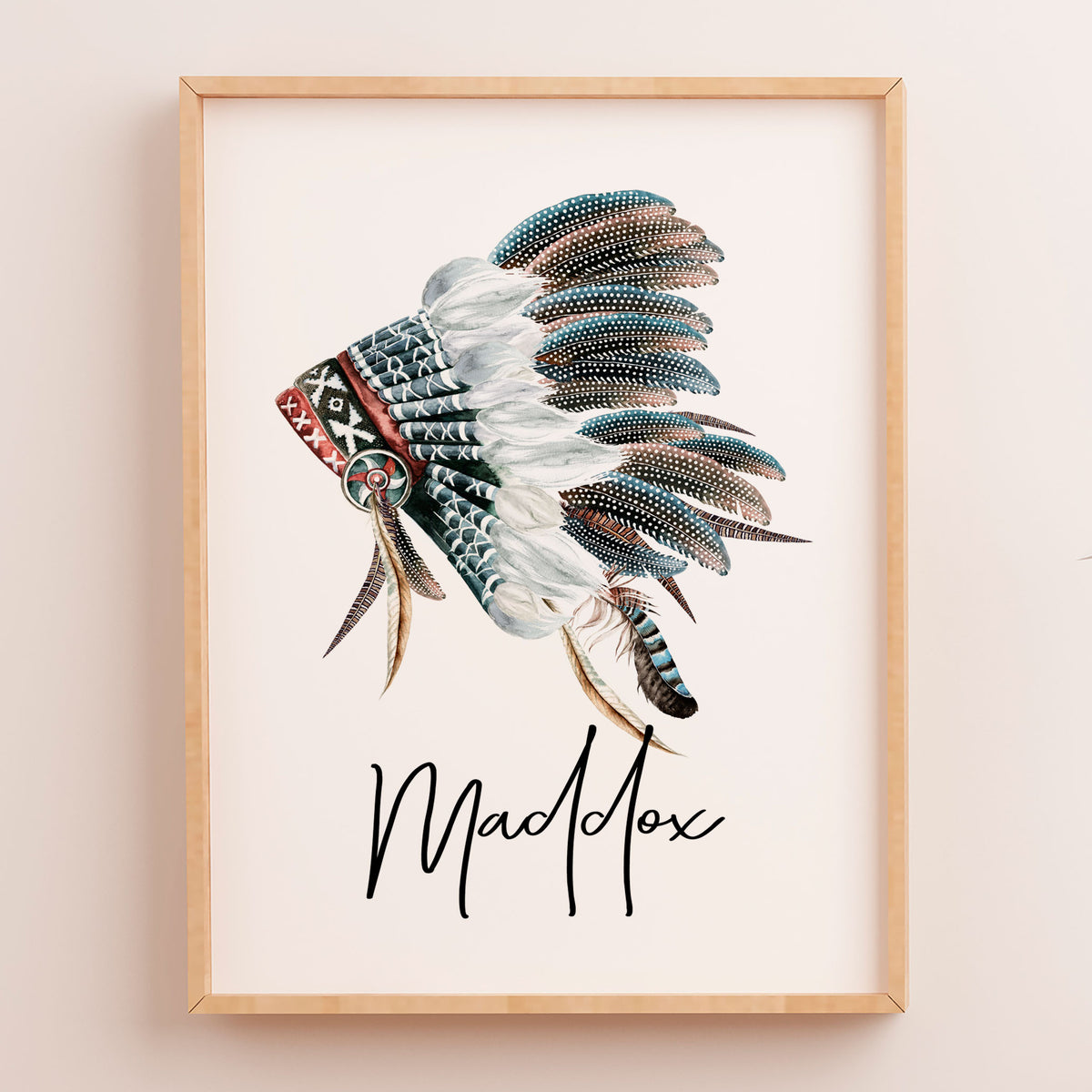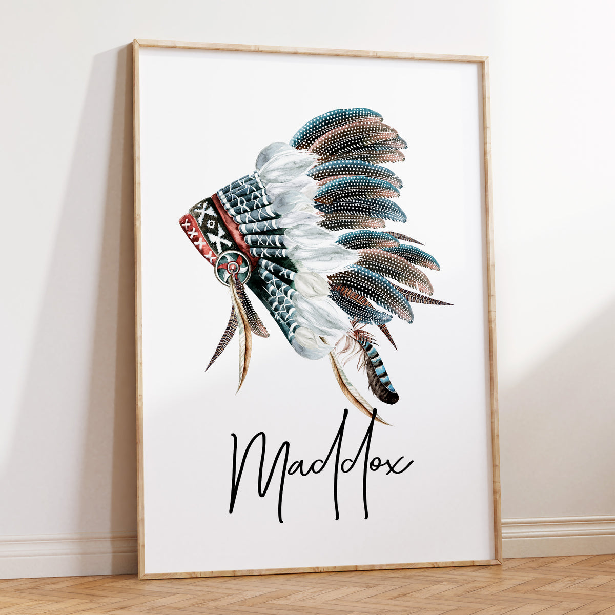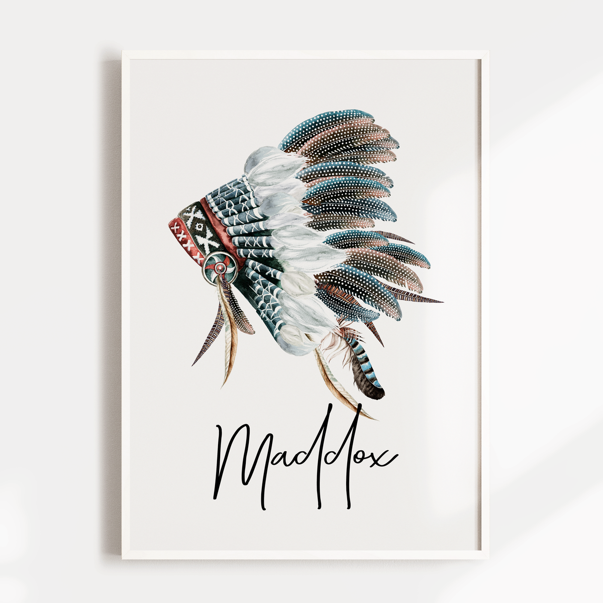 Customised Tribal Boho watercolour headdress wall art print, personalised with your child's name.