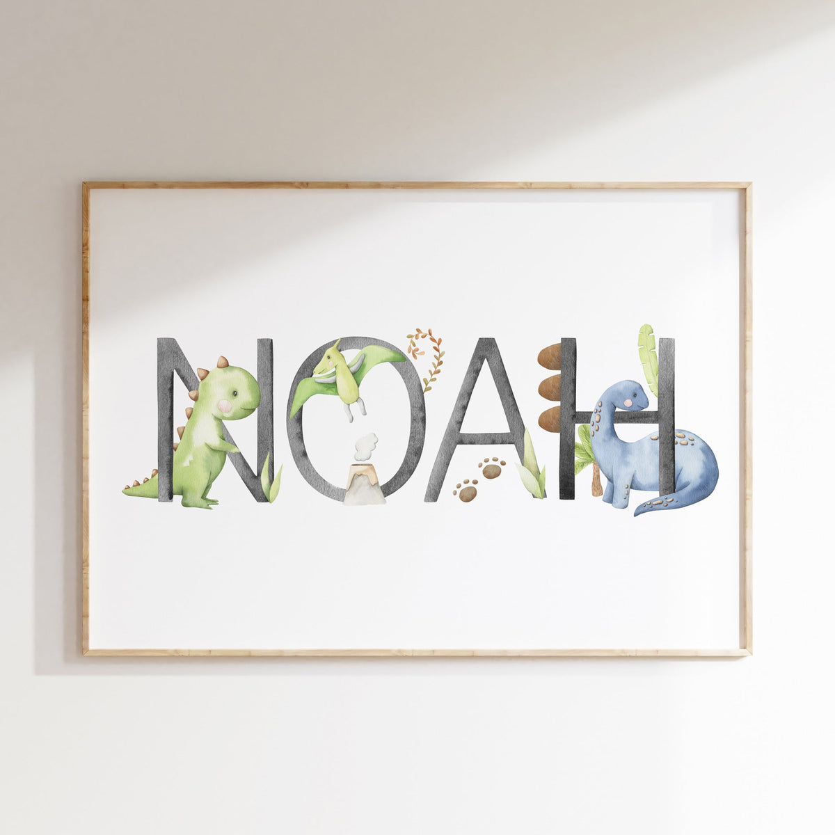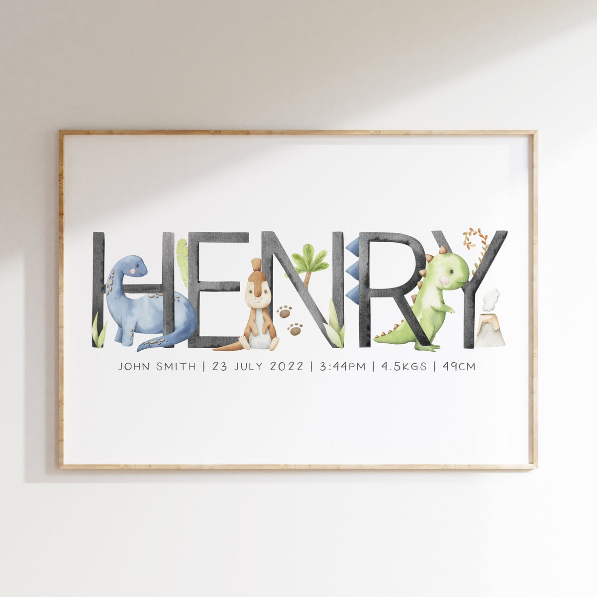 Perfect for the dinosaur or Jurassic themed nursery, this personalised baby name print is available with your choice of dinosaurs along with the option to add your little one's birth details, it makes a perfect new baby gift or add the finishing touches to your own little boy's room.