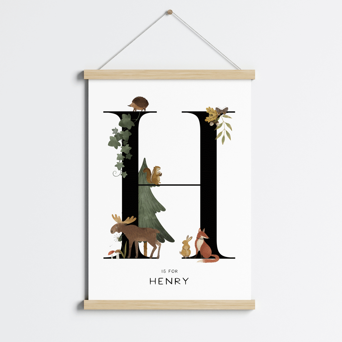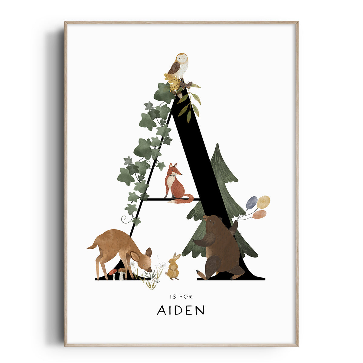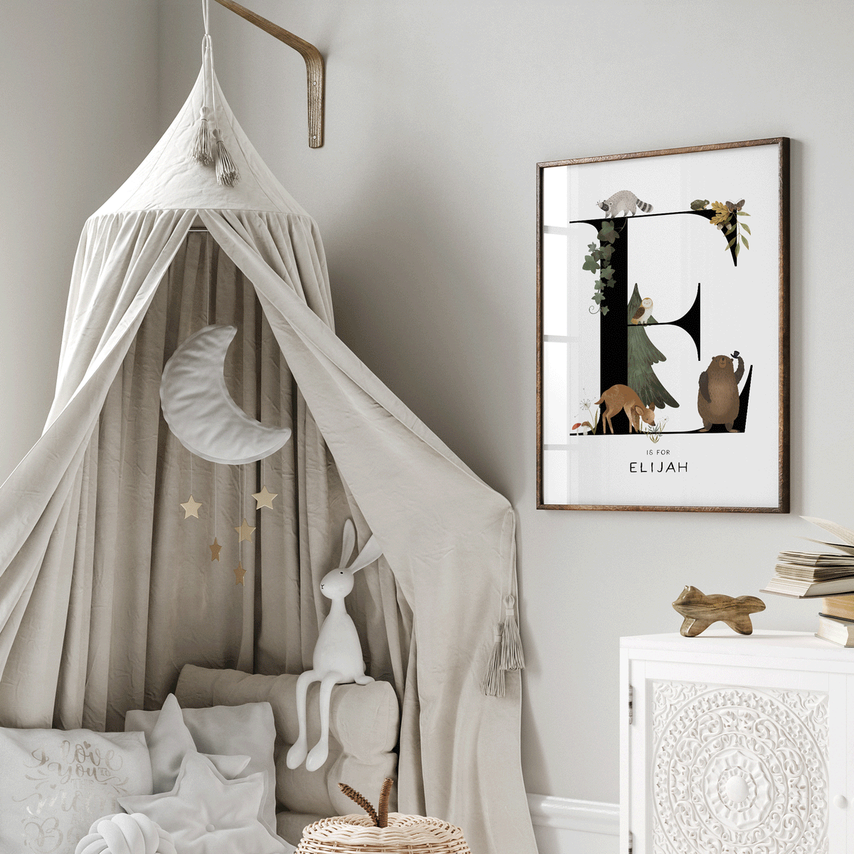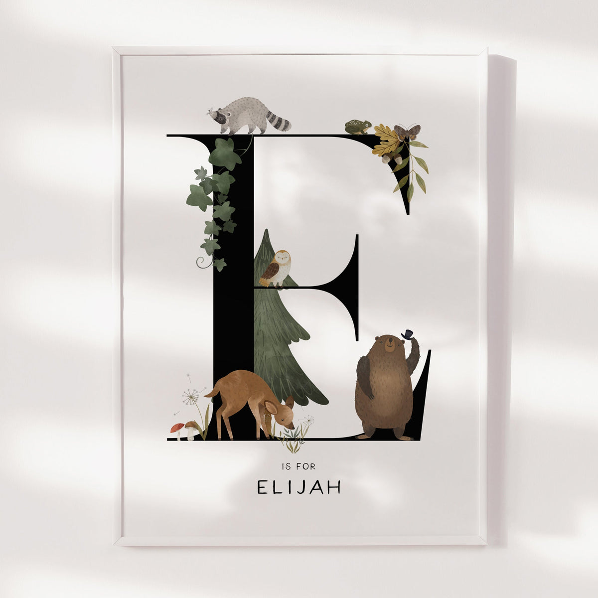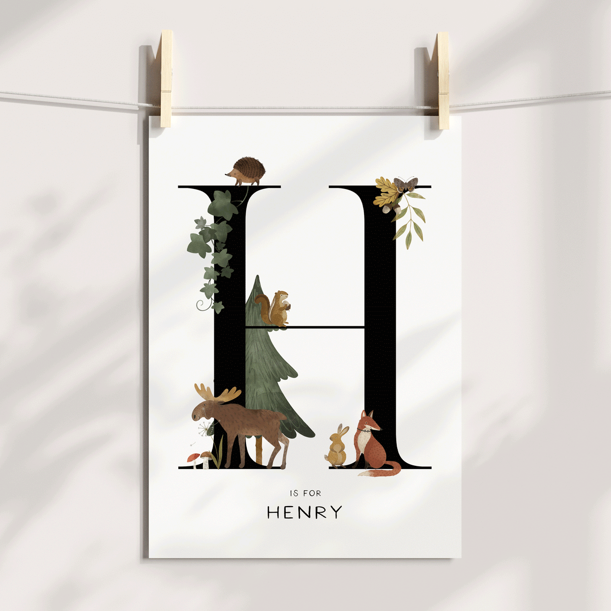 Perfect for the woodland or forest animal themed nursery, this personalised baby letter & name print is available with your choice of animals, it makes a perfect new baby gift or add the finishing touches to your own little boy's room.
