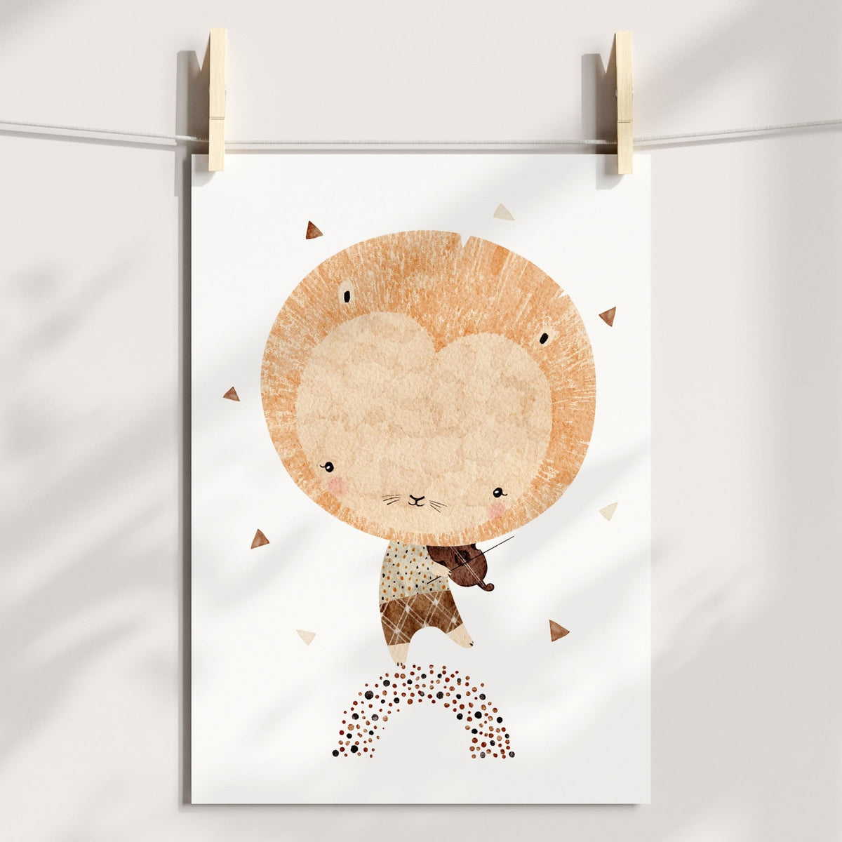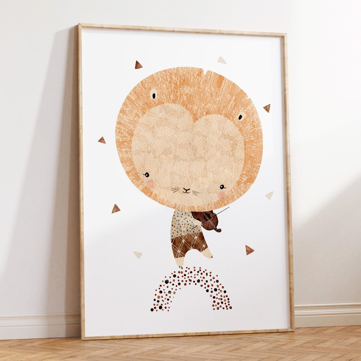 Unit price perThe perfect addition to the music or animal themed nursery, bedroom or playroom decor is this jungle jazz elephant wall art print. Featuring a safari Lion playing the violin, this print is sure to please any little music lover.