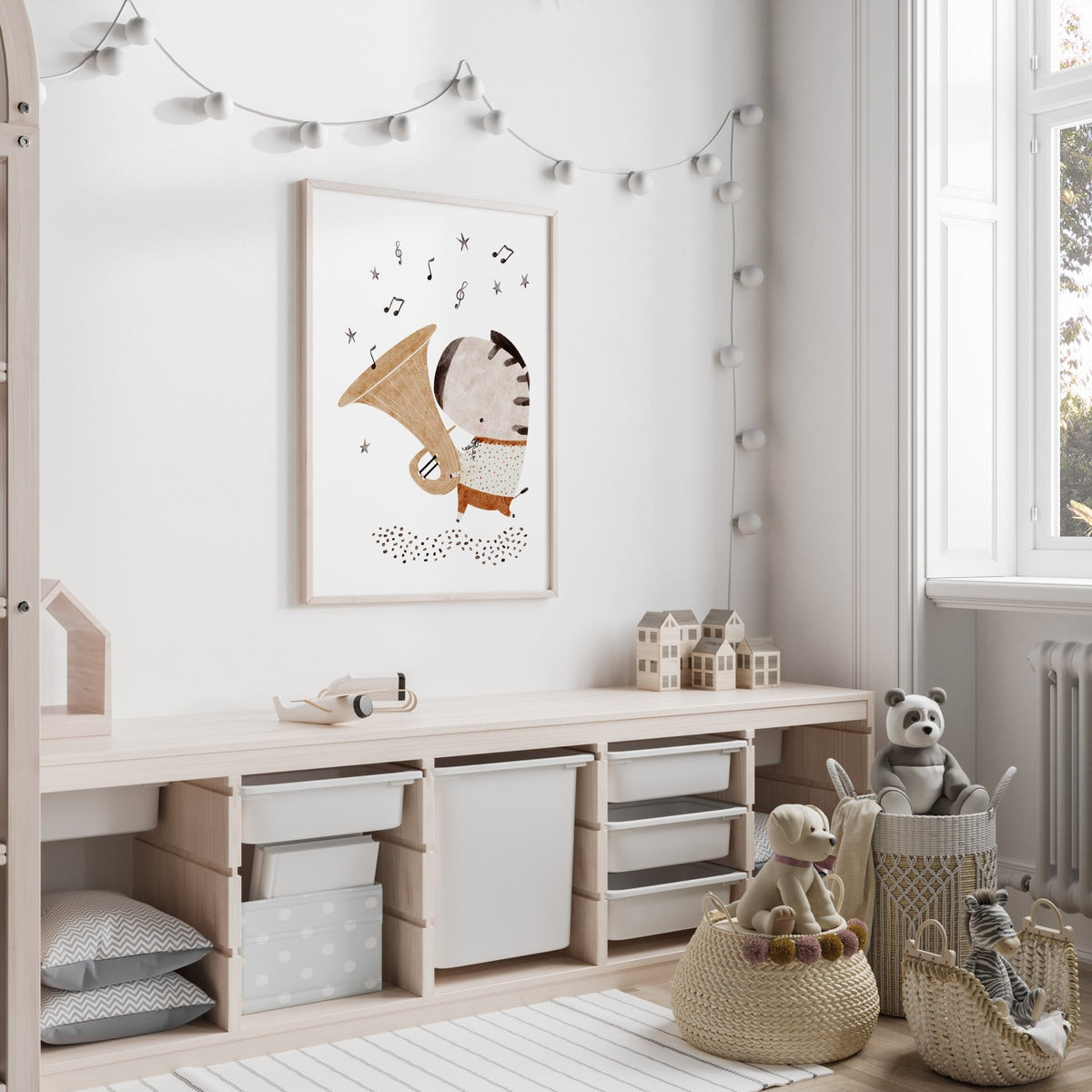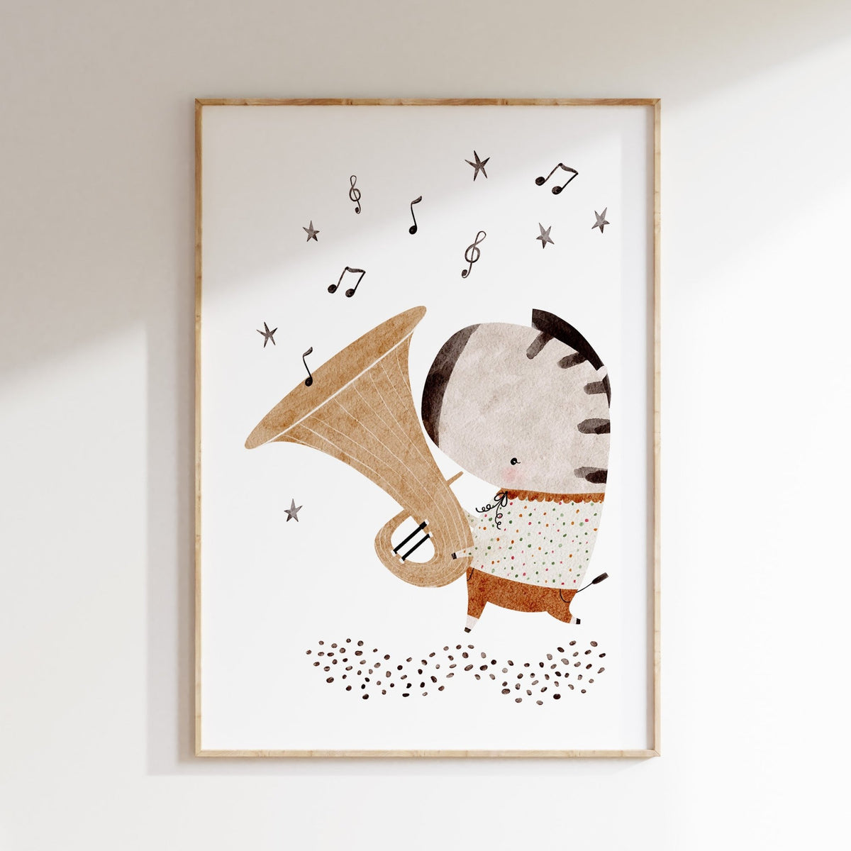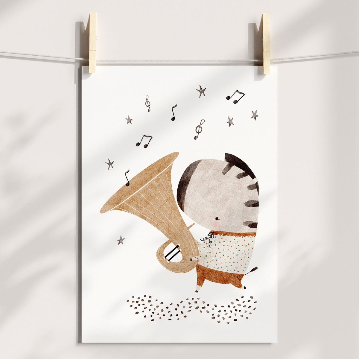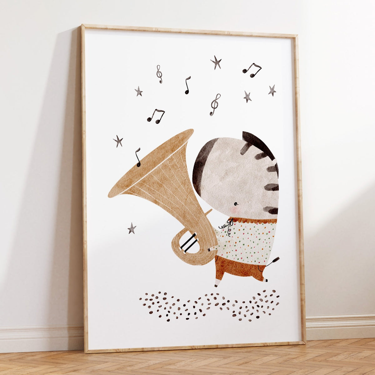 Unit price perThe perfect addition to the music or animal themed nursery, bedroom or playroom decor is this jungle jazz elephant wall art print. Featuring a safari Zebra playing the tuba, this print is sure to please any little music lover.
