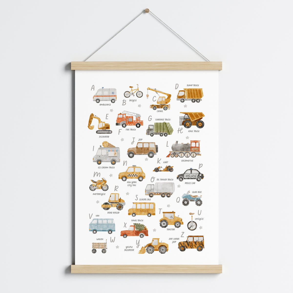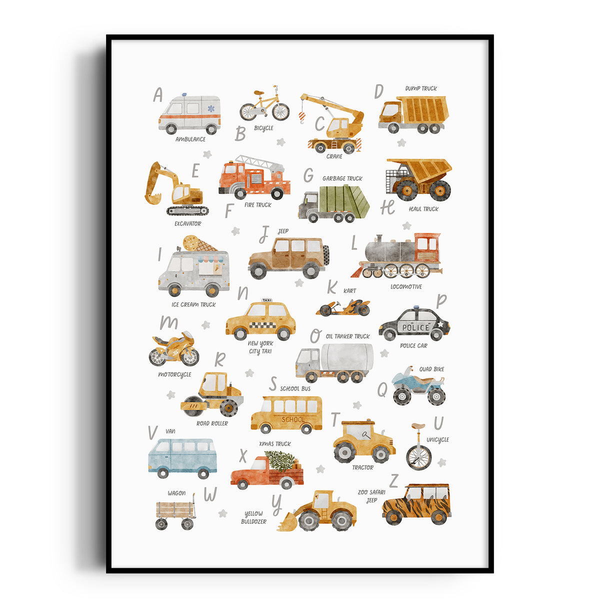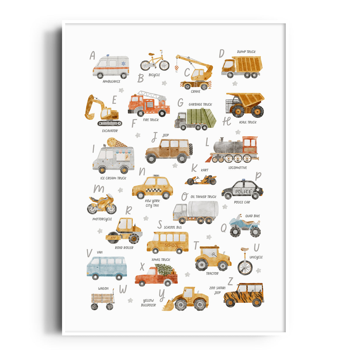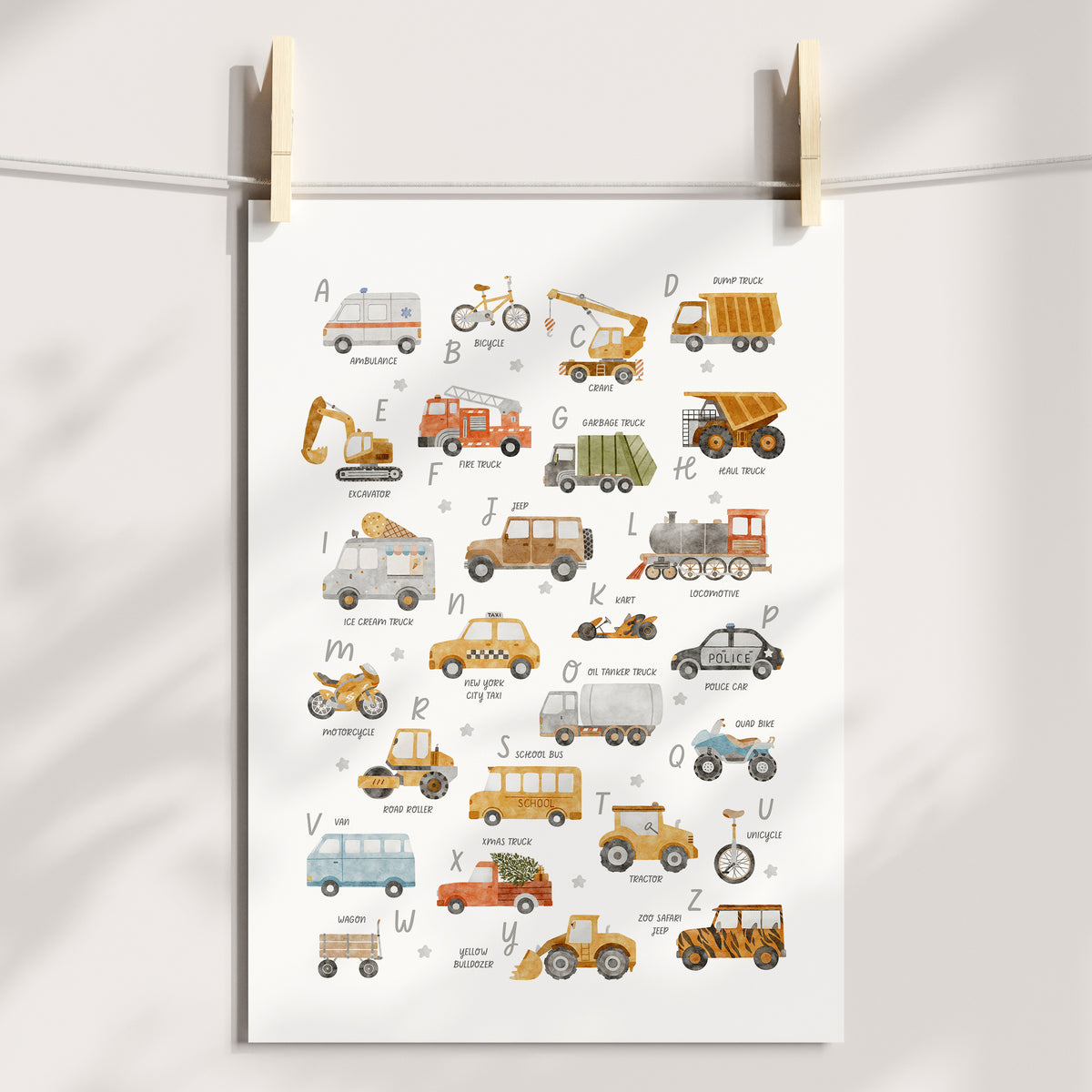 Unit price perBring the alphabet to life with this vibrant alphabet print featuring cars, trucks, and other forms of transport. Each letter of the alphabet is illustrated with a different vehicle to make learning fun and engaging.