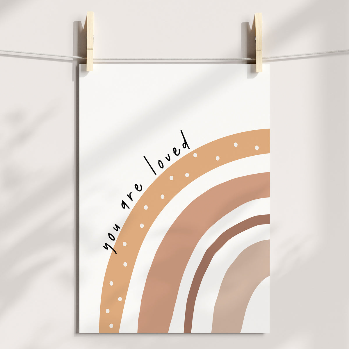 Unit price perOur 'you are loved' rainbow print is the perfect addition to your boho nursery, children's bedroom or playroom decorĀ or a perfect new baby gift in a neutral unisex colourway. Mix and match with our other prints from this collection or use as a standalone piece.