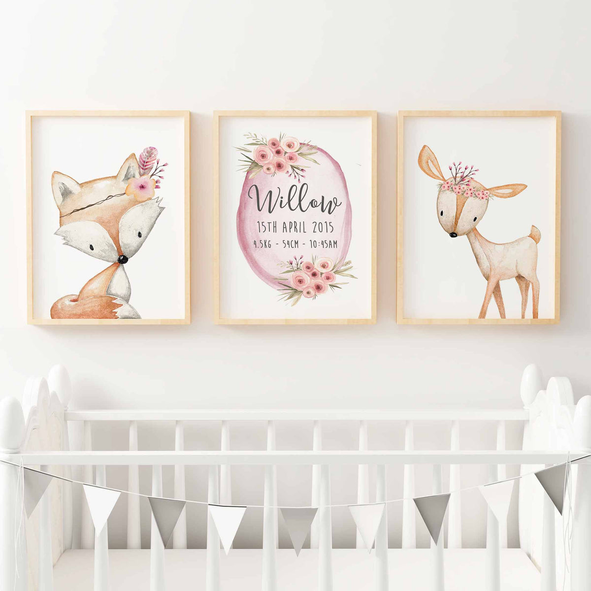 This set of three prints features a customised birth print and two boho woodland animal prints, all complimented with floral & feather accents.