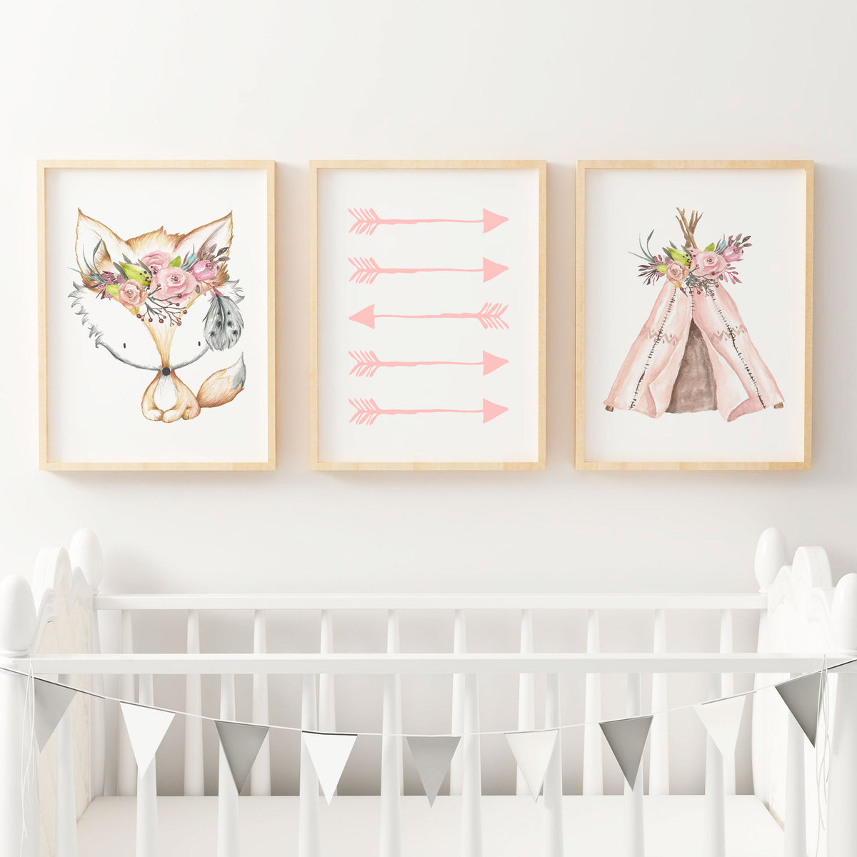 Featuring soft hints of watercolour pinks, this tribal boho woodland nursery or bedroom wall art print set includes a floral teepee print, pink arrows and a fox print.