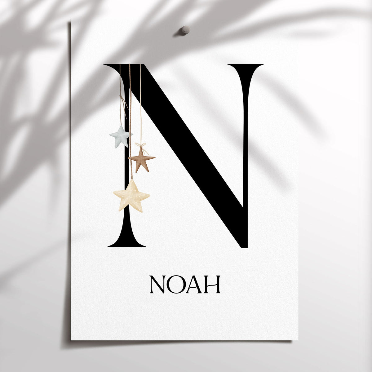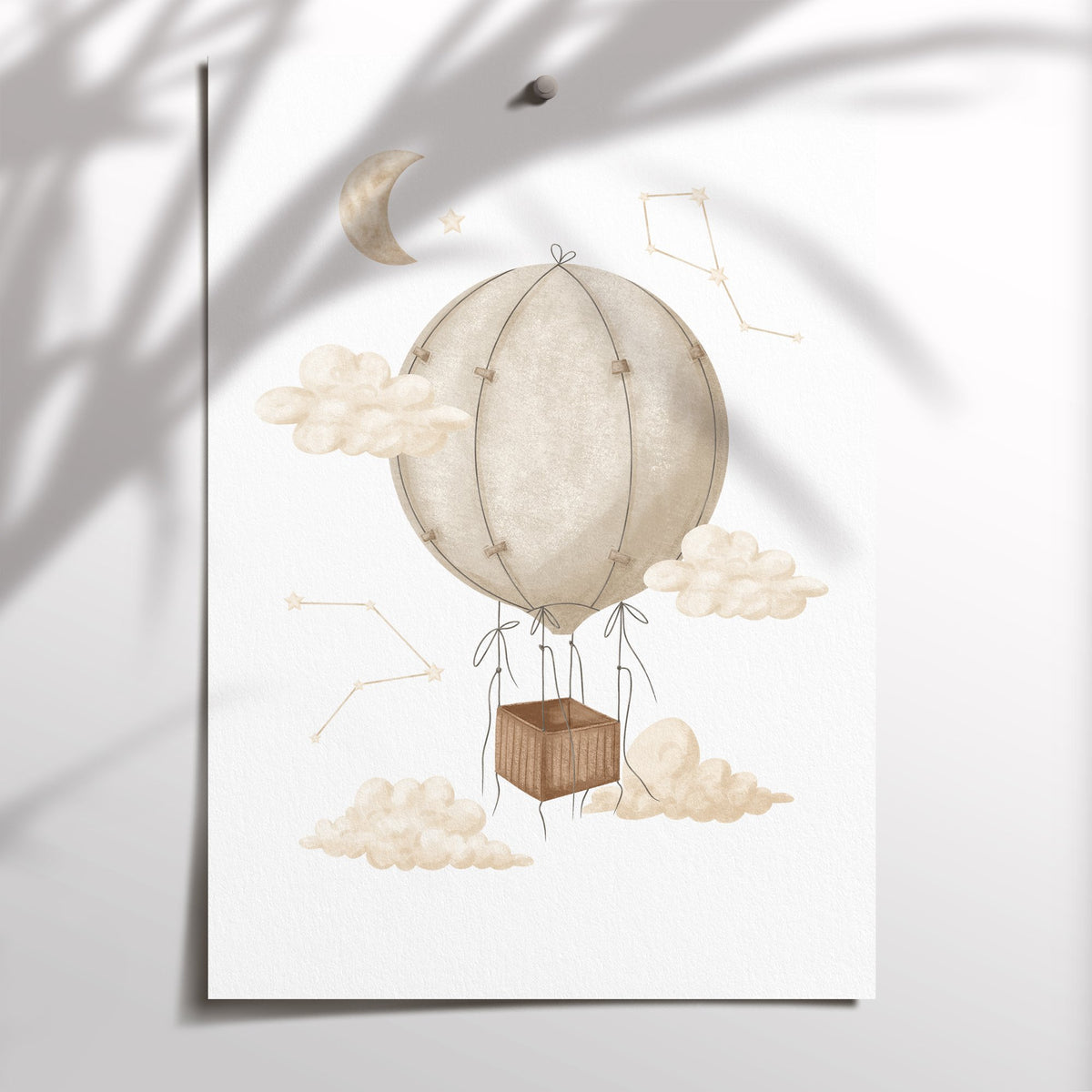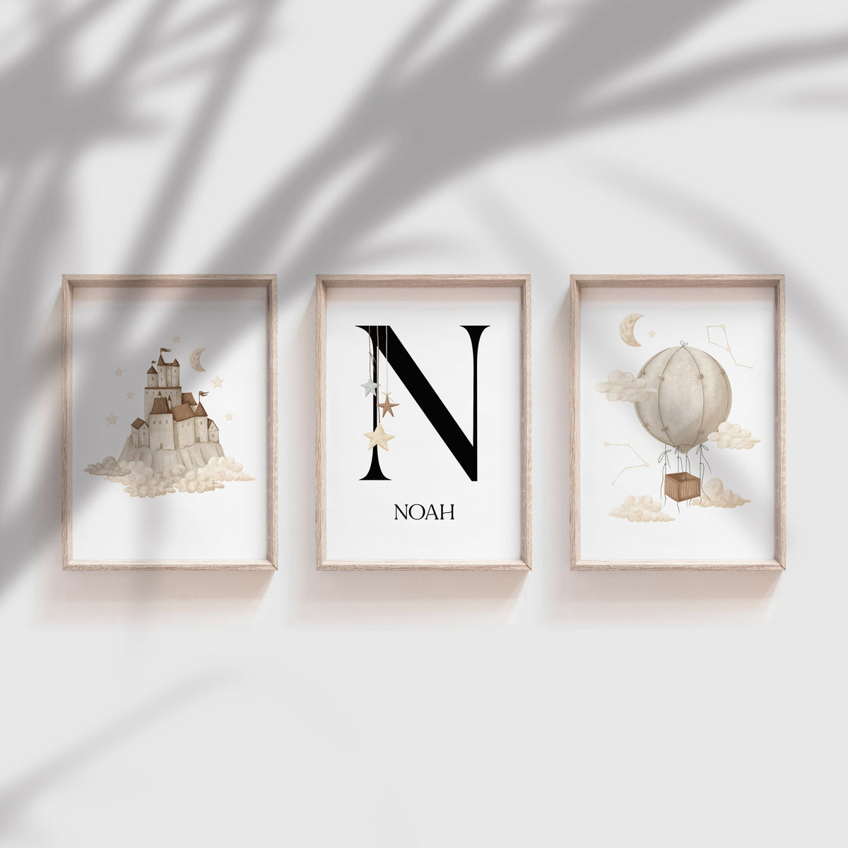 A set of three prints featuring a whimsical castle, hot air balloon and a star name & initial print. A perfect new baby boy gift or a great way to add the finishing touches to your own child's boho nursery, playroom or bedroom space.