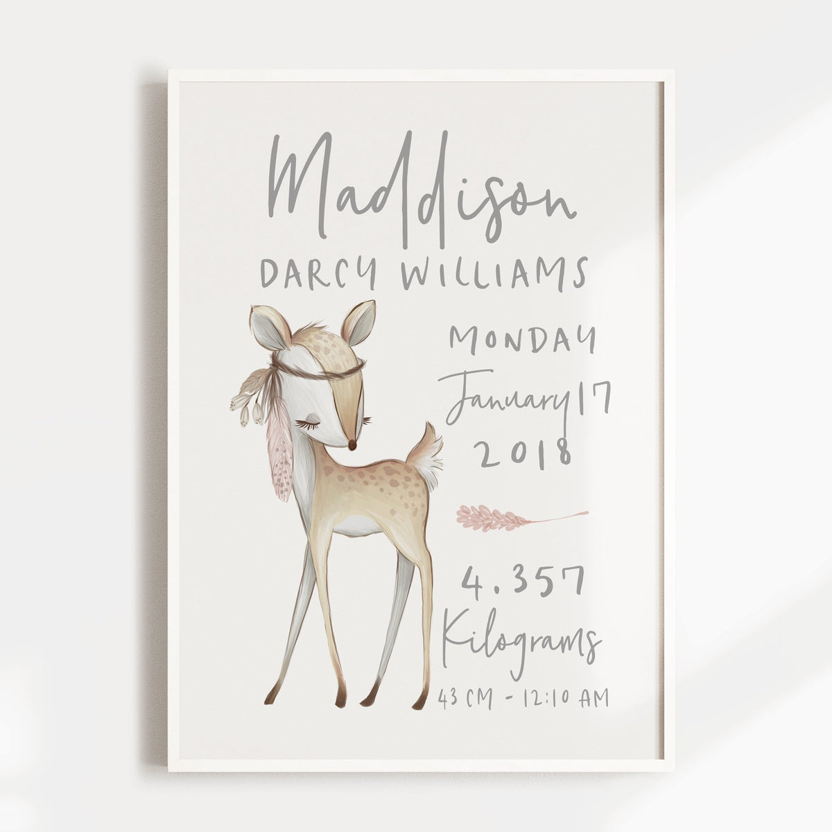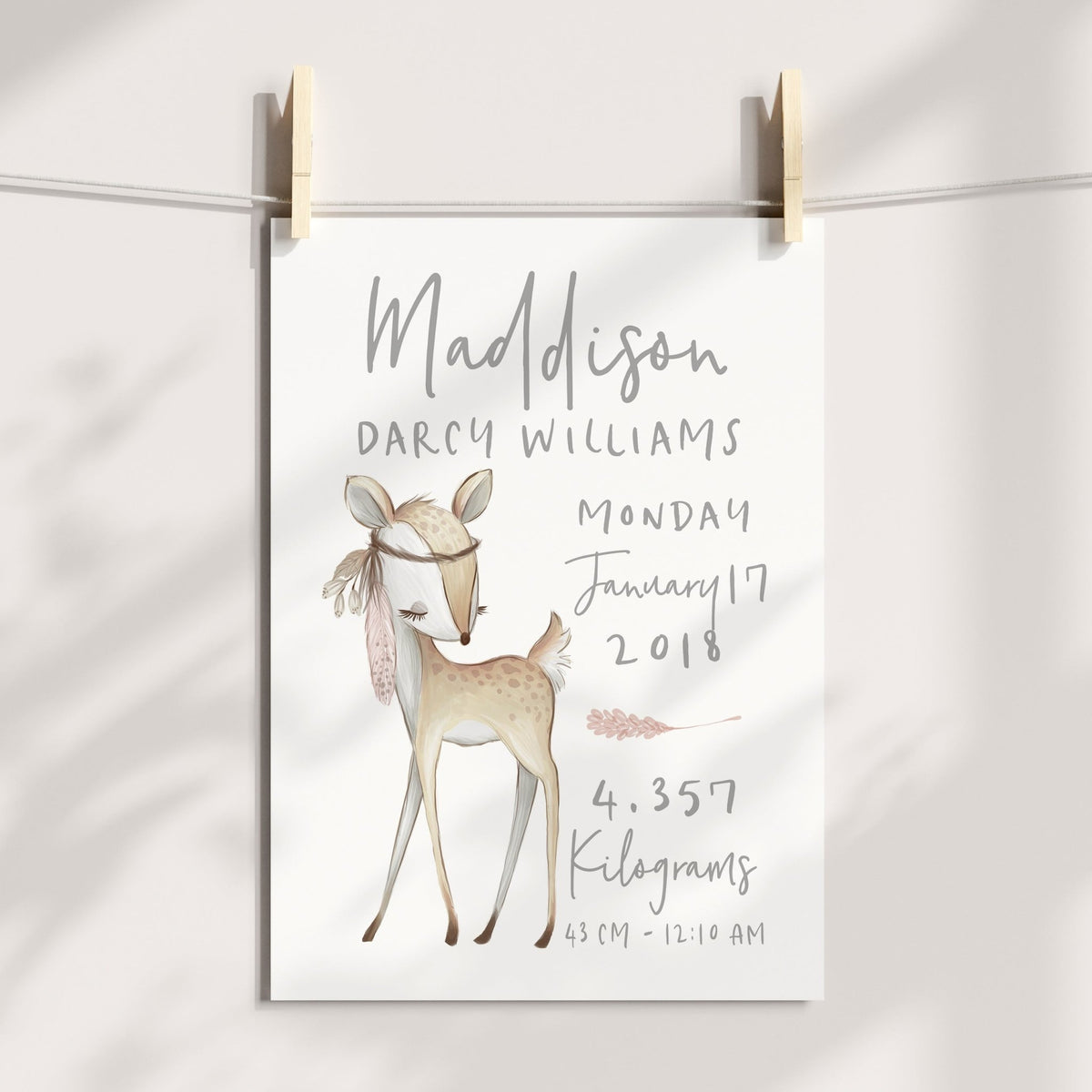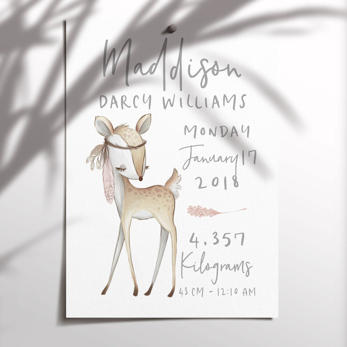 Unit price perThis beautiful Boho Woodland Deer Birth Print makes the perfect new baby gift. Personalized with the baby's birth details, this boho nursery wall art is an ideal way to decorate a nursery. Printed on high quality archival paper for long-lasting beauty.